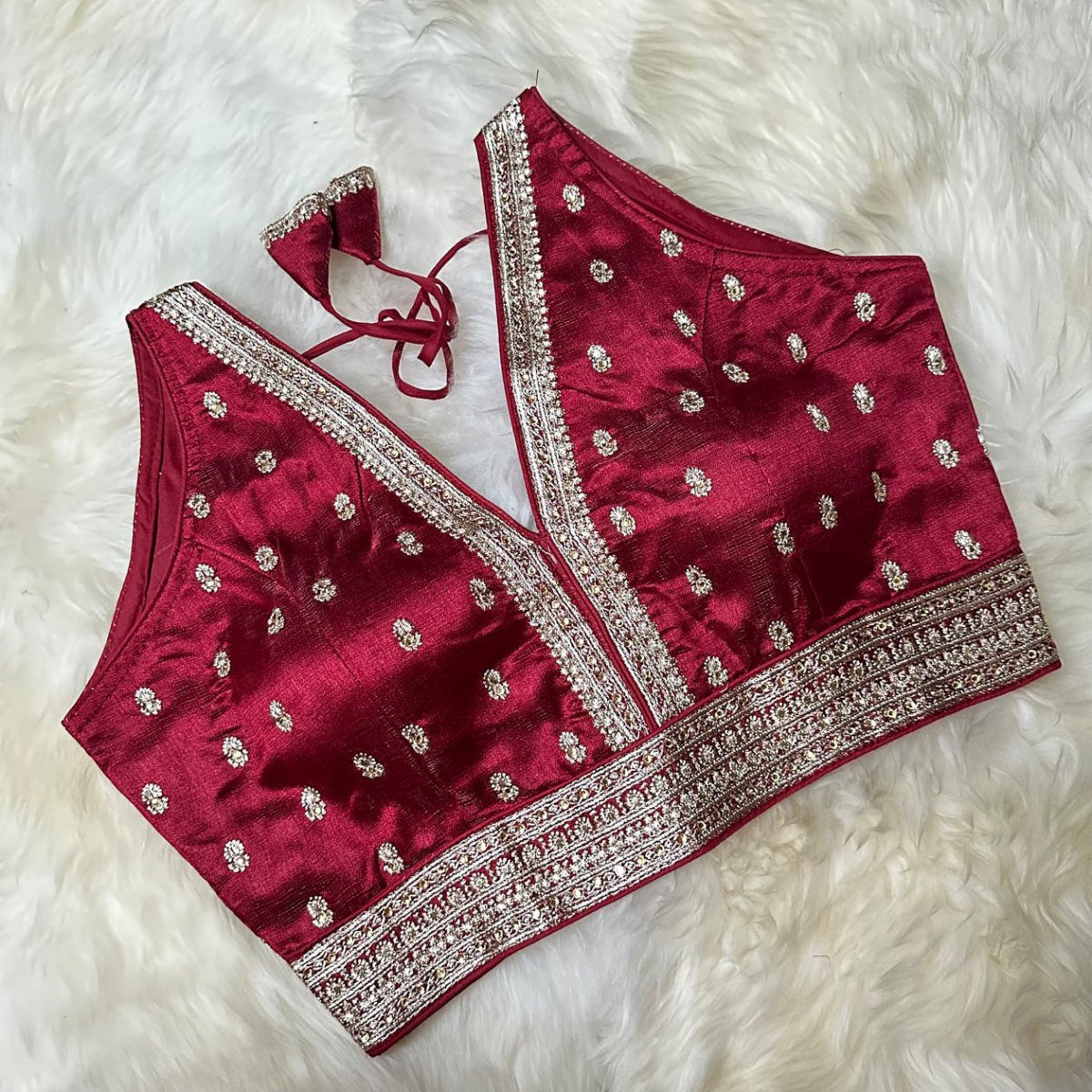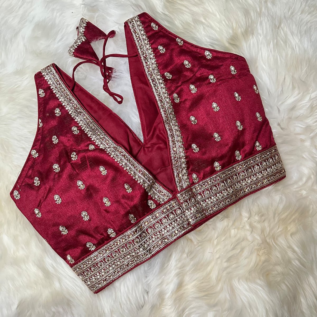 Maroon Silk Blouse with Elegant Embroidery & Stone Embellishments – Adjustable Fit (32 to 36)