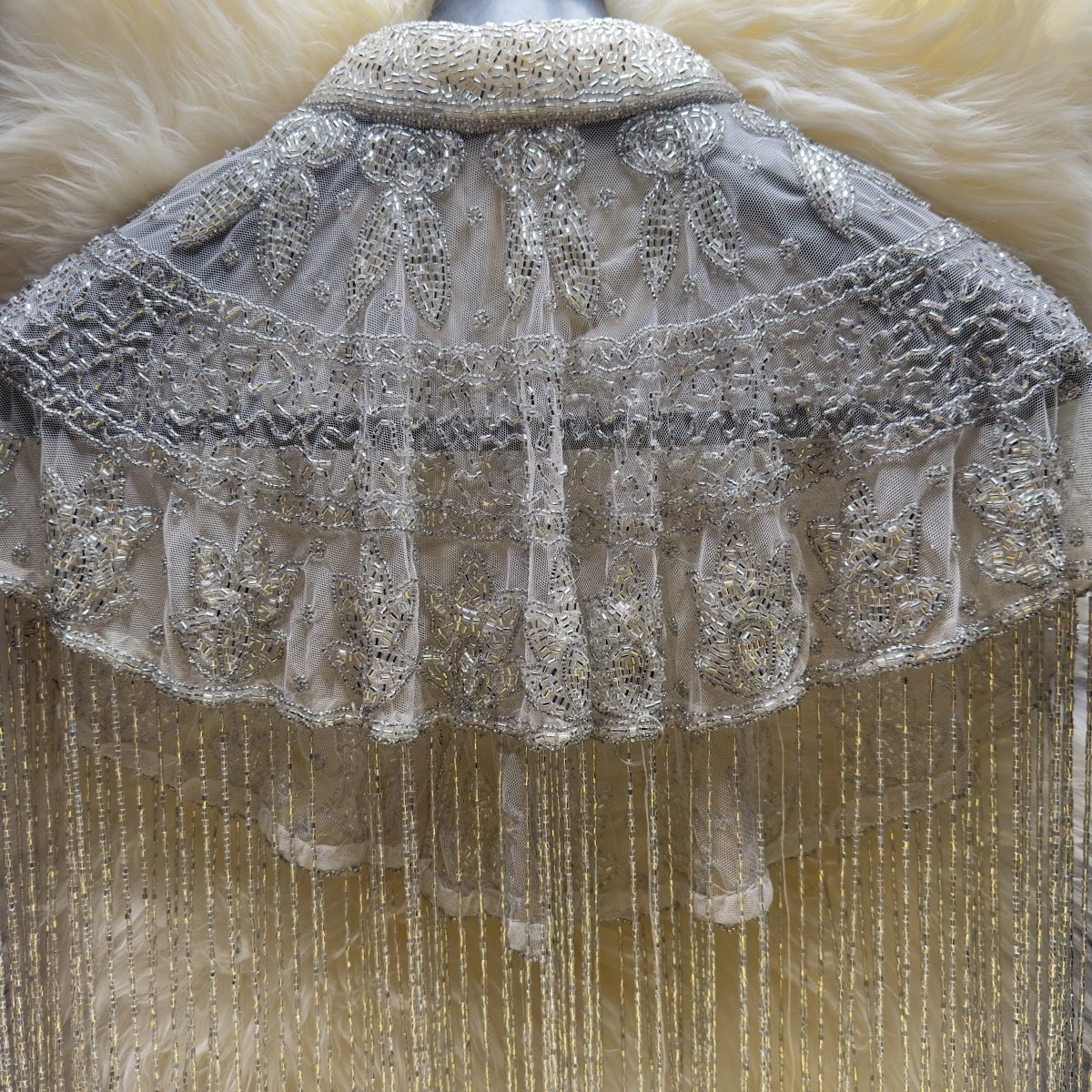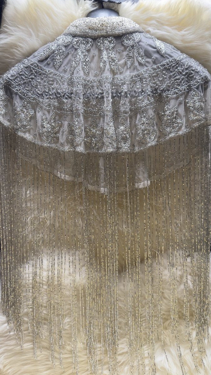 Add an air of grandeur to your attire with this Royal Silver Handcrafted Cape. Featuring breathtaking hand embroidery adorned with silver beads and sequins, this cape is a timeless piece perfect for those who love to make a statement. The delicate craftsmanship and sheer fabric create an ethereal look, while the cascading tassels add elegance and flair. This exquisite cape is free size, designed to effortlessly drape over any outfit, making it ideal for weddings, parties, and special occasions. Elevate your style with this luxurious piece that pairs beautifully with sarees, gowns, and lehengas.