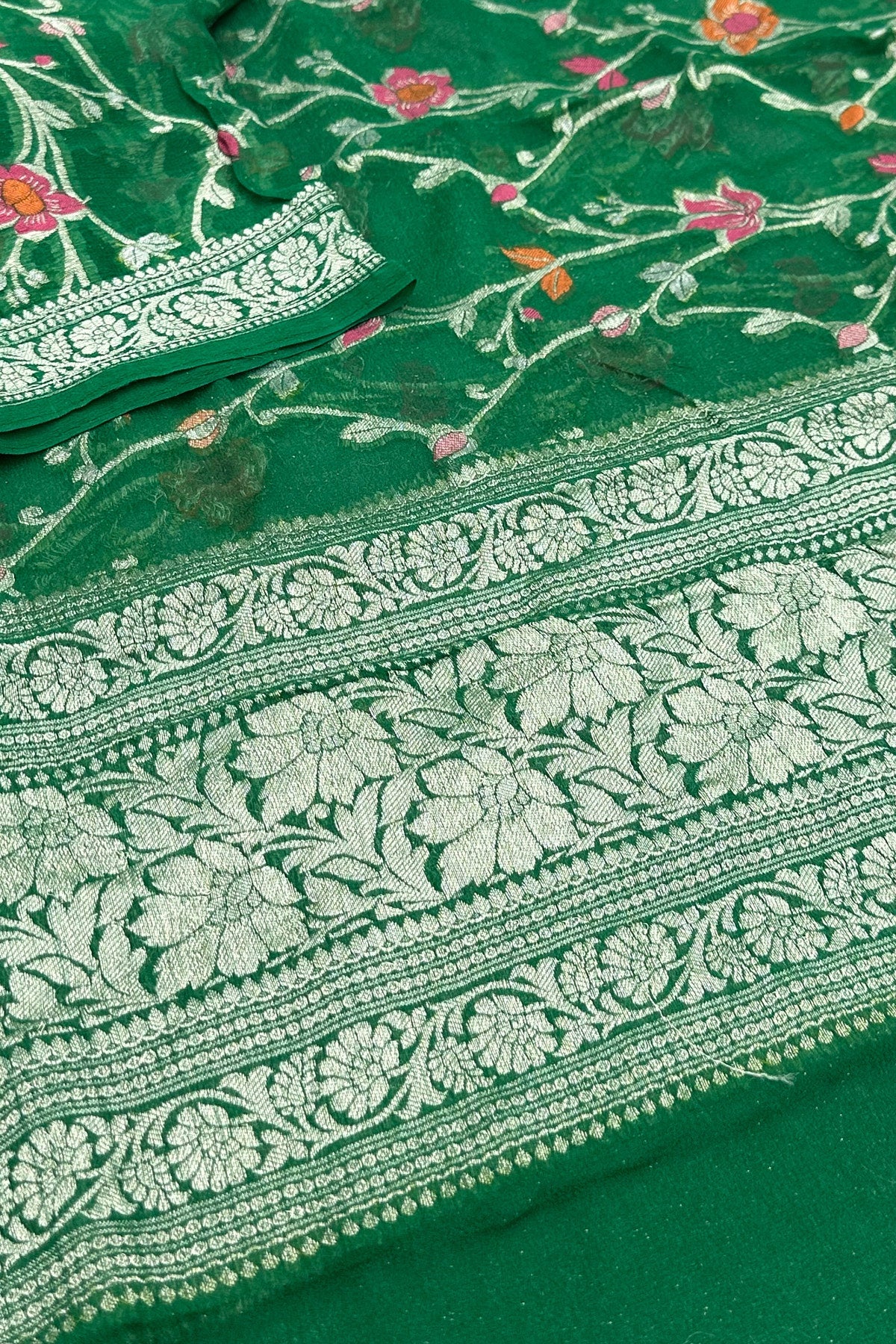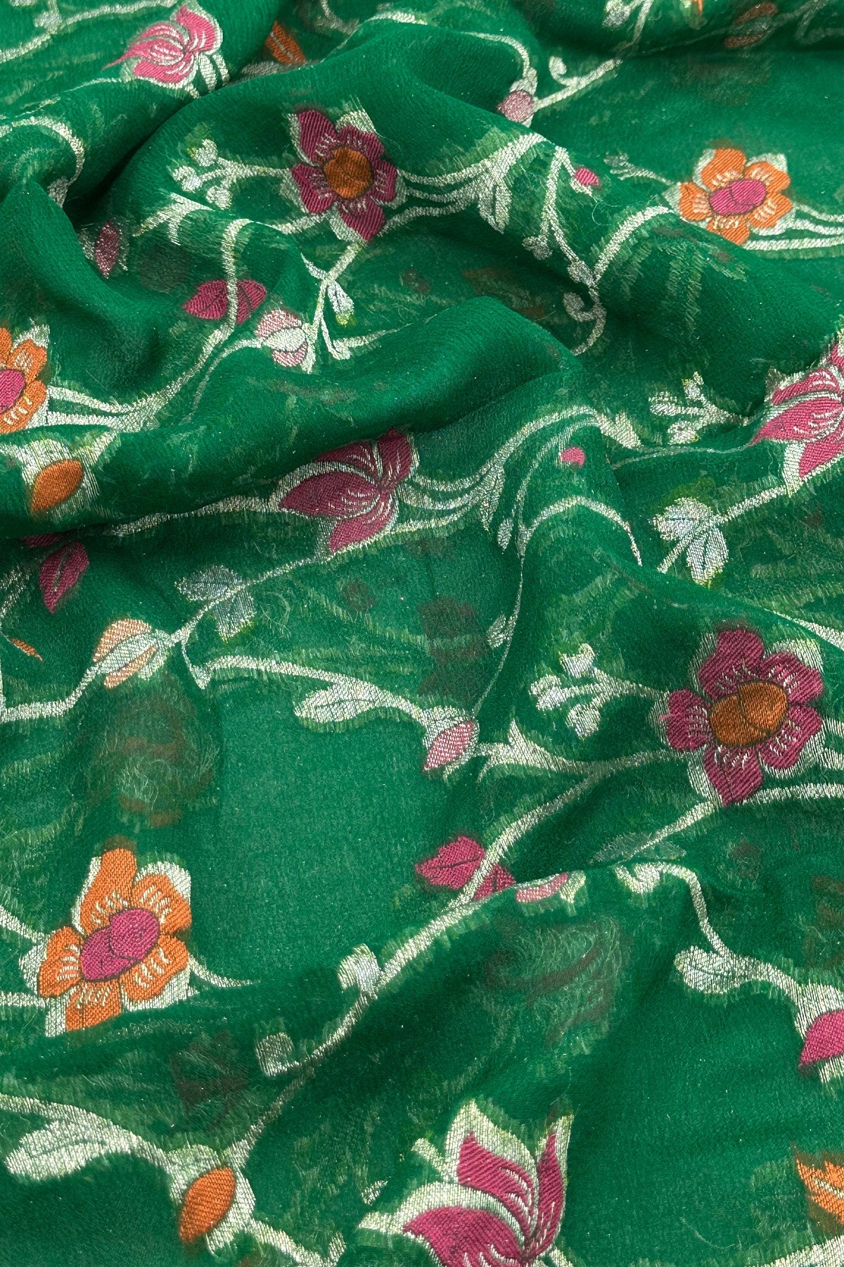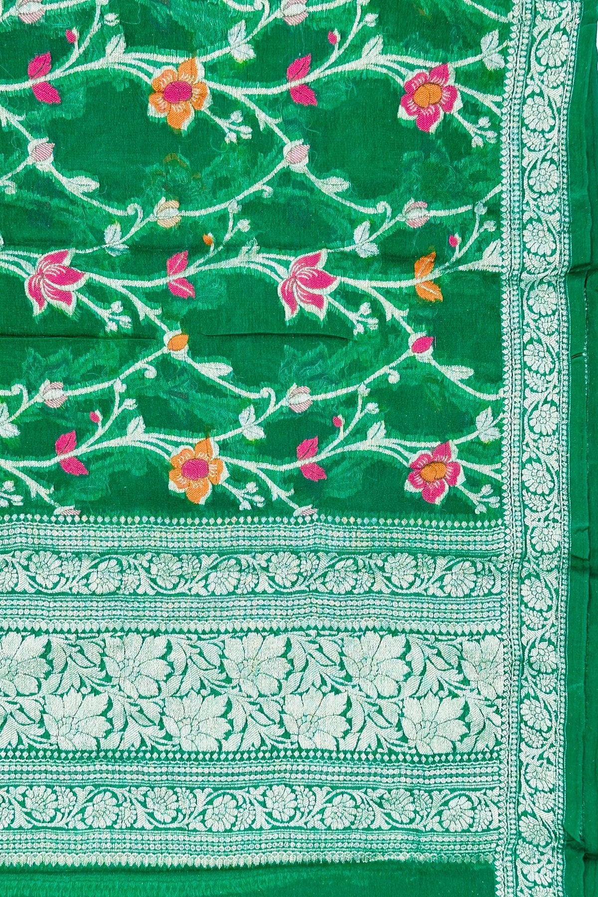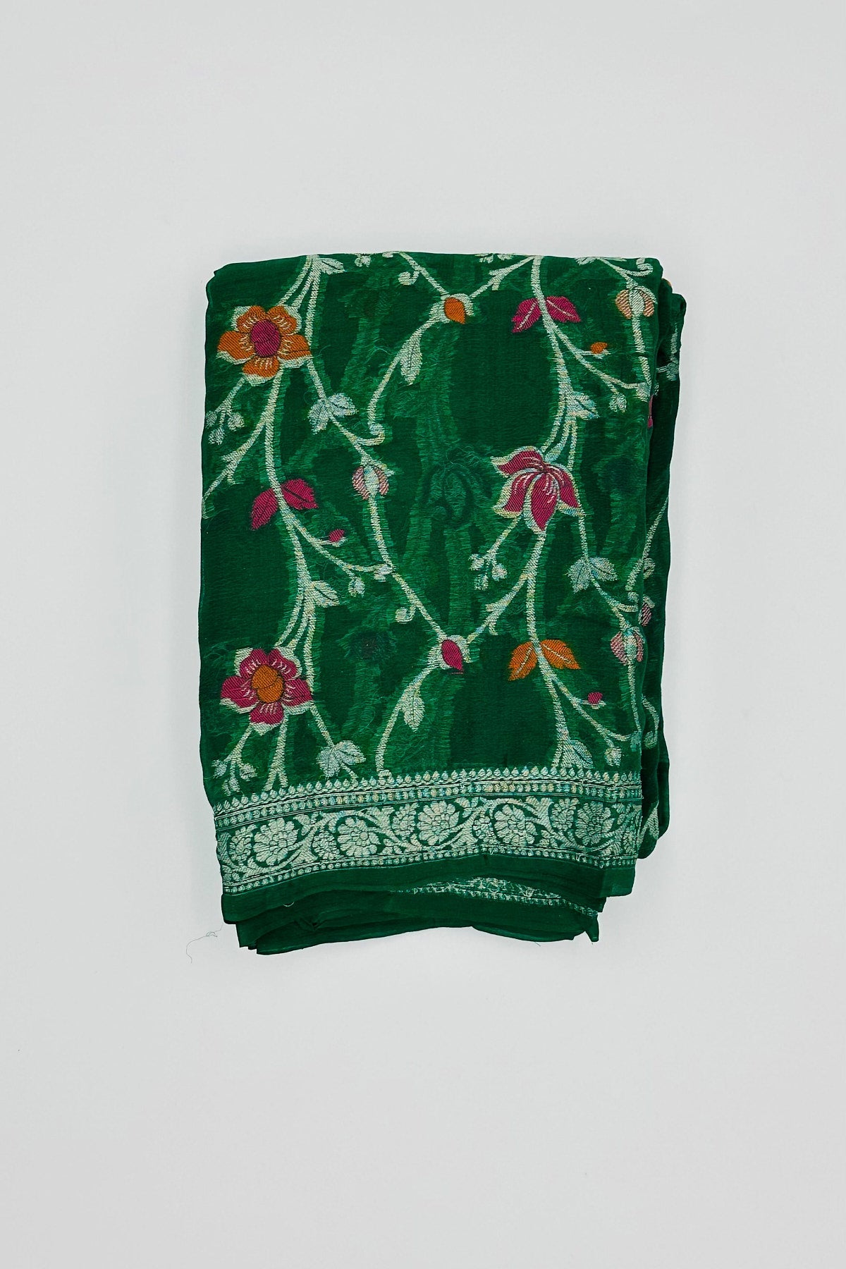 Discover the lush allure of our Emerald Enchantment Banarasi Dupatta, a treasure crafted from the finest pure georgette. This exquisite green dupatta radiates the elegance of traditional Banarasi artistry, adorned with intricate, ornate patterns that come alive against the vibrant backdrop. The rich green shade symbolizes renewal and vitality, while the sheer georgette fabric flows gracefully with every step. Perfect for infusing your ensemble with a touch of regal charm and timeless elegance, this dupatta is a testament to the beauty of classic Indian craftsmanship.