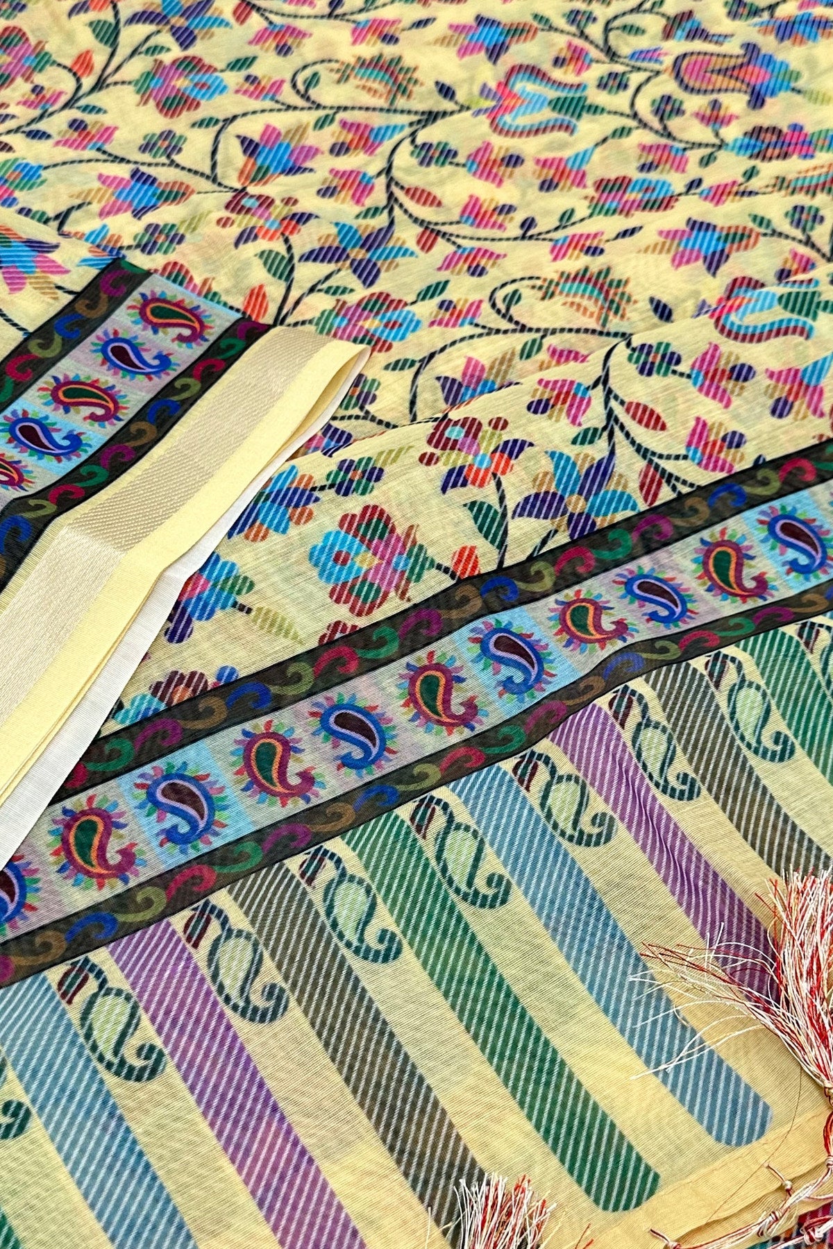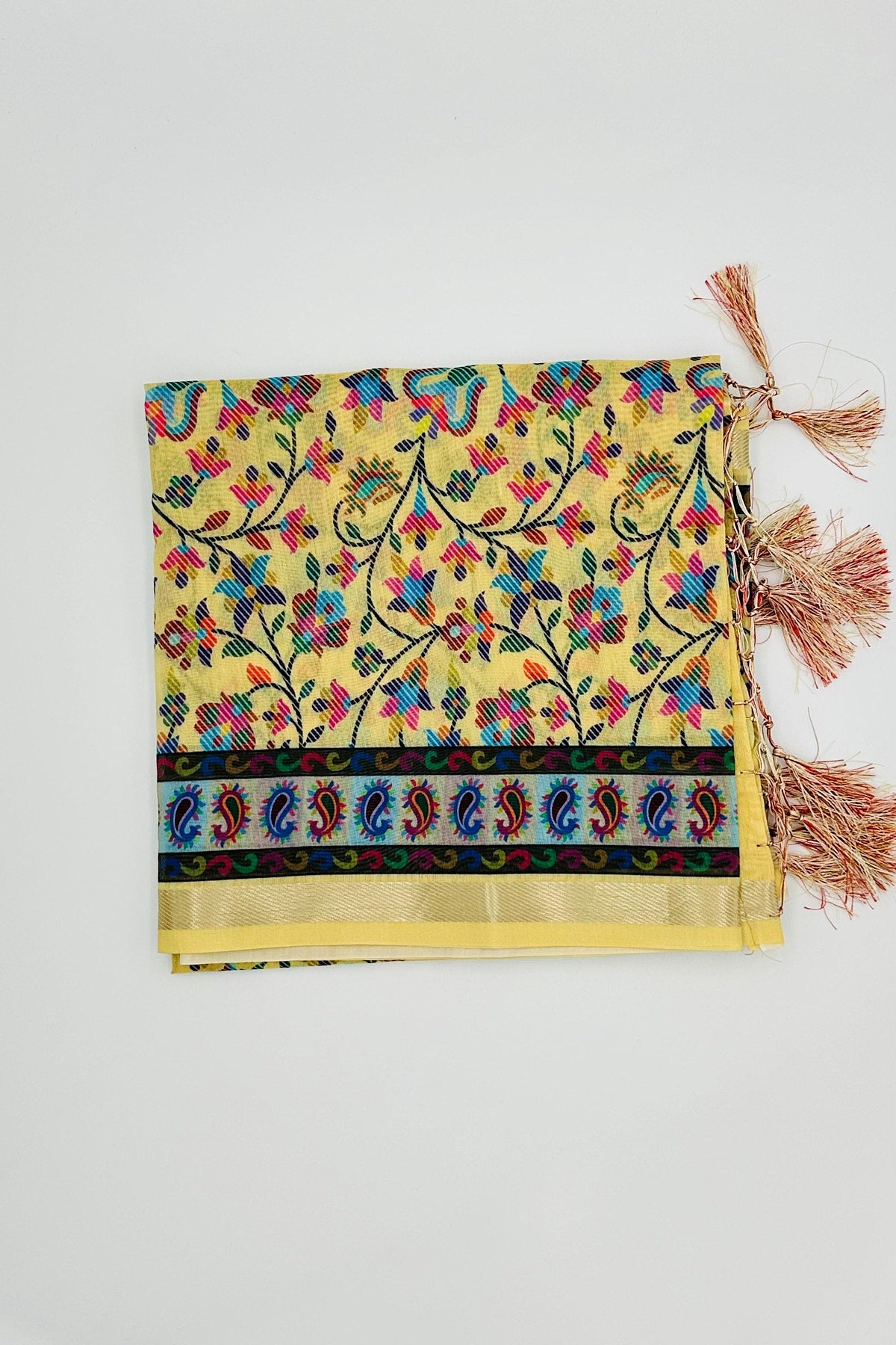 Welcome the warmth of our Sunrise Charm Dupatta, a delightful piece that captures the essence of early morning light. This light yellow dupatta, with its subtle hue, is beautifully adorned with digital prints that enhance its soft, cheerful character. The gentle yellow serves as an inviting backdrop for the intricate prints, creating a design that is both uplifting and elegant. The lightweight fabric ensures an effortless drape, adding a touch of grace and fluidity to your ensemble. Ideal for those who cherish a hint of sunshine in their attire, this dupatta is a perfect blend of contemporary design and timeless appeal.