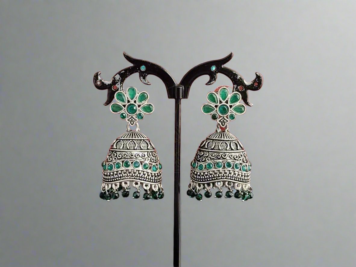 Emerald Embossed Oxidised Silver Jhumkas with Fluid Green Beads.