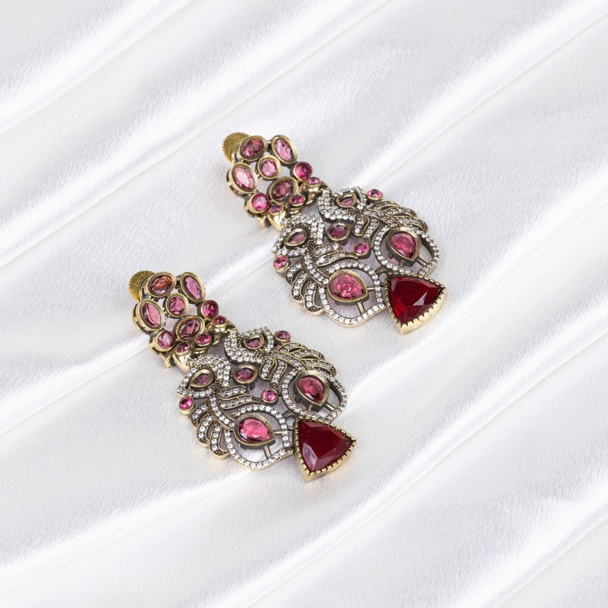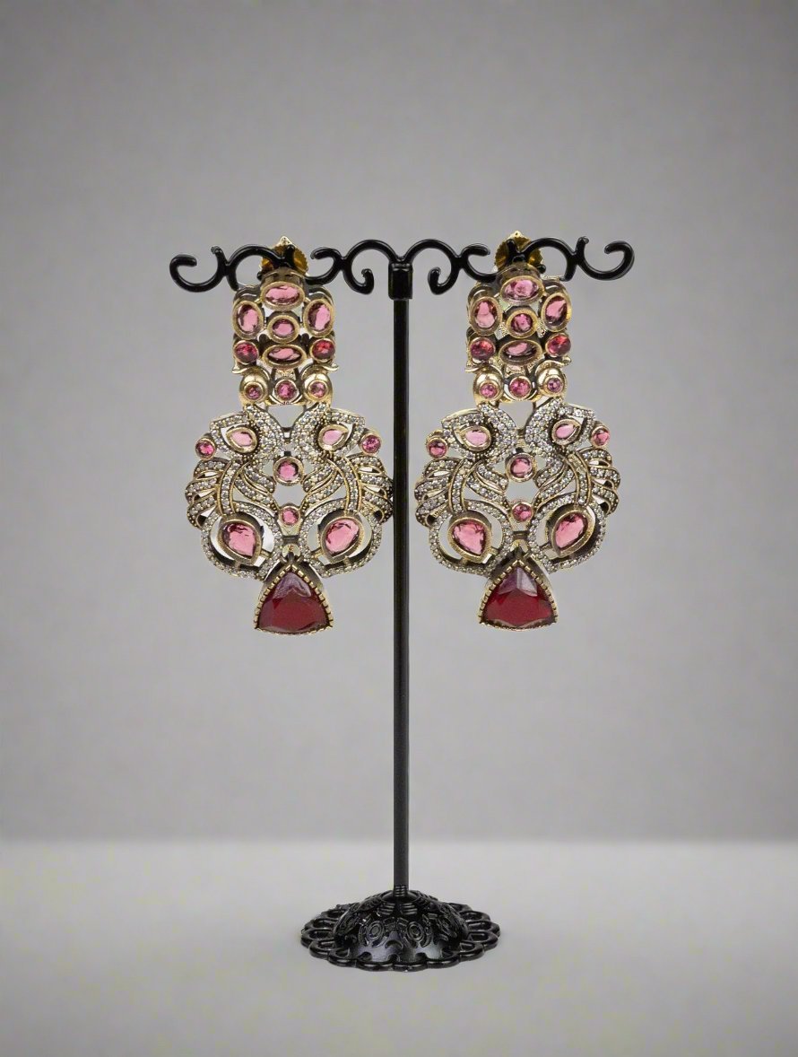 Add a touch of luxury with these captivating Rose Plume Earrings, featuring intricate peacock-inspired designs with sparkling pink and red CZ stones. Perfect for special occasions or elevating everyday style.