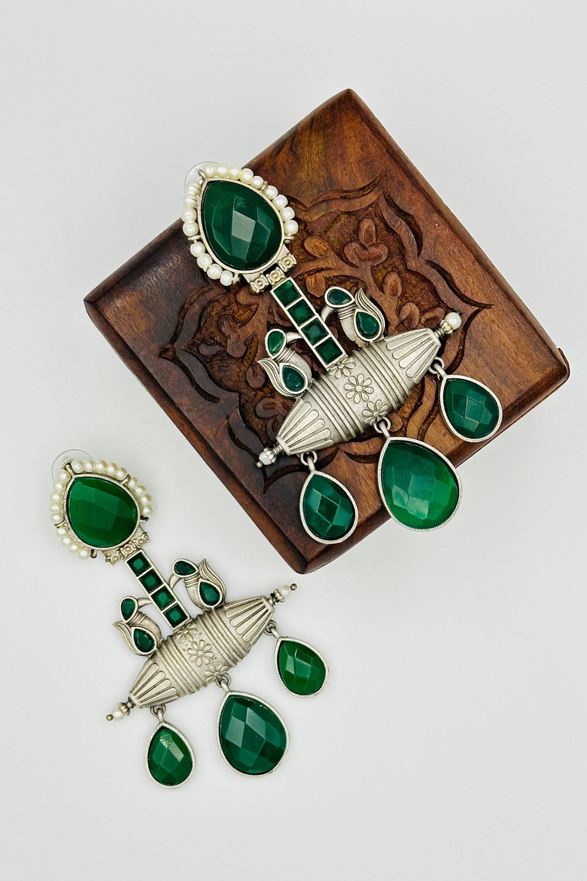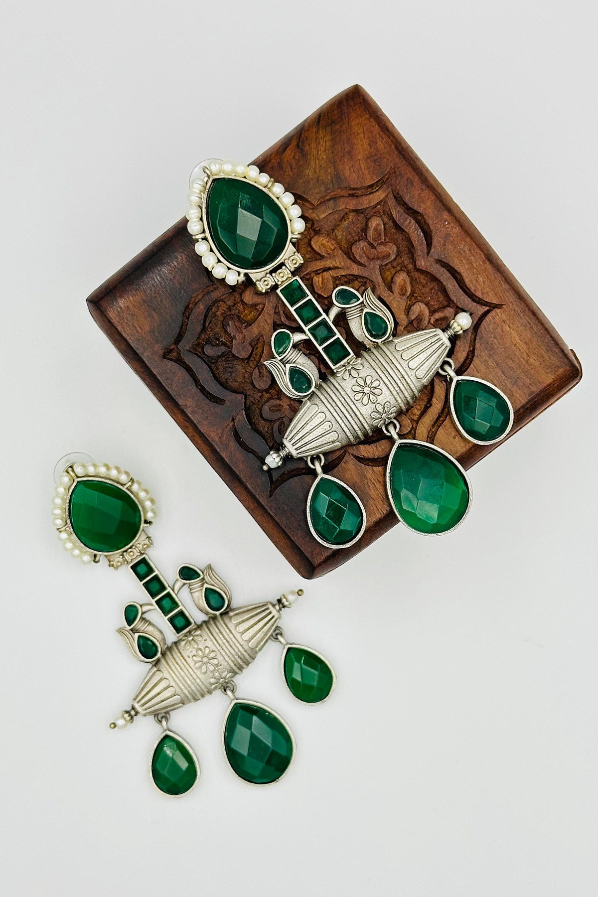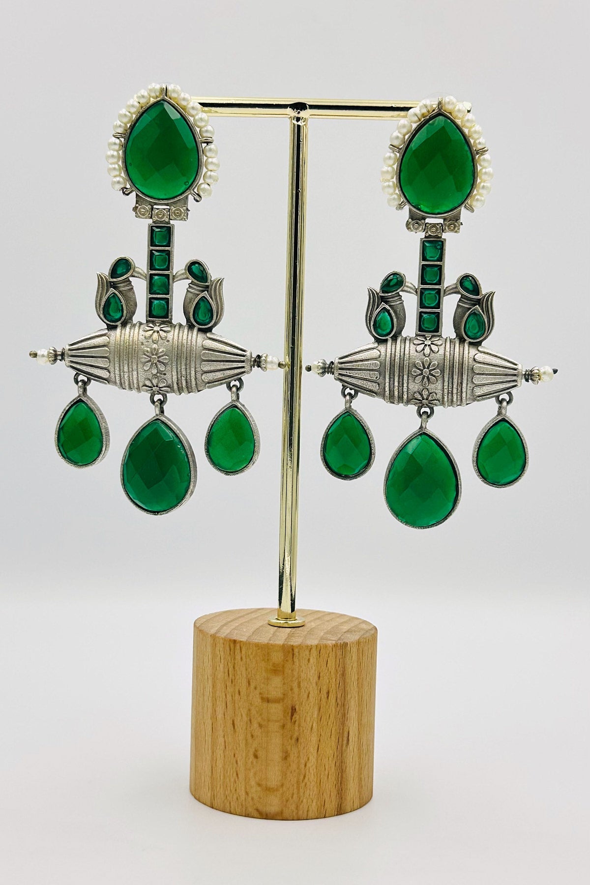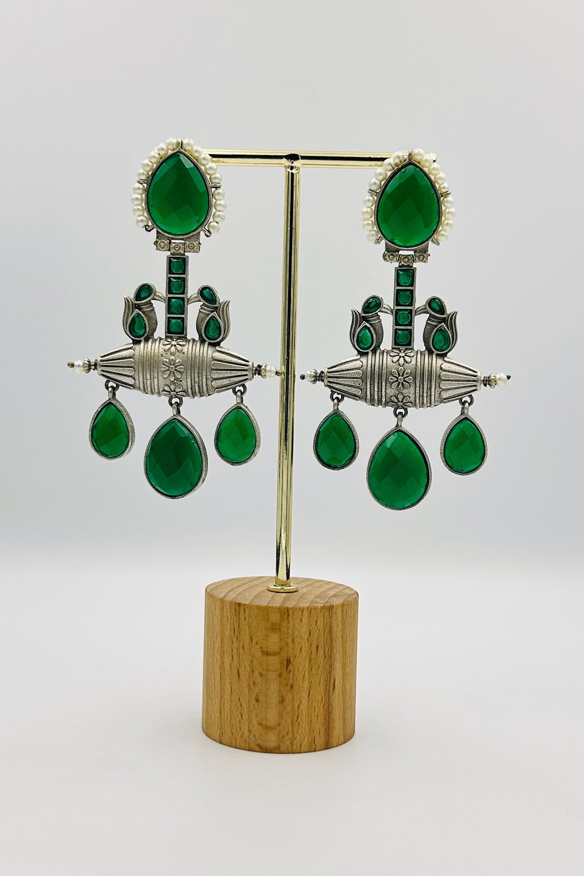 Experience elegance with our handcrafted silver earrings adorned with green crystals and pearls. These earrings blend intricate detailing with modern sophistication, making them perfect for any occasion. Elevate your style and leave a lasting impression with their enchanting beauty.