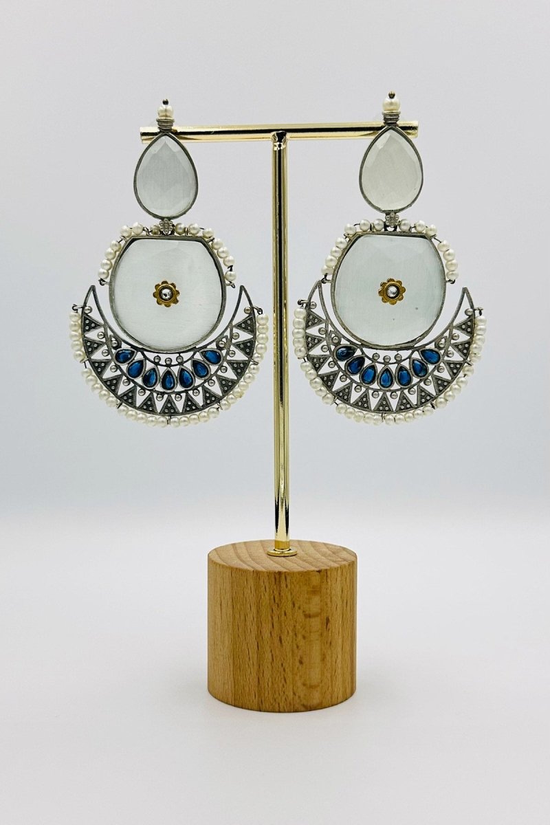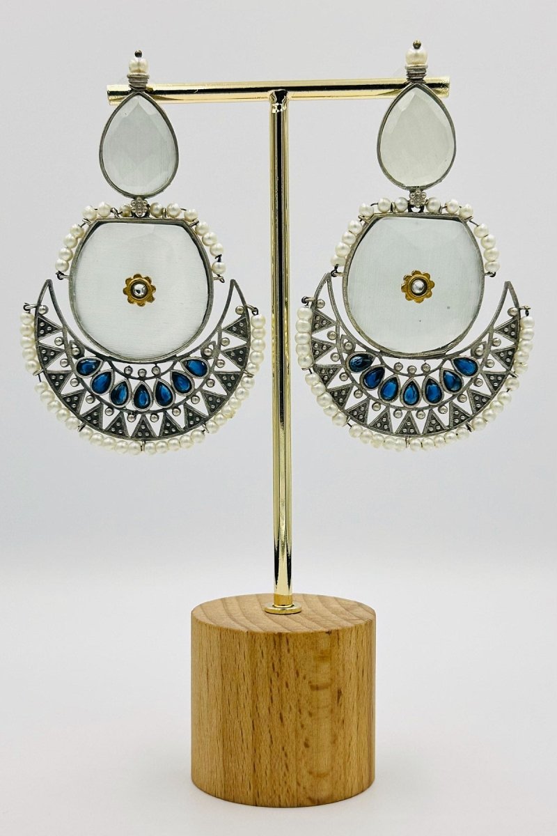 Embark on a journey of sophisticated elegance with "Mystic Mélange," a stunning fusion of cool hues set in silver. These crescent-shaped earrings capture the essence of a tranquil seascape, where the calmness of grey meets the depth of blue. Each earring features a harmonious blend of grey and blue stones, reminiscent of a serene, overcast sky meeting the tranquil sea. The grey stones convey the wisdom and stability of a cloudy day, while the blue stones bring to mind the peacefulness and depth of ocean waters. Complemented by the timeless beauty of pearls, these earrings exude a sense of refined serenity. Perfect for those who appreciate the subtle interplay of colors and the elegant blend of nature's palette, "Mystic Mélange" is an exquisite accessory for any occasion that calls for a touch of quiet sophistication and poise.