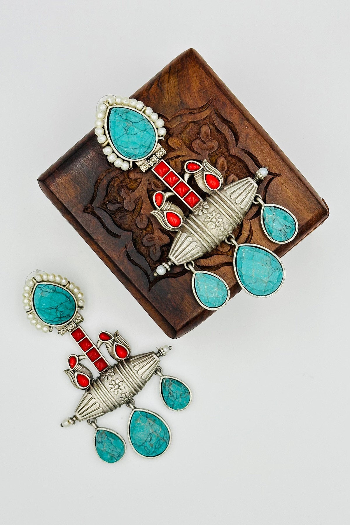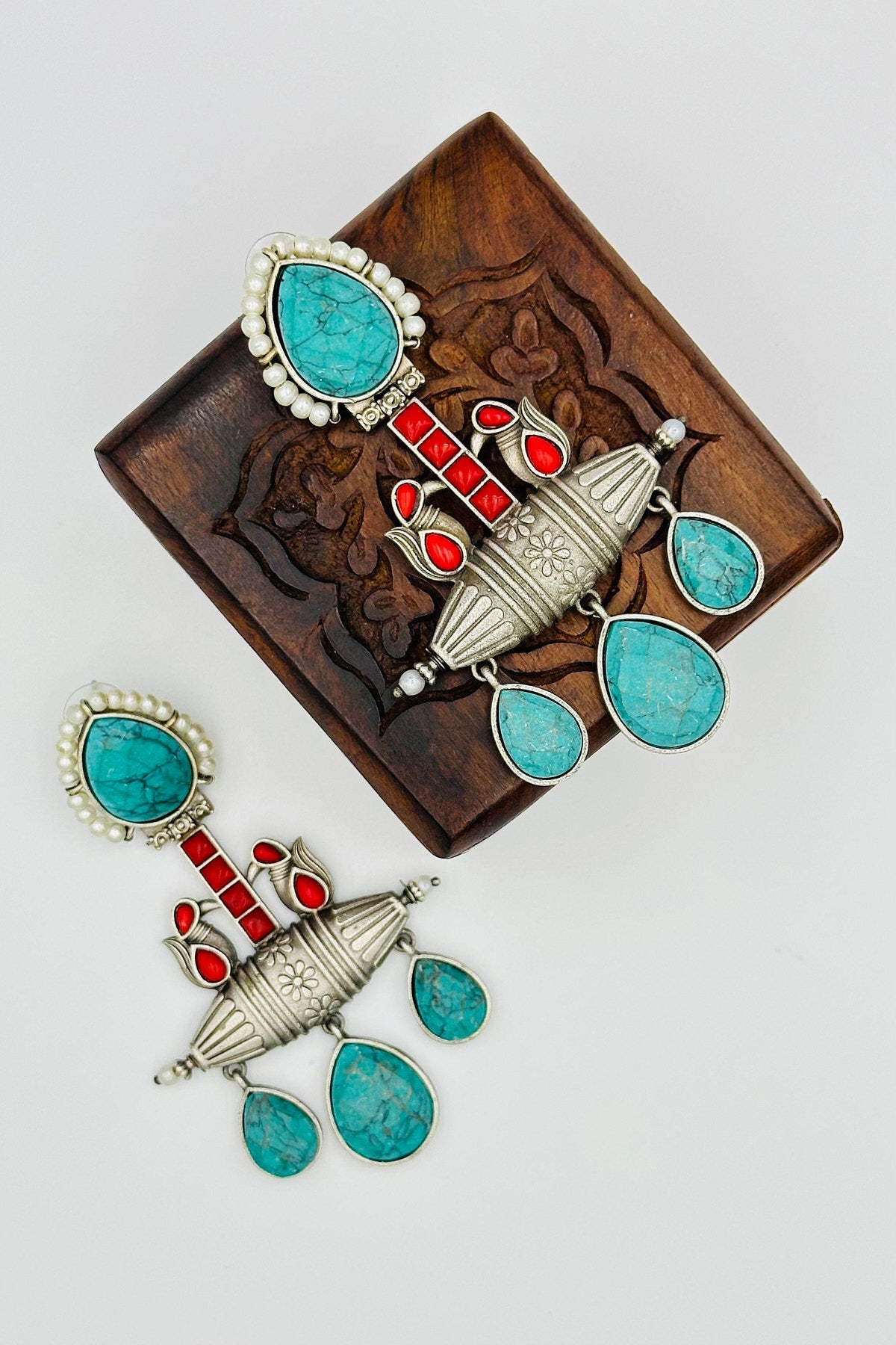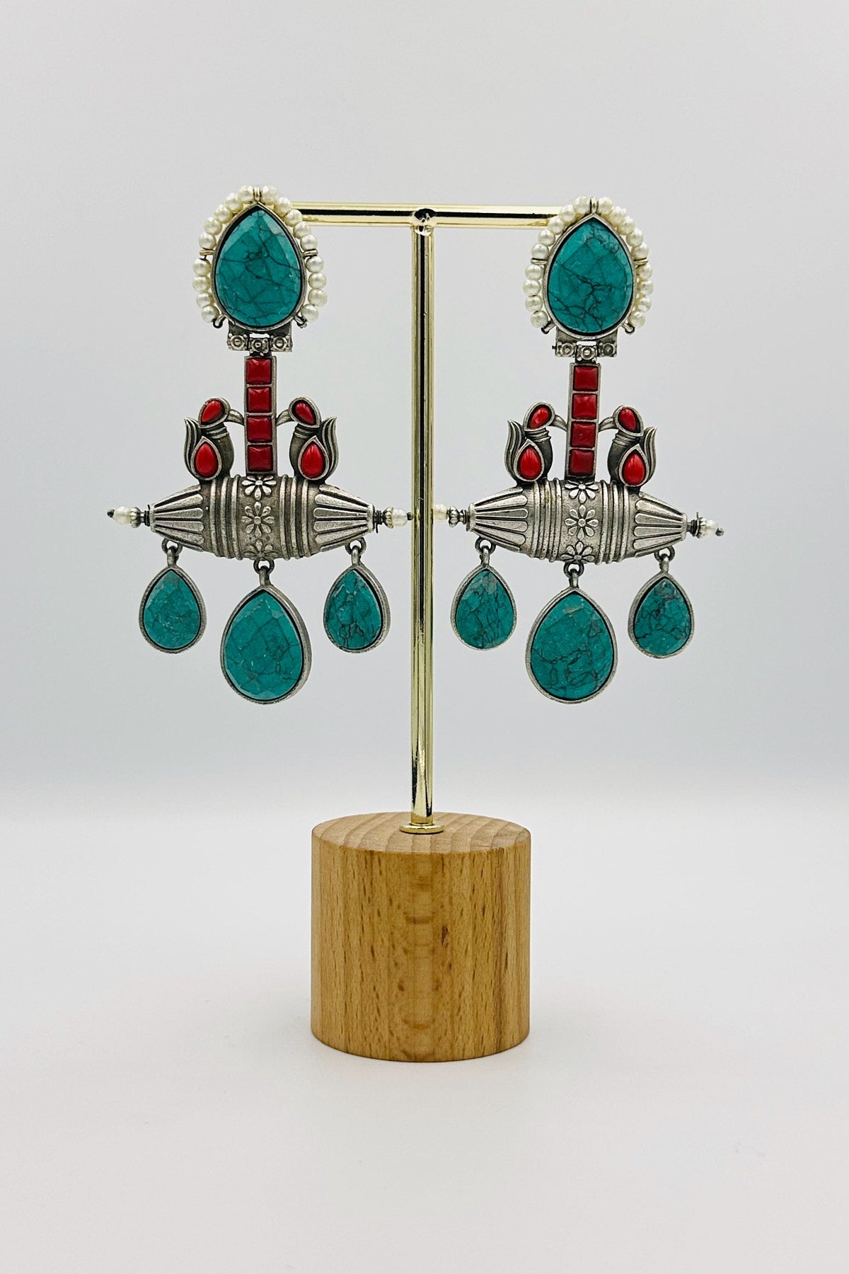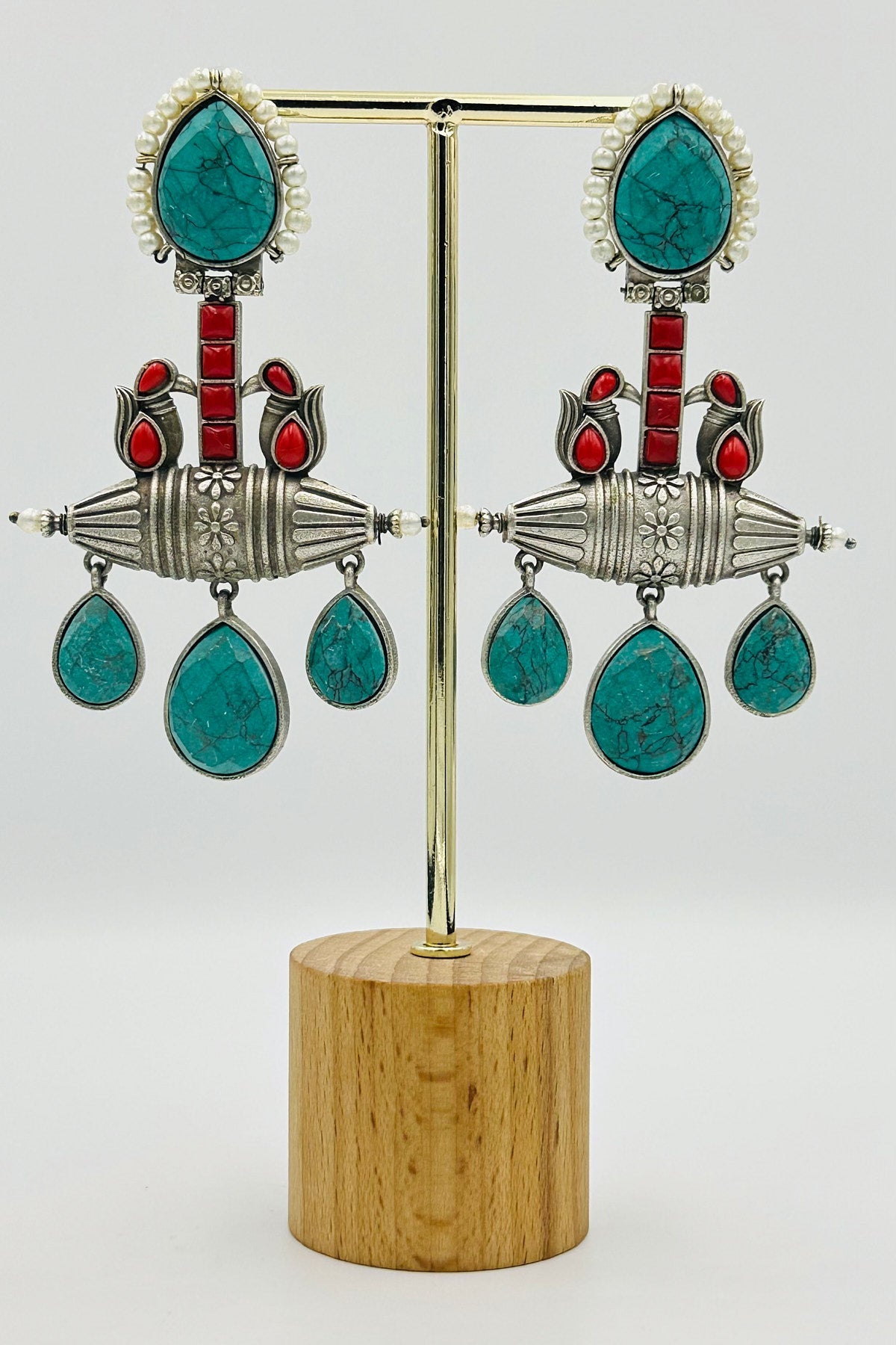 Discover the enchantment of 'Feroza & Crimson Charm,' where handcrafted silver earrings showcase the vivid allure of feroza and the passionate vibrancy of crimson stones. These meticulously crafted earrings combine intricate detailing with modern sophistication, making them perfect for every occasion. Elevate your style with the captivating beauty of feroza and crimson, leaving a remarkable impression wherever you go.