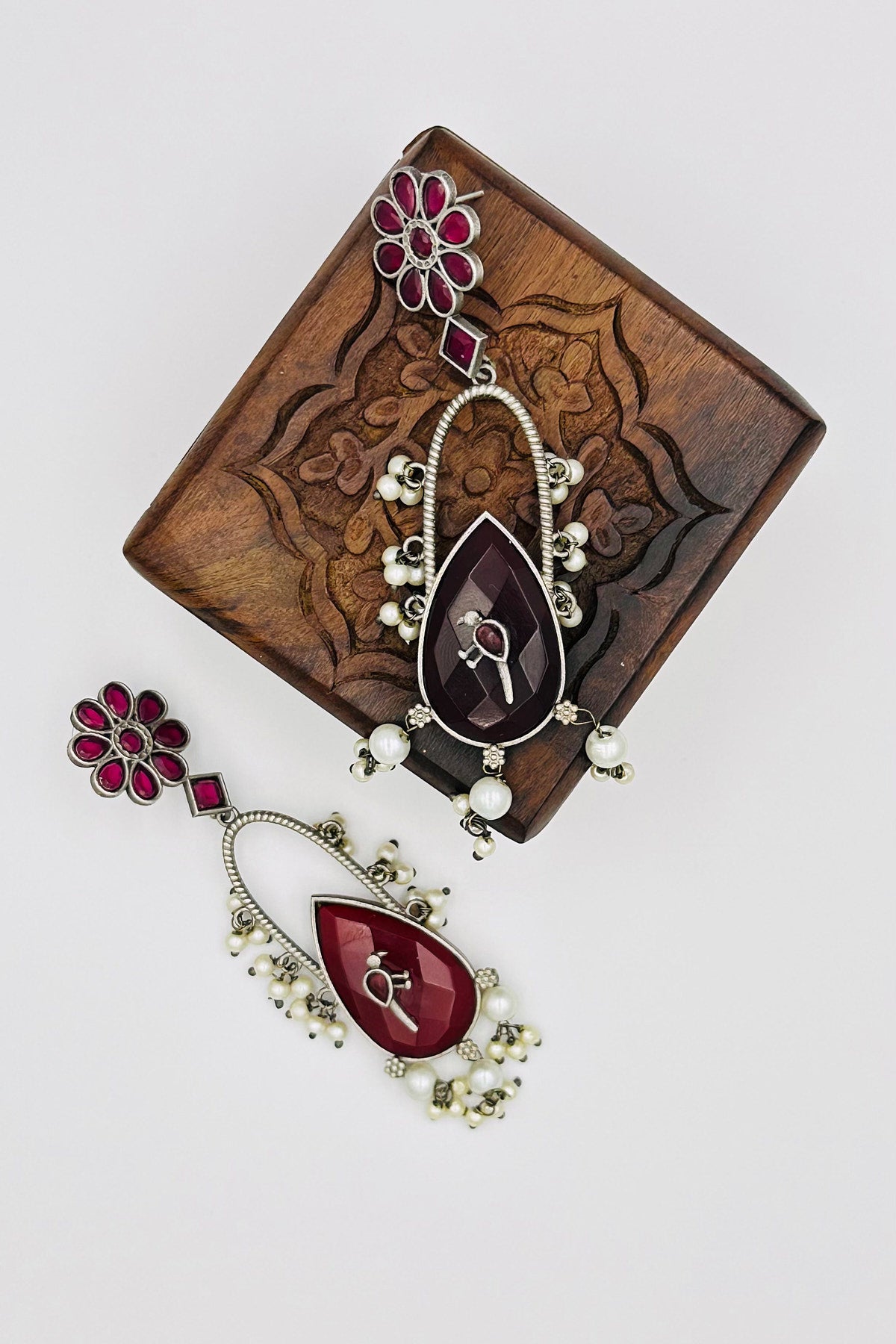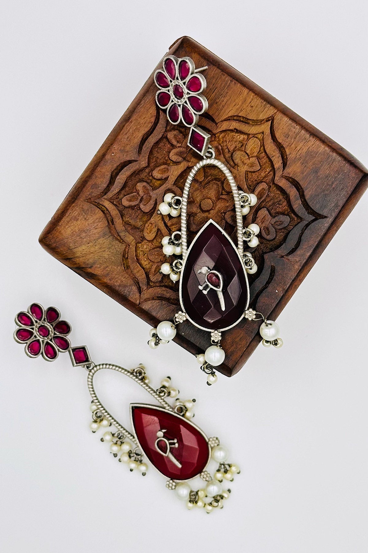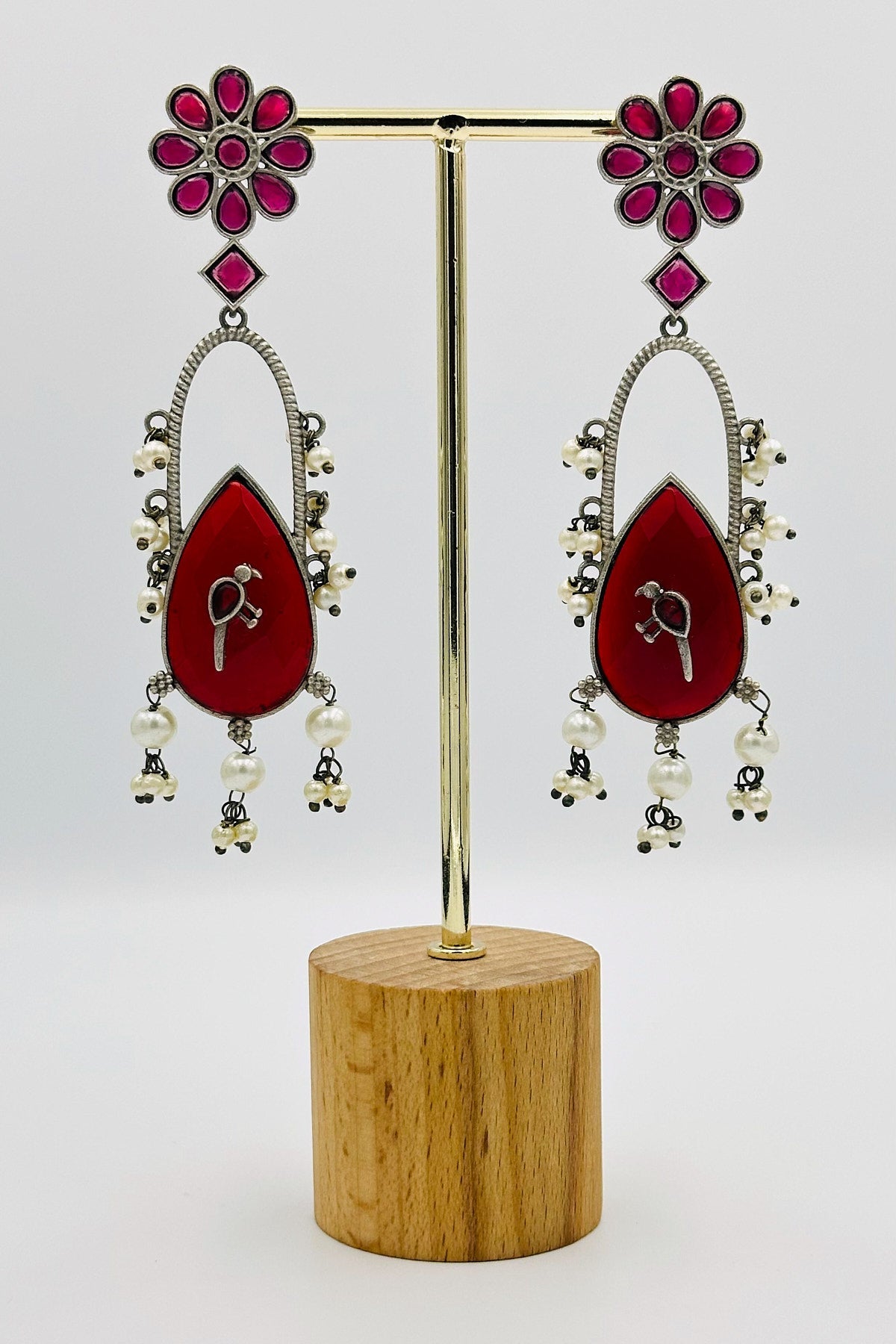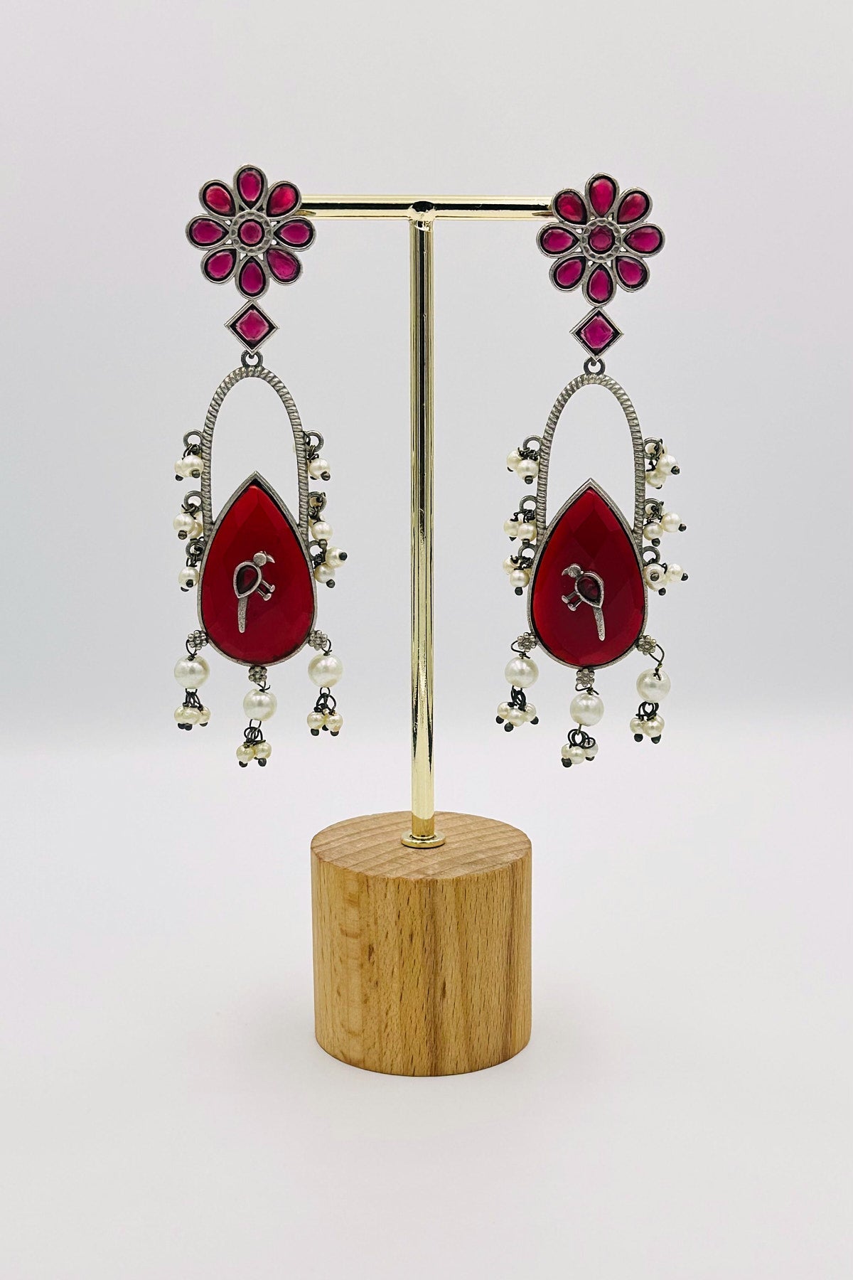 Handcrafted Silver Earrings with Deep Red Crystal Accents and Bird Embellishment - swadeshsouq.com