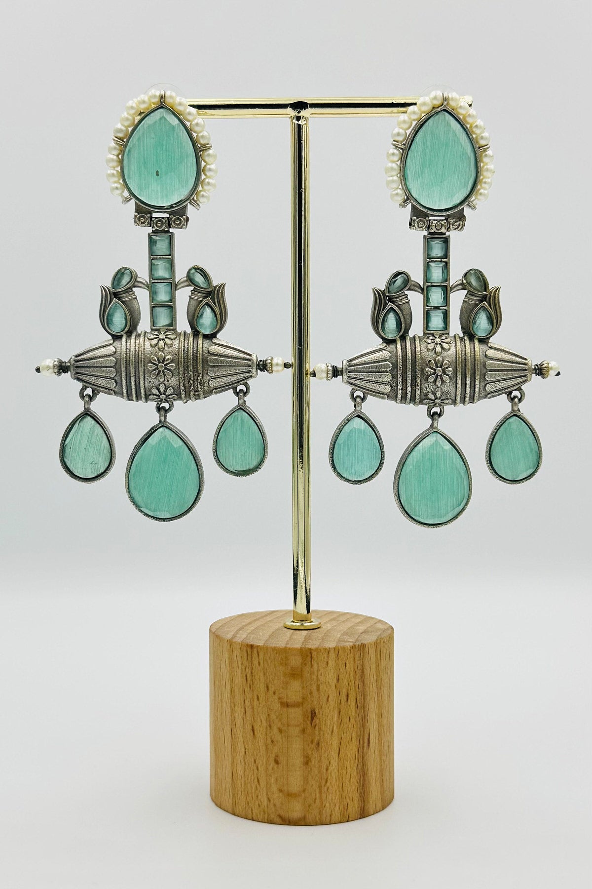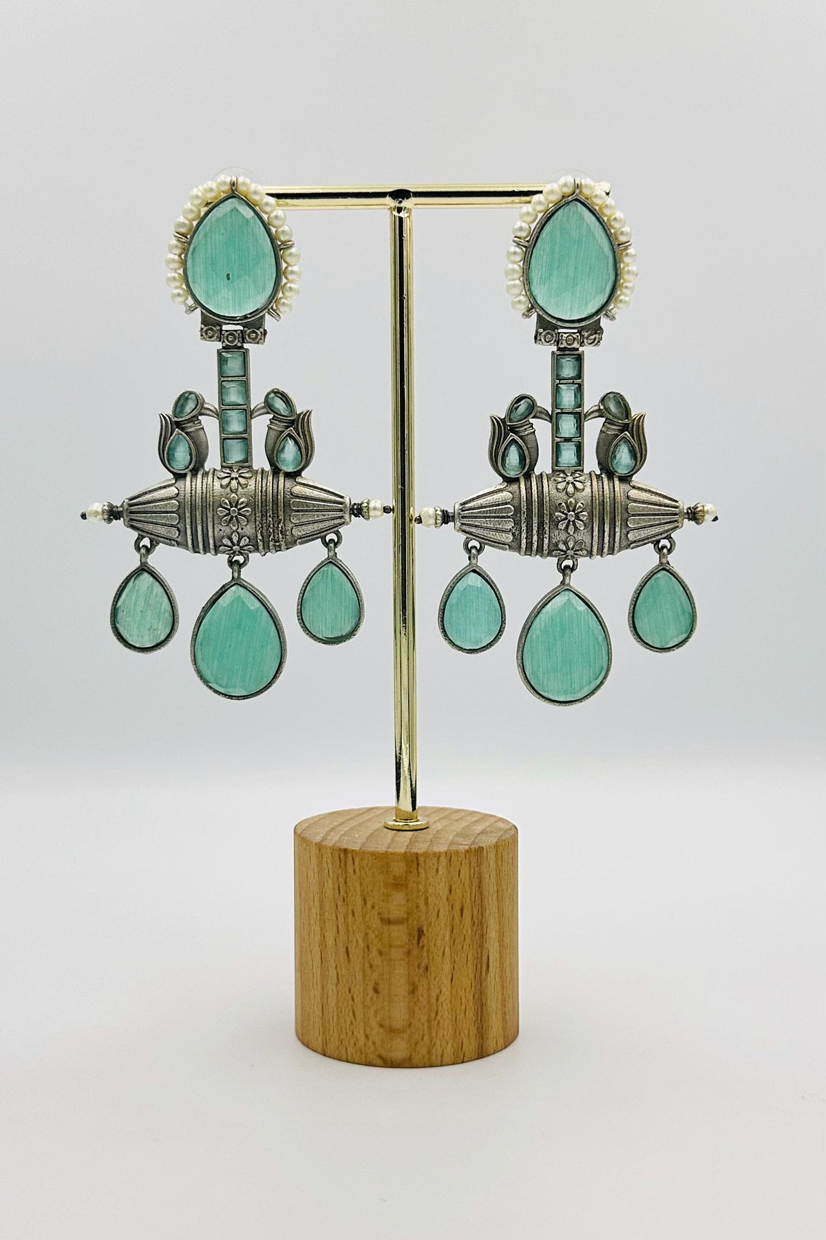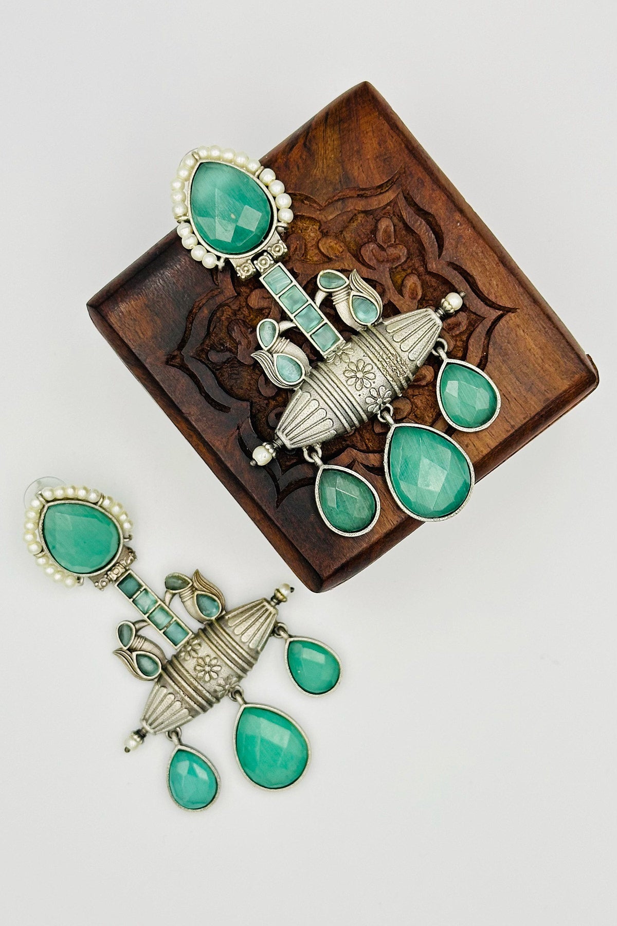 Handcrafted Silver Earrings with Embossed Crystals and Pearls - swadeshsouq.com