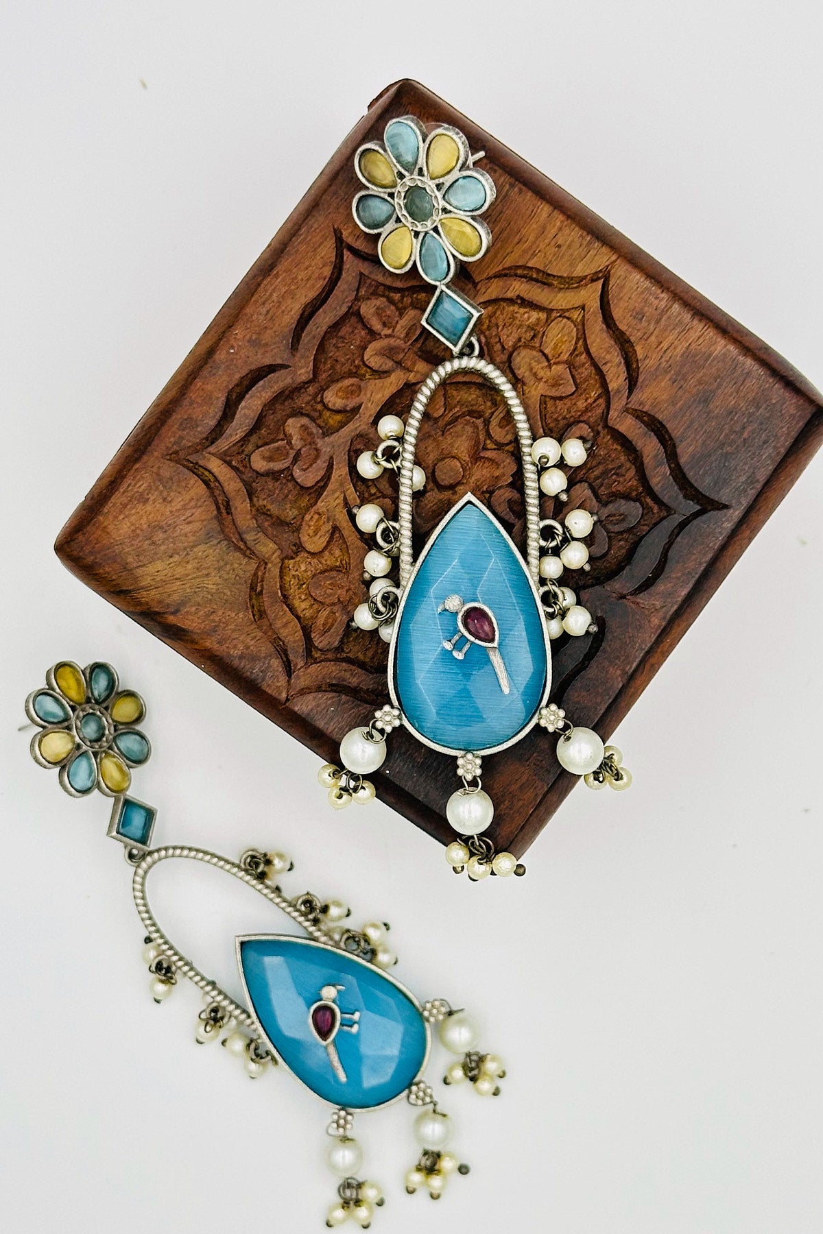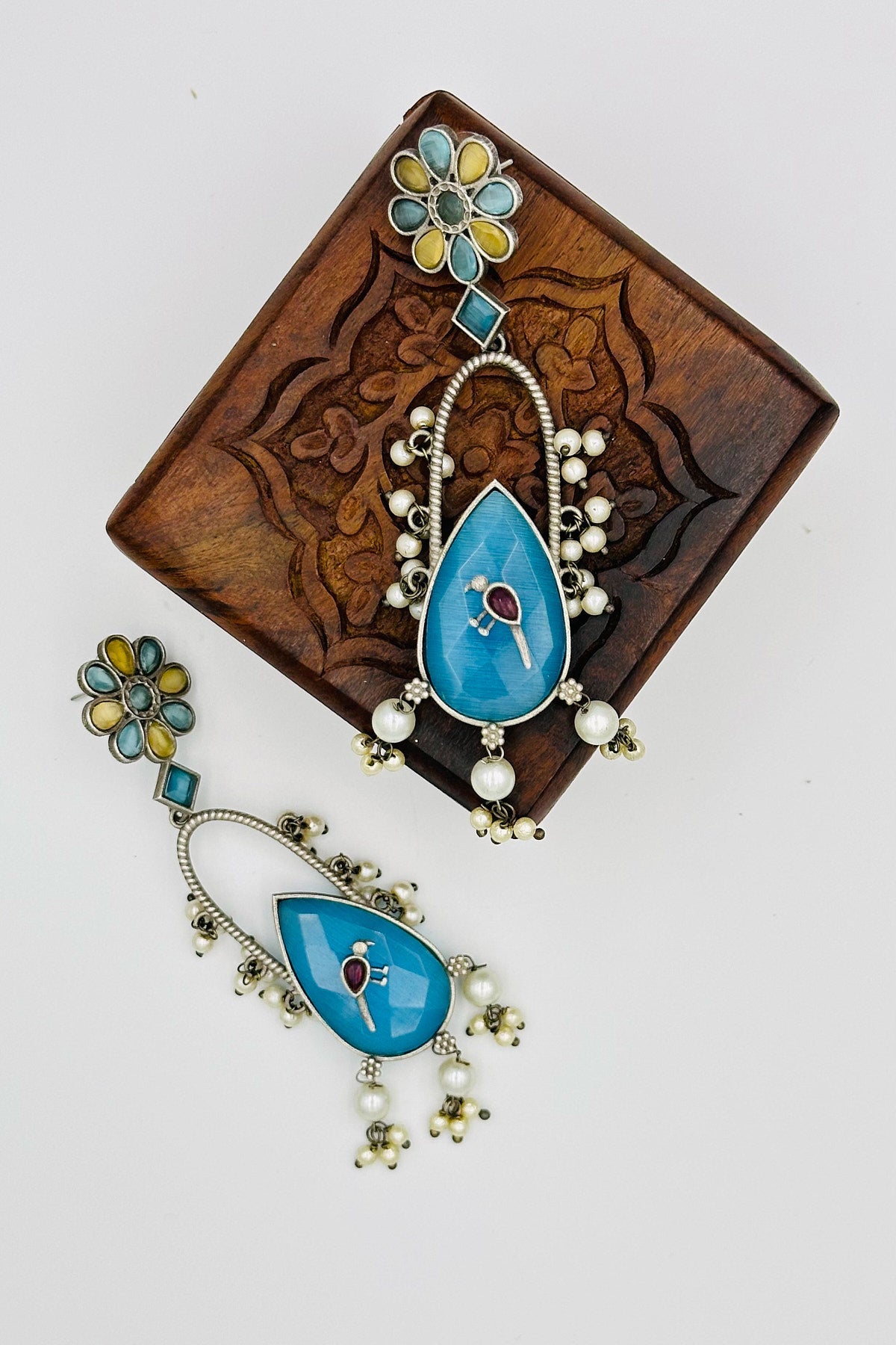 Handcrafted Silver Earrings with Feroza and Yellow Crystal Accents and Bird Embellishment - swadeshsouq.com