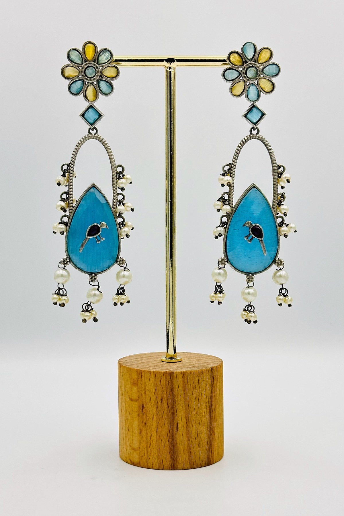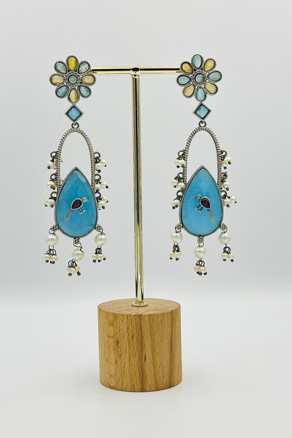 Handcrafted Silver Earrings with Feroza and Yellow Crystal Accents and Bird Embellishment