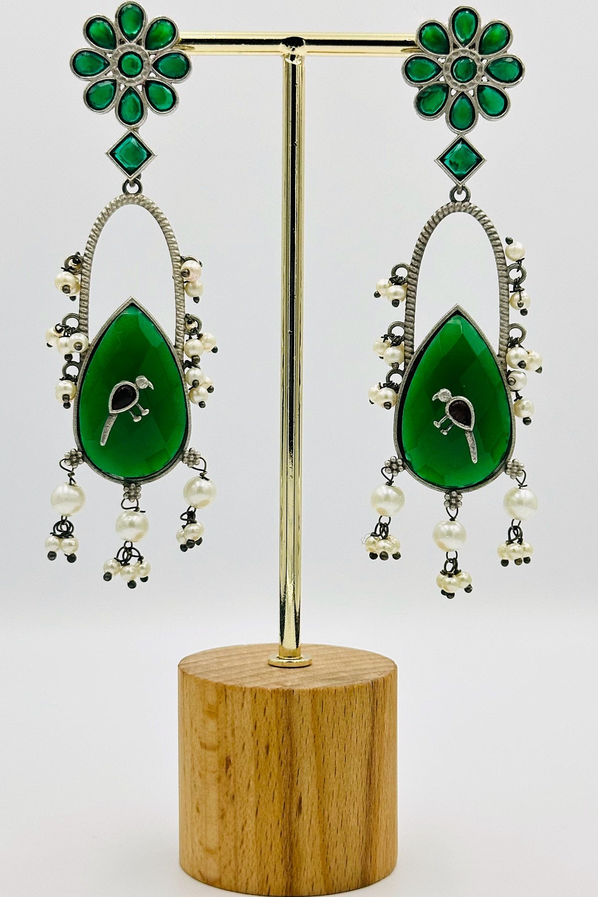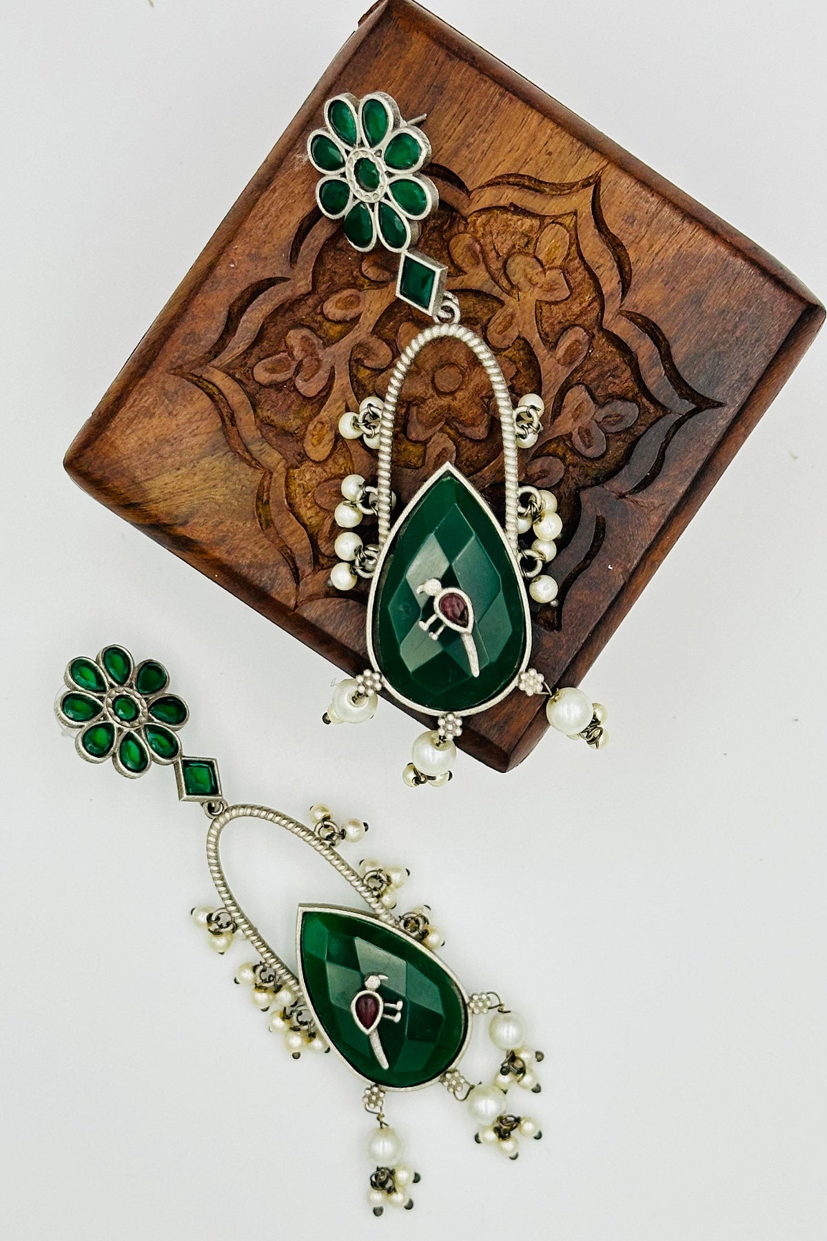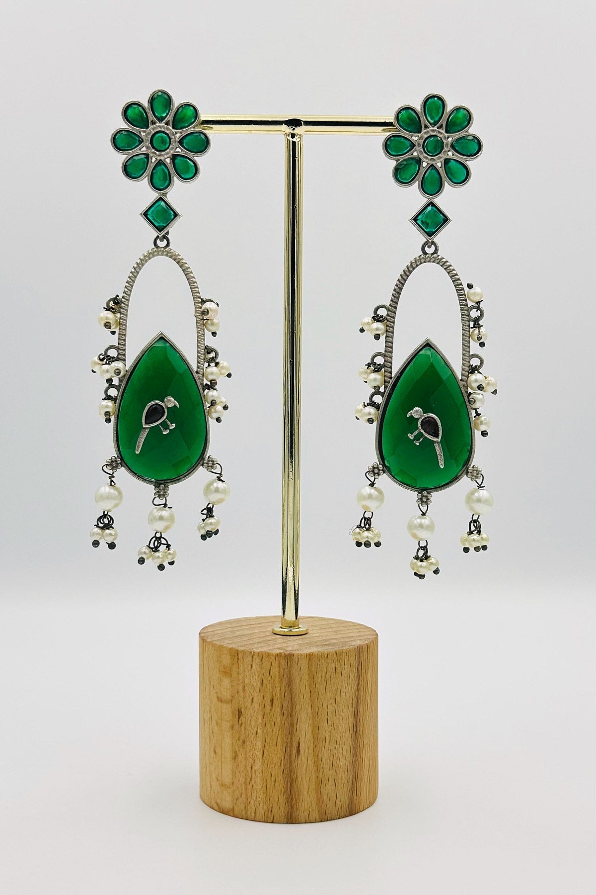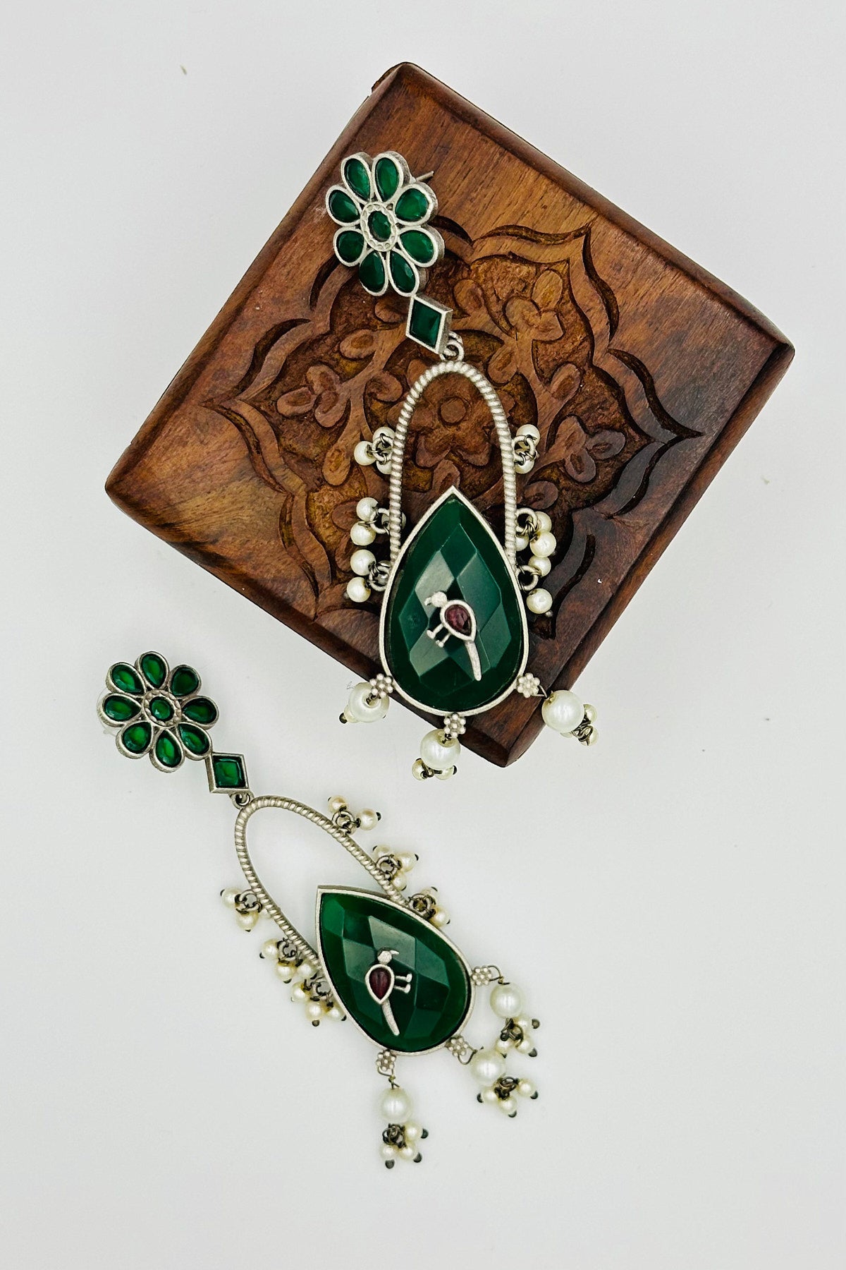Handcrafted Silver Earrings with Green Crystal Accents and Bird Embellishment - swadeshsouq.com