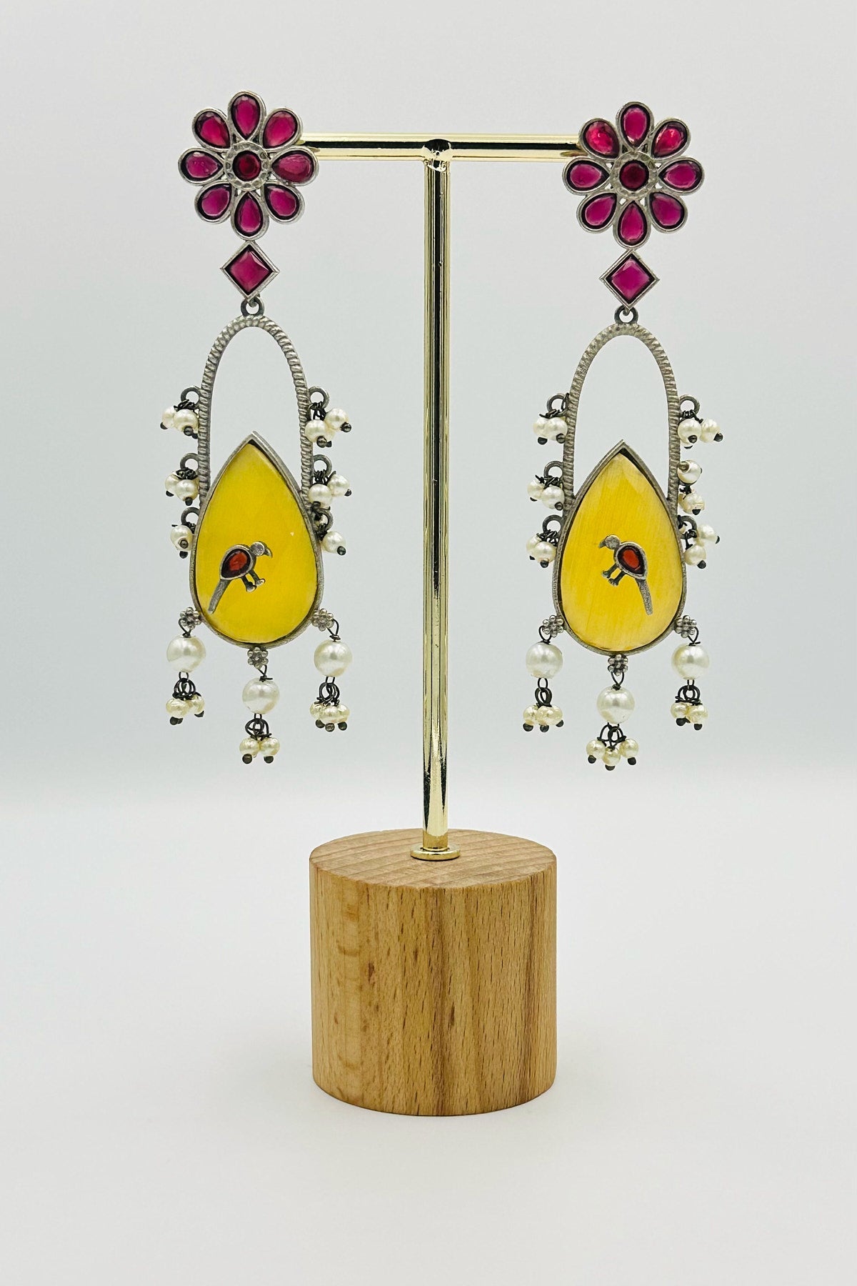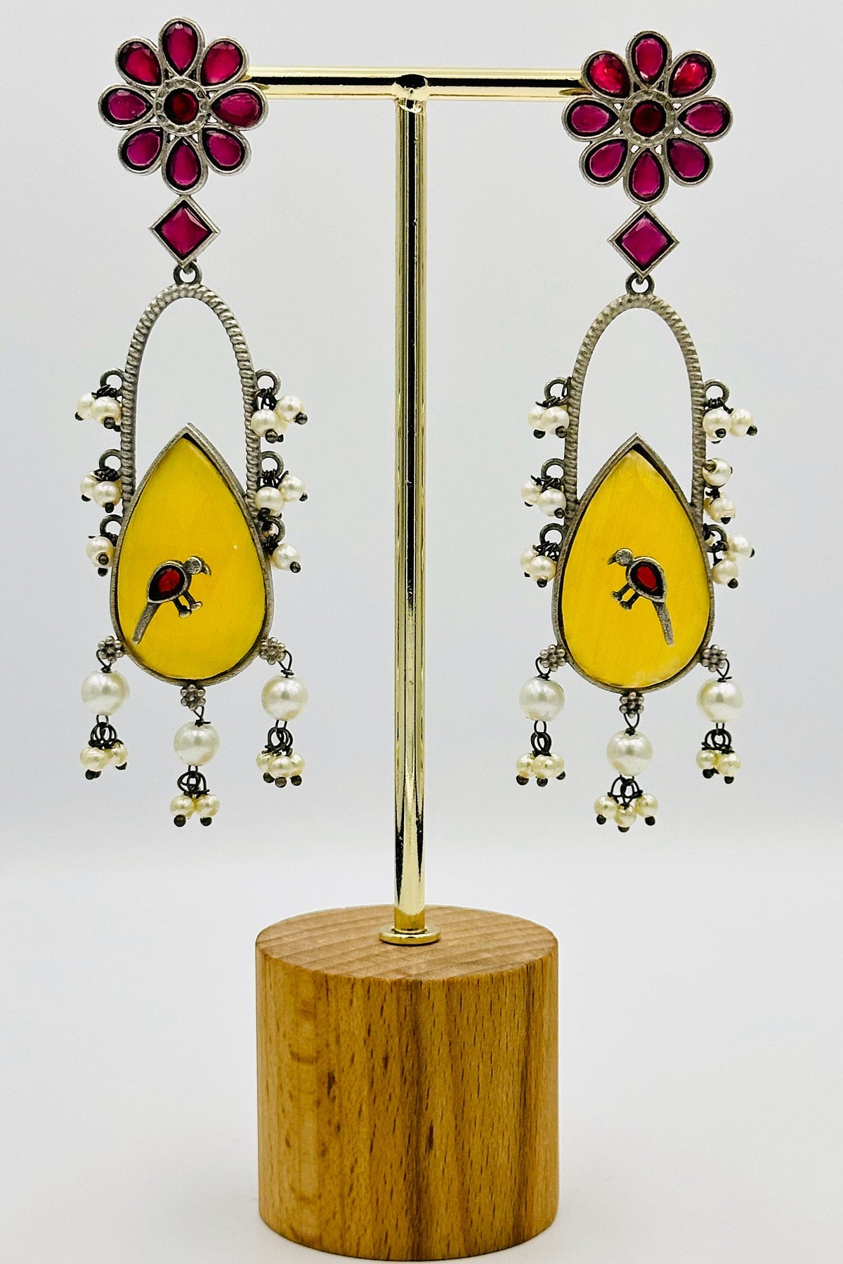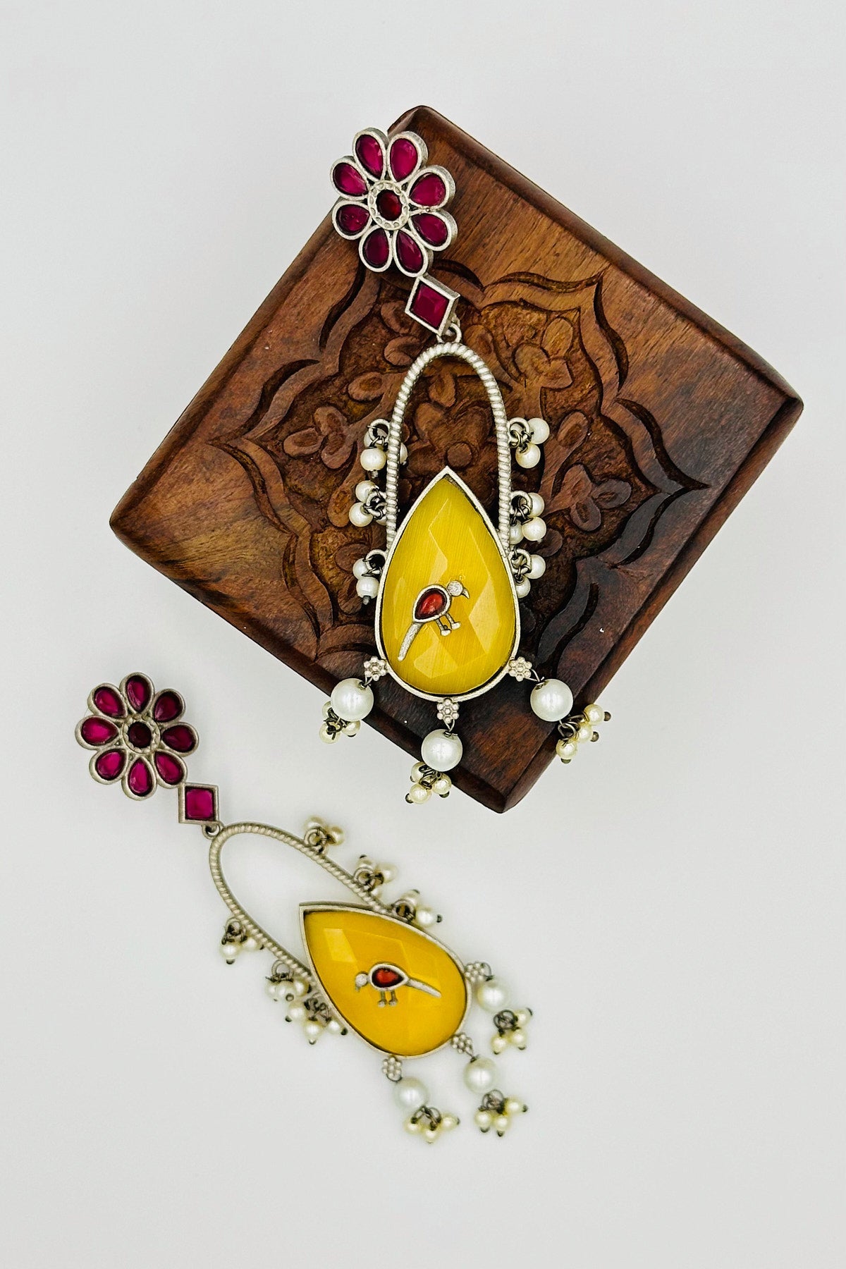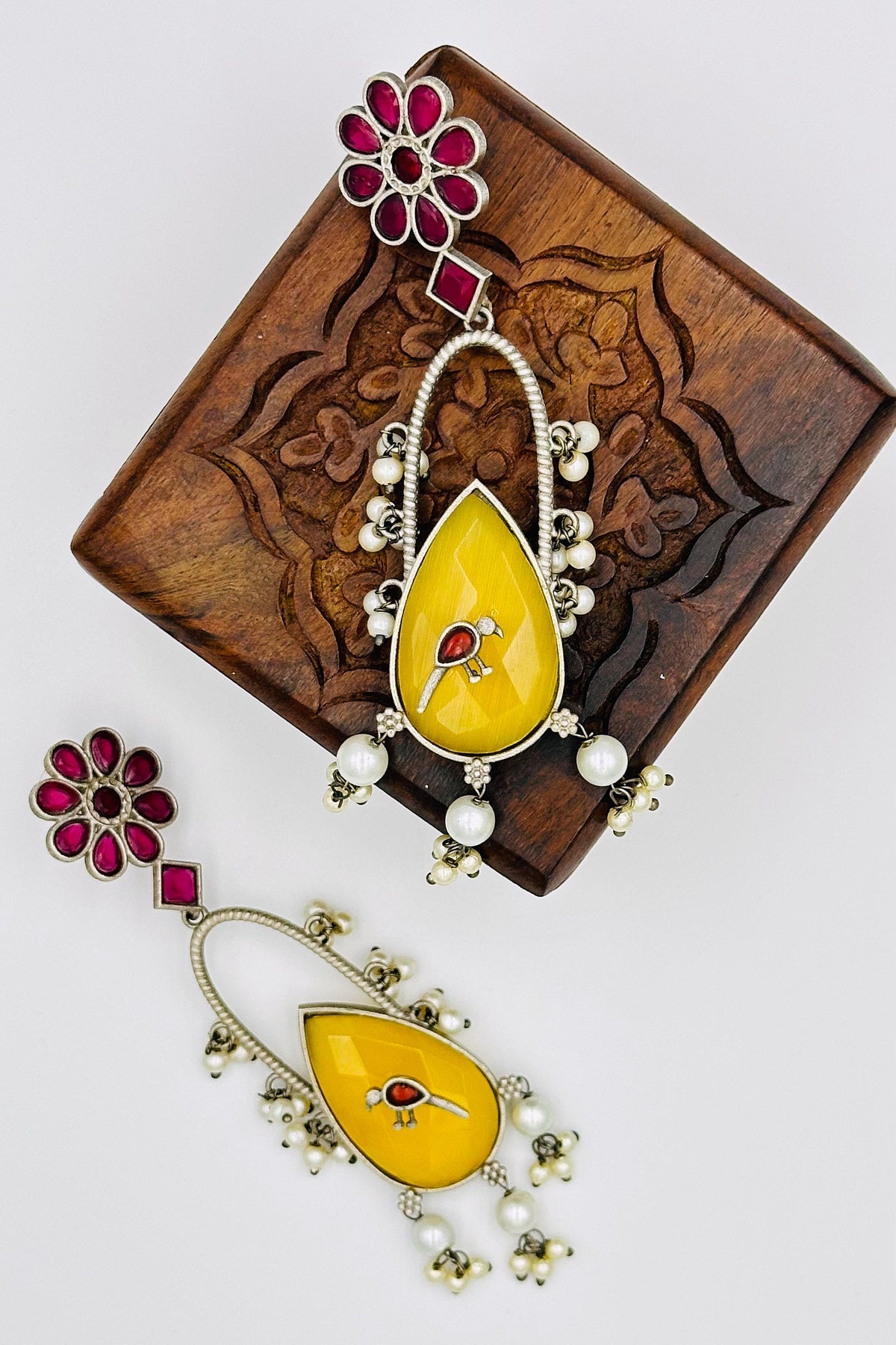 Discover the enchanting "Floral Elegance" in these long, handcrafted silver earrings. Intricately designed with a beautiful floral motif, these jewels bloom with red and yellow crystal accents that sparkle like sunlight on a summer's day. A delicate bird embellishment perches amidst the blossoms, adding a touch of whimsical charm to your style. These earrings are a testament to craftsmanship and a unique blend of artistry and nature's beauty.