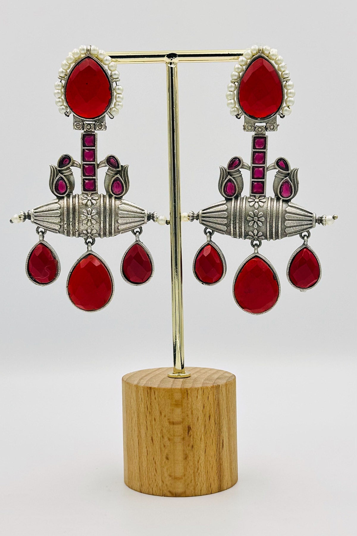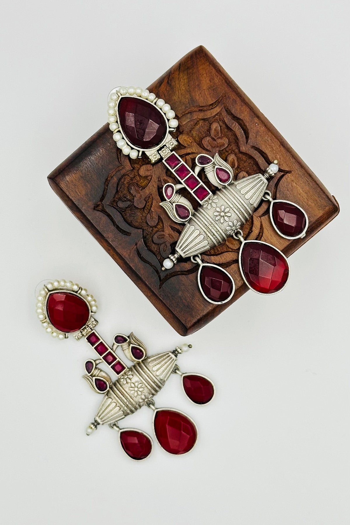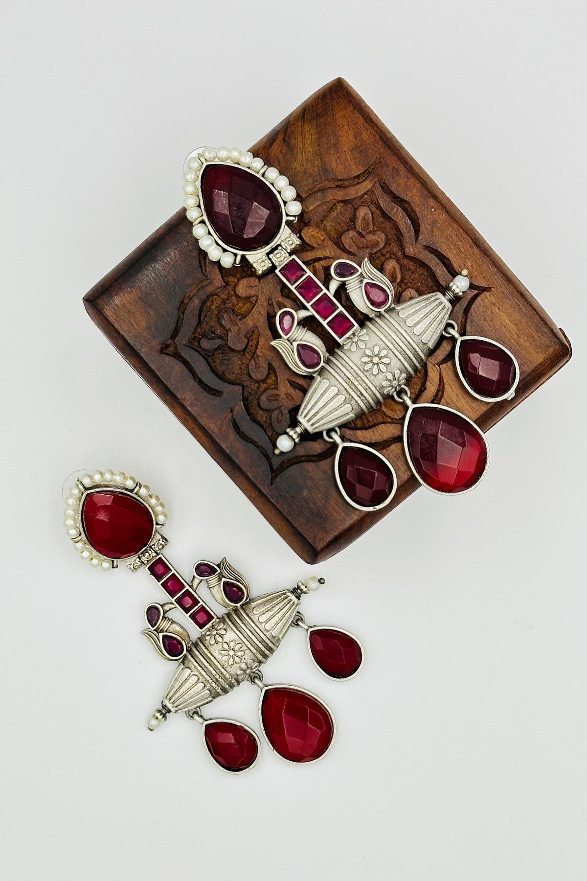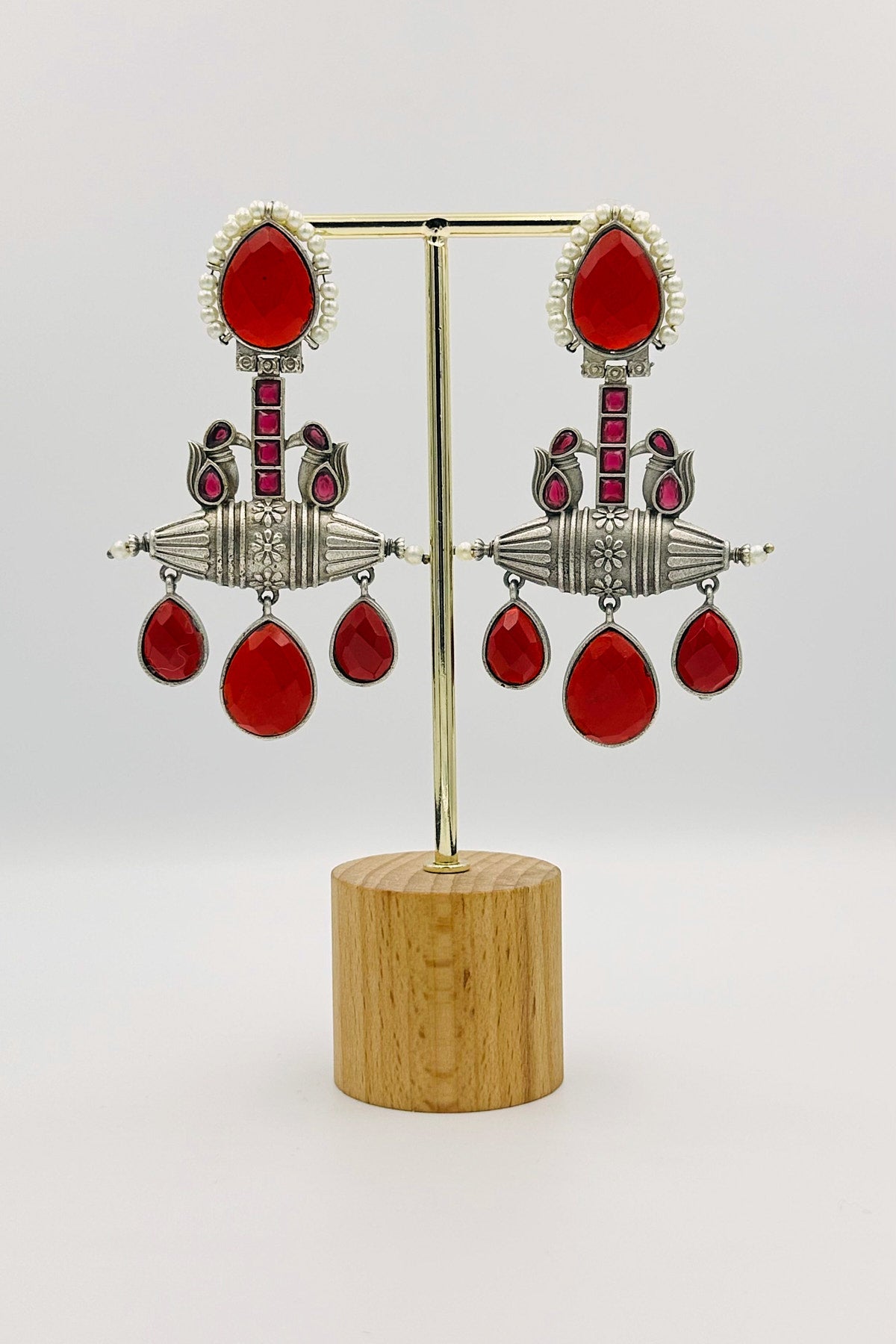 Handcrafted Silver Earrings adorned with lustrous pearls and dazzling crystals in a deep shade of red. Elevate your style with these exquisite earrings, meticulously designed for timeless elegance. Their striking hue exudes confidence and passion, leaving a lasting impression wherever you go. Embrace the allure of red opulence and make a statement that's as bold as it is beautiful.