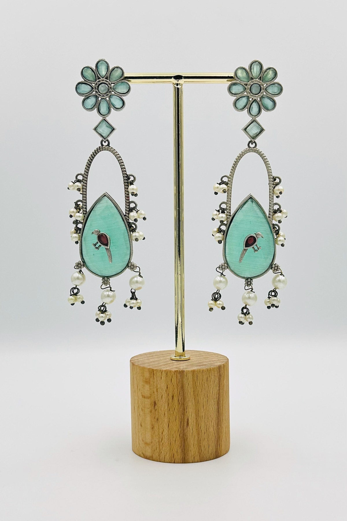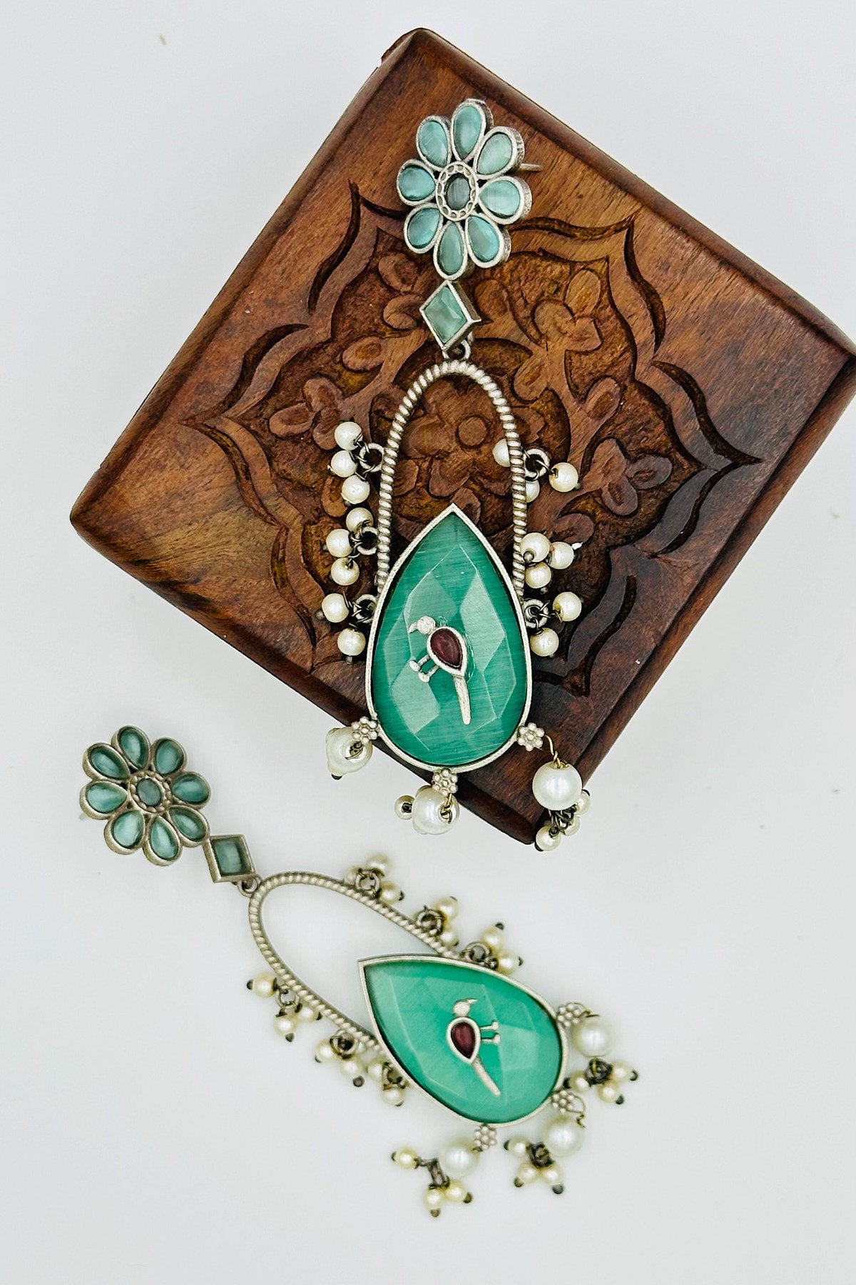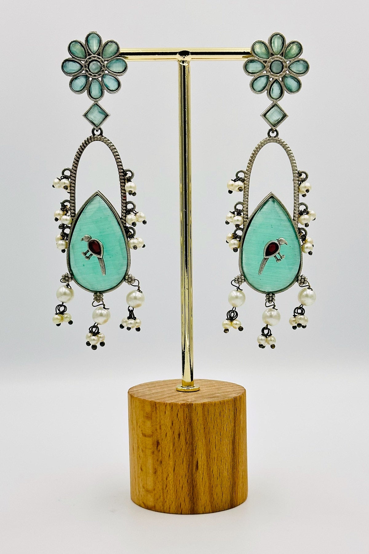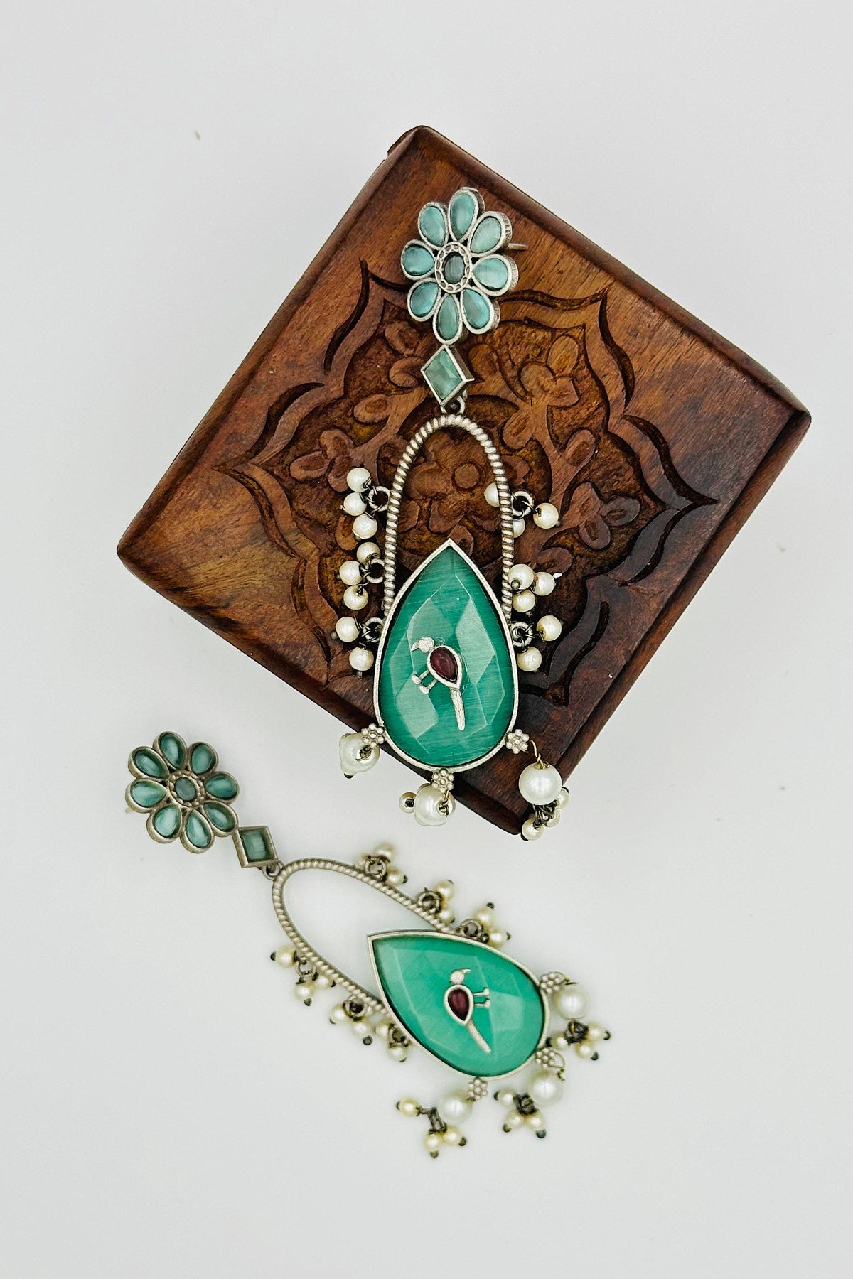 Handcrafted Silver Earrings with Turquoise Blue Crystal Accents and Bird Embellishment - swadeshsouq.com