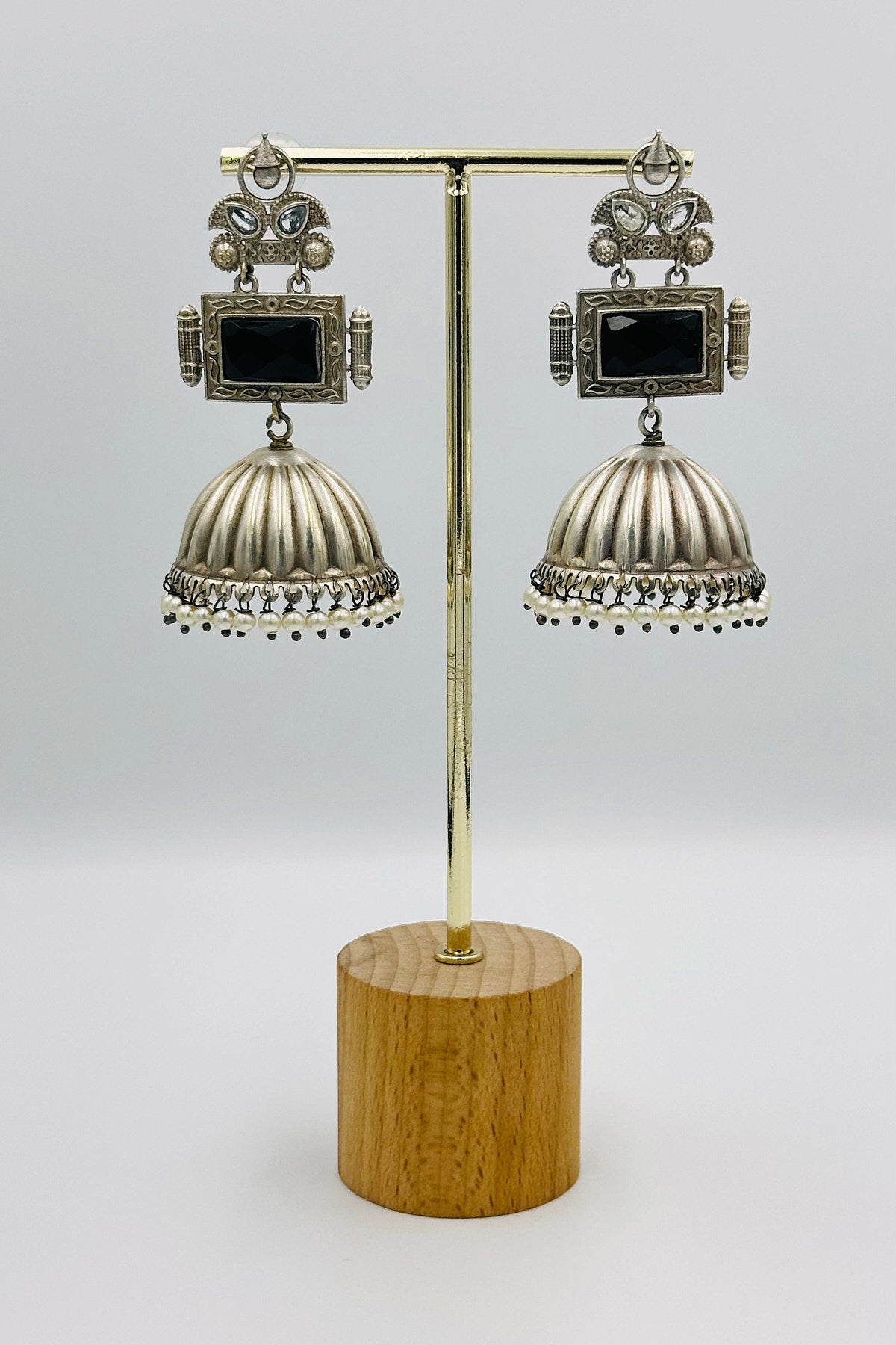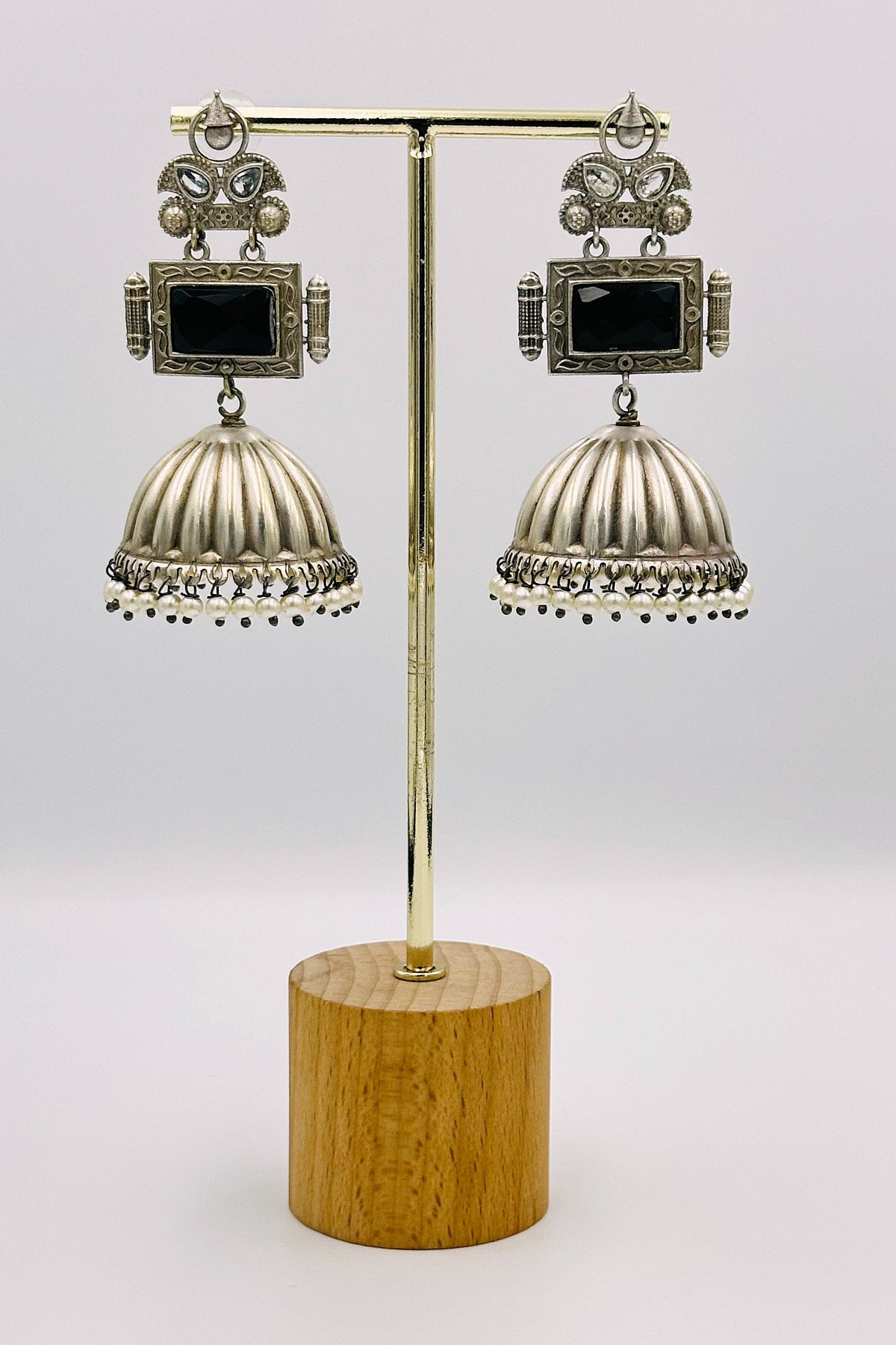 Handcrafted Silver Jhumkas with Black Crystal - swadeshsouq.com