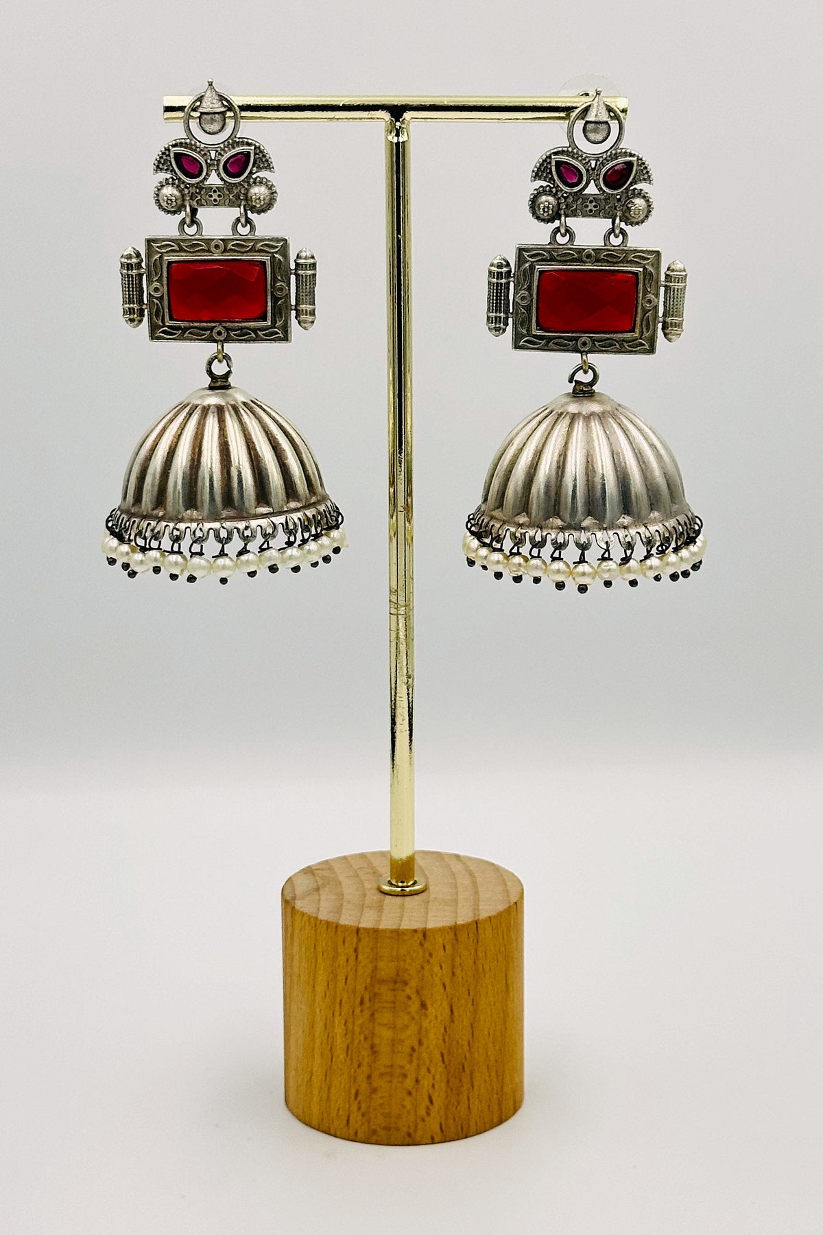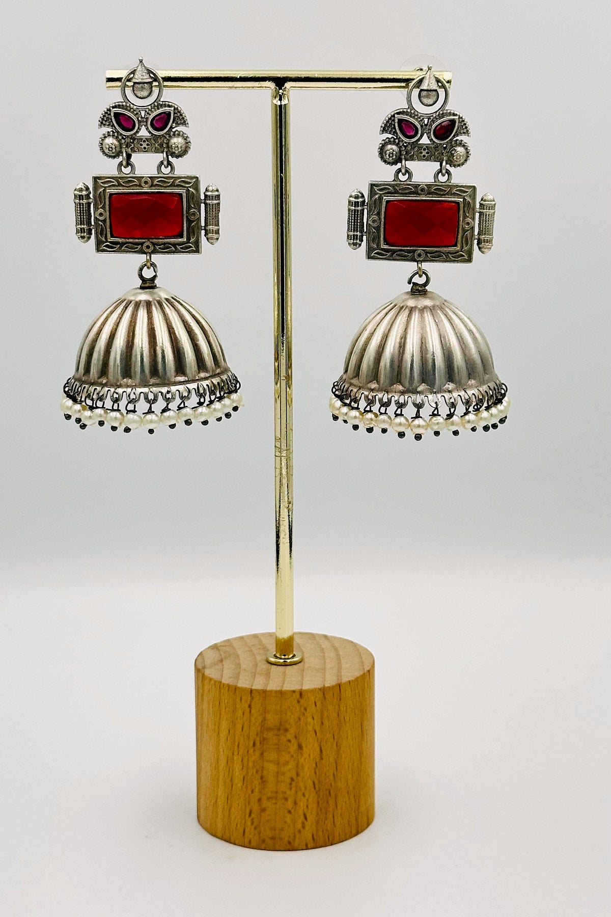 Handcrafted Silver Jhumkas with Deep Red Crystal - swadeshsouq.com