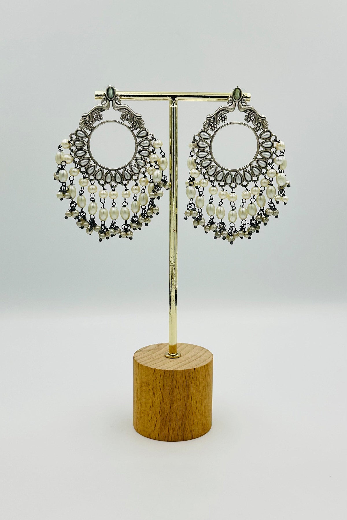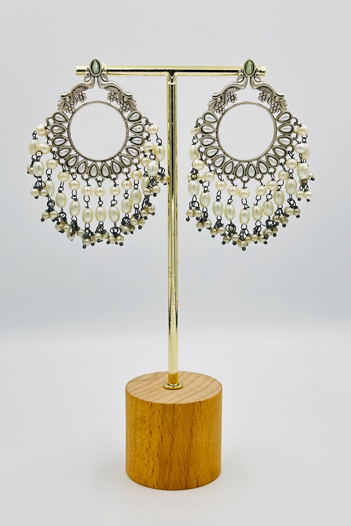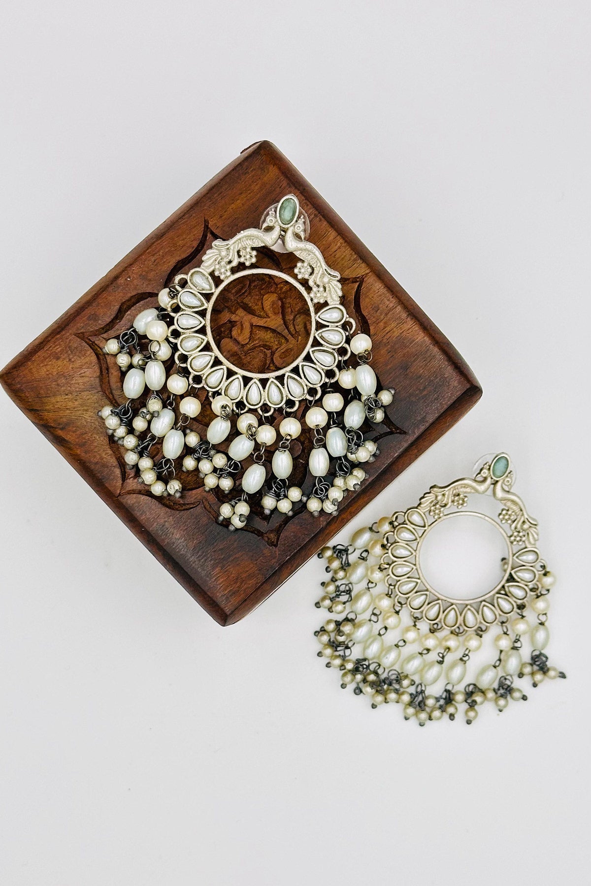 Step into a world of serene elegance with our Mint Majesty Chandbali Earrings. These exquisite earrings feature a delicate mint green hue, beautifully complementing the embossed peacock design that symbolizes grace and vibrancy. Each earring is intricately adorned with lustrous pearls, adding a touch of classic refinement. Graceful strands of beads cascade elegantly, creating a look of timeless sophistication. Perfect for adding a hint of cool, refreshing charm to your ensemble, these earrings are a true testament to exquisite style and craftsmanship.