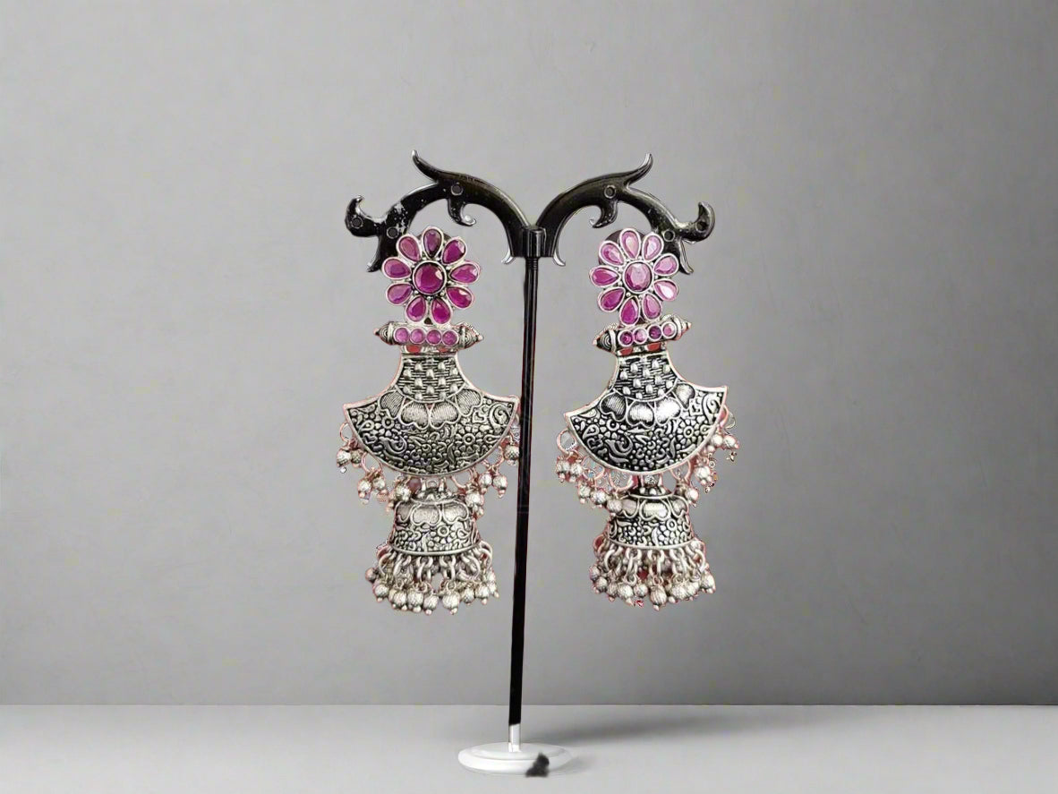 These oxidised silver earrings are the perfect blend of edgy and sophisticated, featuring stunning rubies that add a pop of vibrant red. Expertly crafted using high-quality materials, these earrings are both durable and stylish. The multifaceted rubies catch the light beautifully, creating a stunning effect. These earrings are perfect for both casual and formal occasions, and are sure to elevate any outfit with their sophisticated and stylish aesthetic. Experience the beauty and elegance of these stunning oxidised silver earrings with radiant rubies.