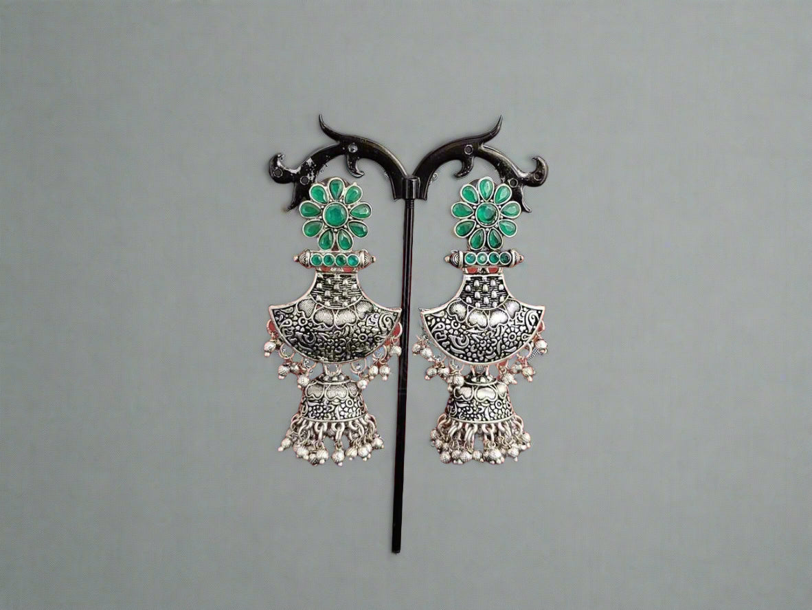 These oxidised silver earrings are the perfect blend of edgy and elegant, featuring stunning emeralds that add a pop of vibrant green. Expertly crafted using high-quality materials, these earrings are both durable and stylish. The multifaceted emeralds catch the light beautifully, creating a showstopping effect. These earrings are perfect for both casual and formal occasions, and are sure to elevate any outfit with their stunning and sophisticated aesthetic. Experience the beauty and elegance of these stunning oxidised silver earrings with vibrant emeralds.