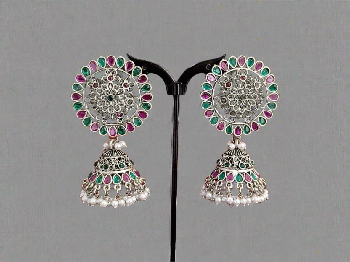 Make a statement with these exquisite oxidised silver jhumka earrings featuring radiant rubies and emeralds. The unique oxidised silver finish creates a bold and edgy look that perfectly complements the vibrant colors of the gemstones.