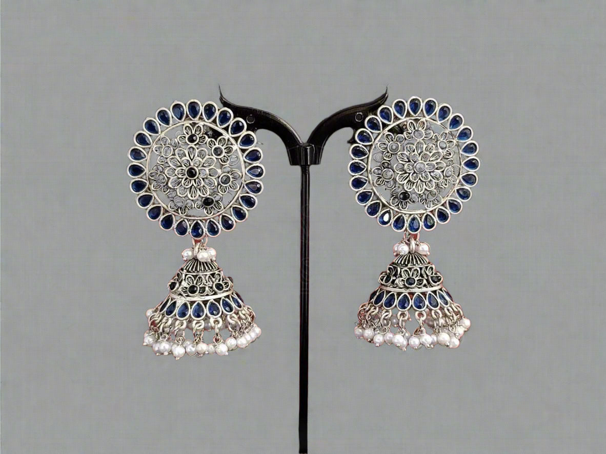 These oxidised silver jhumka earrings are a beautiful blend of edgy and elegant, featuring stunning sapphire blue detailing that adds a pop of vibrant color. Expertly crafted using high-quality materials, these earrings are both durable and stylish. The intricate detailing and stunning blue stones create a mesmerizing effect that is sure to capture attention. These earrings are perfect for both casual and formal occasions, and are sure to elevate any outfit with their sophisticated and stylish aesthetic. Experience the beauty and elegance of these stunning oxidised silver jhumka earrings with sapphire blue detailing.