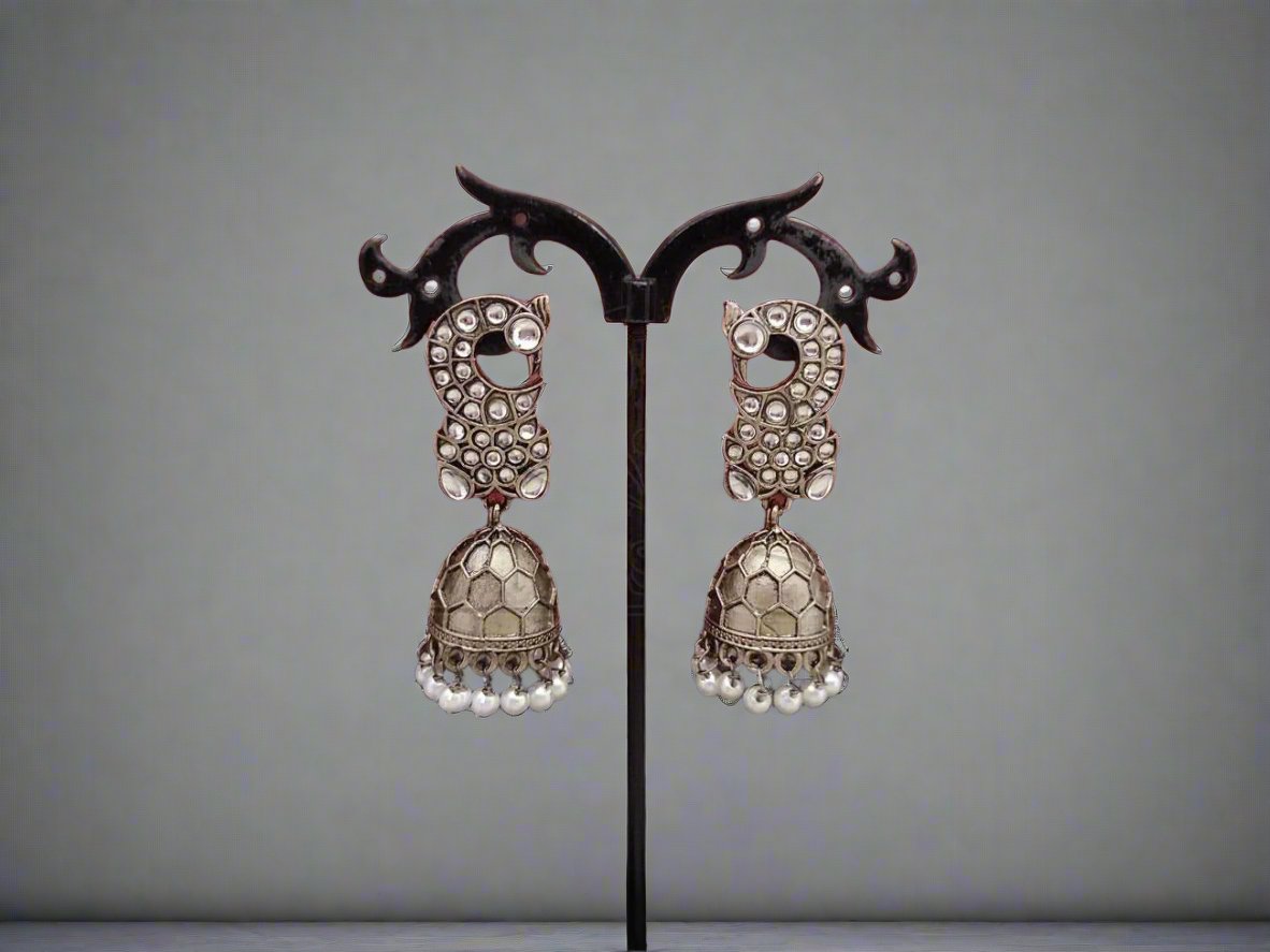 These oxidised silver jhumkas feature an intricately carved peacock design and delicate white stone embellishment, creating a sophisticated and nature-inspired look. The jhumka shape adds movement and playfulness to the design, while the oxidised silver finish adds a touch of elegance and modernity. Versatile enough to be worn with both casual and formal attire, these earrings are a must-have accessory for any jewelry collection. The white stones catch the light beautifully, adding a subtle sparkle to the design.