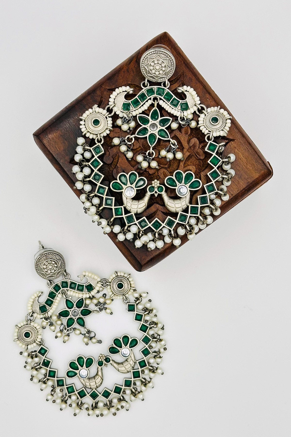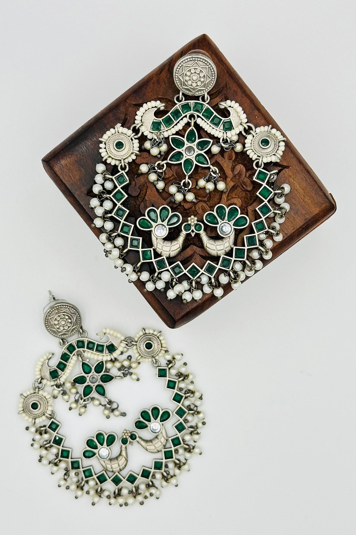 Pearl and Green Stone Peacock Chandbali Earrings - swadeshsouq.com