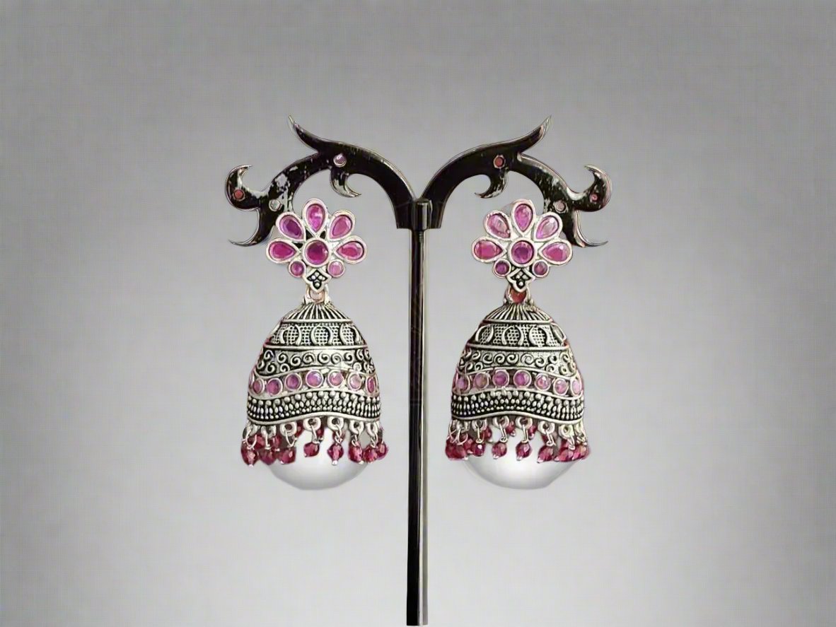 Ruby Embossed Oxidised Silver Jhumkas.