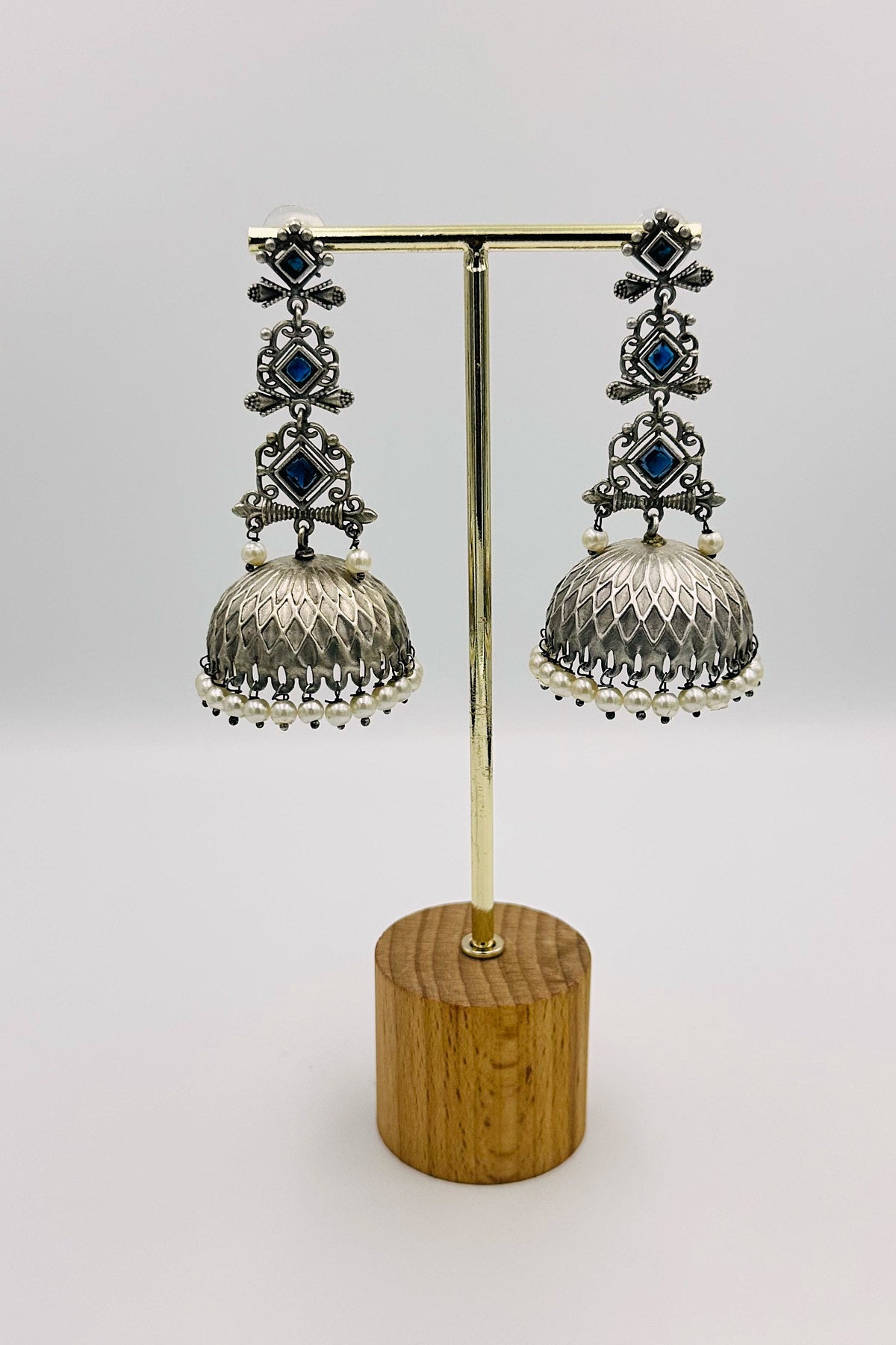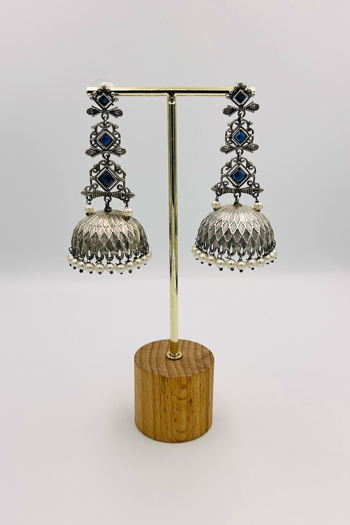 Adorn yourself with the mesmerizing charm of our Sapphire Symphony Jhumkas. These exquisite earrings showcase vibrant blue stones and delicate pearls set in an intricate silver jhumka design, radiating elegance with every movement.