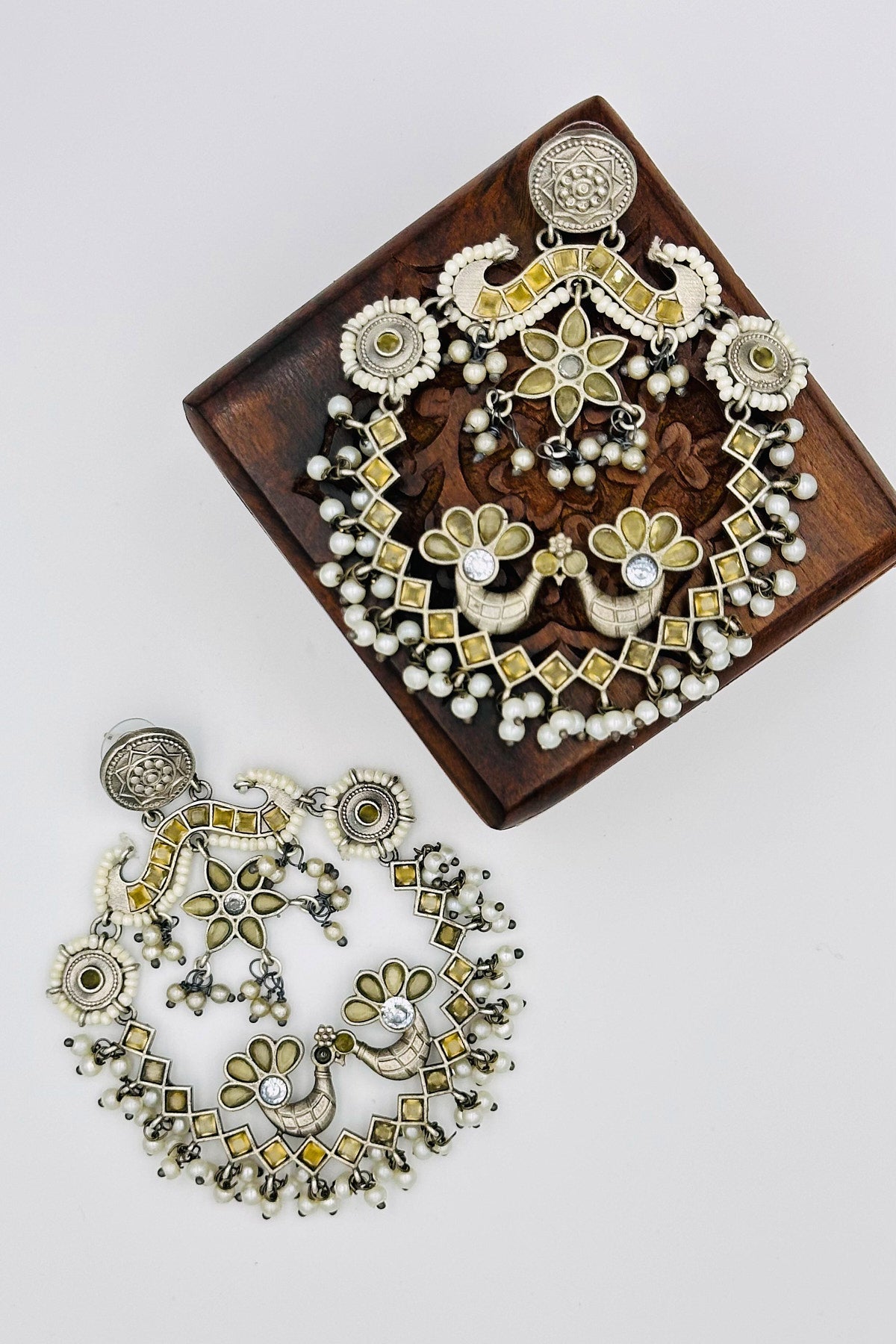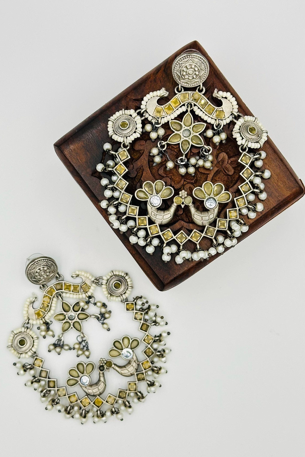 Indulge in the resplendent charm of our Silver Chandbali Earrings adorned with pearls and luminous yellow stones. These exquisite earrings feature an intricately embossed peacock design, effortlessly blending tradition with contemporary style. Elevate your elegance and add a touch of sunshine to your ensemble with these captivating treasures.