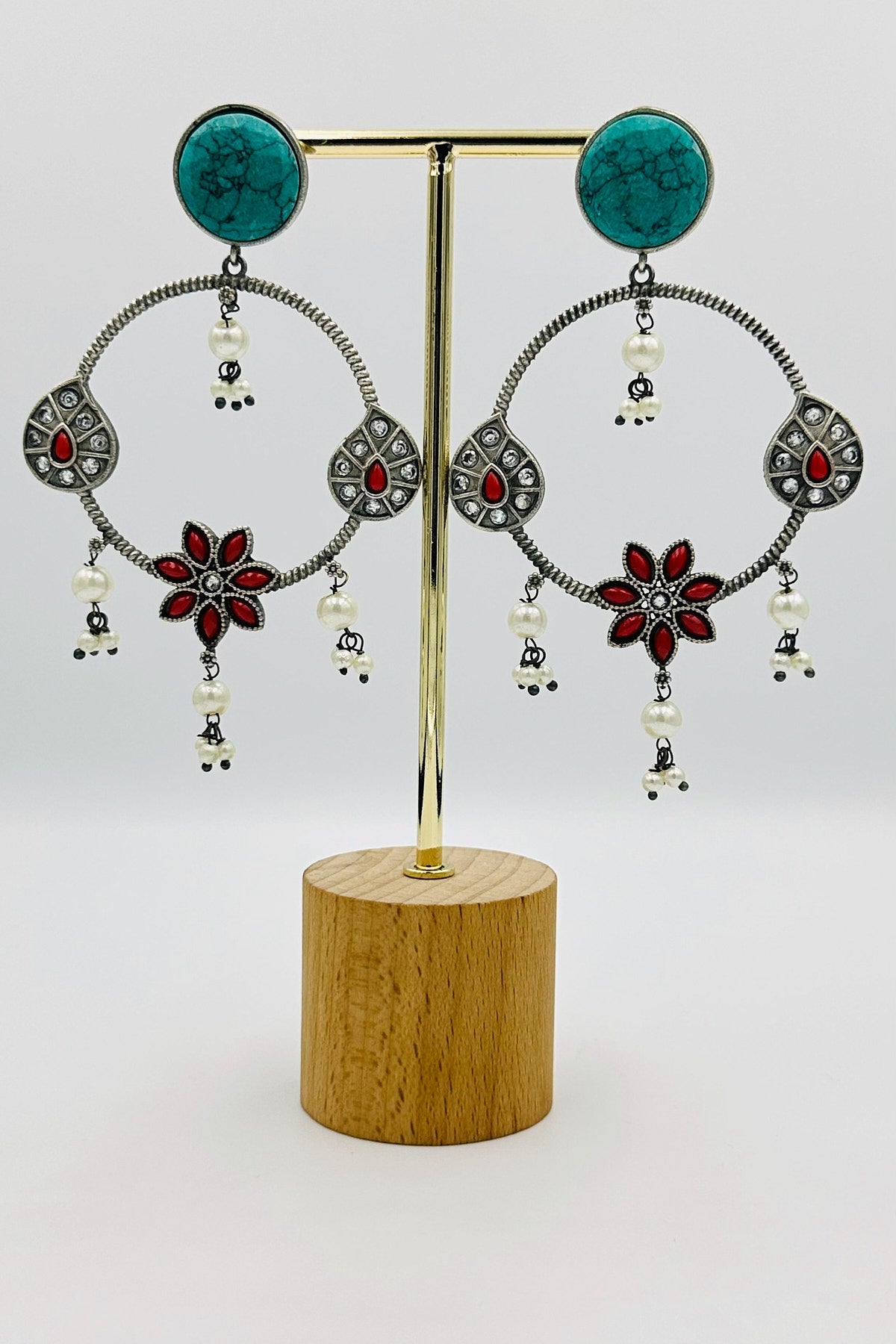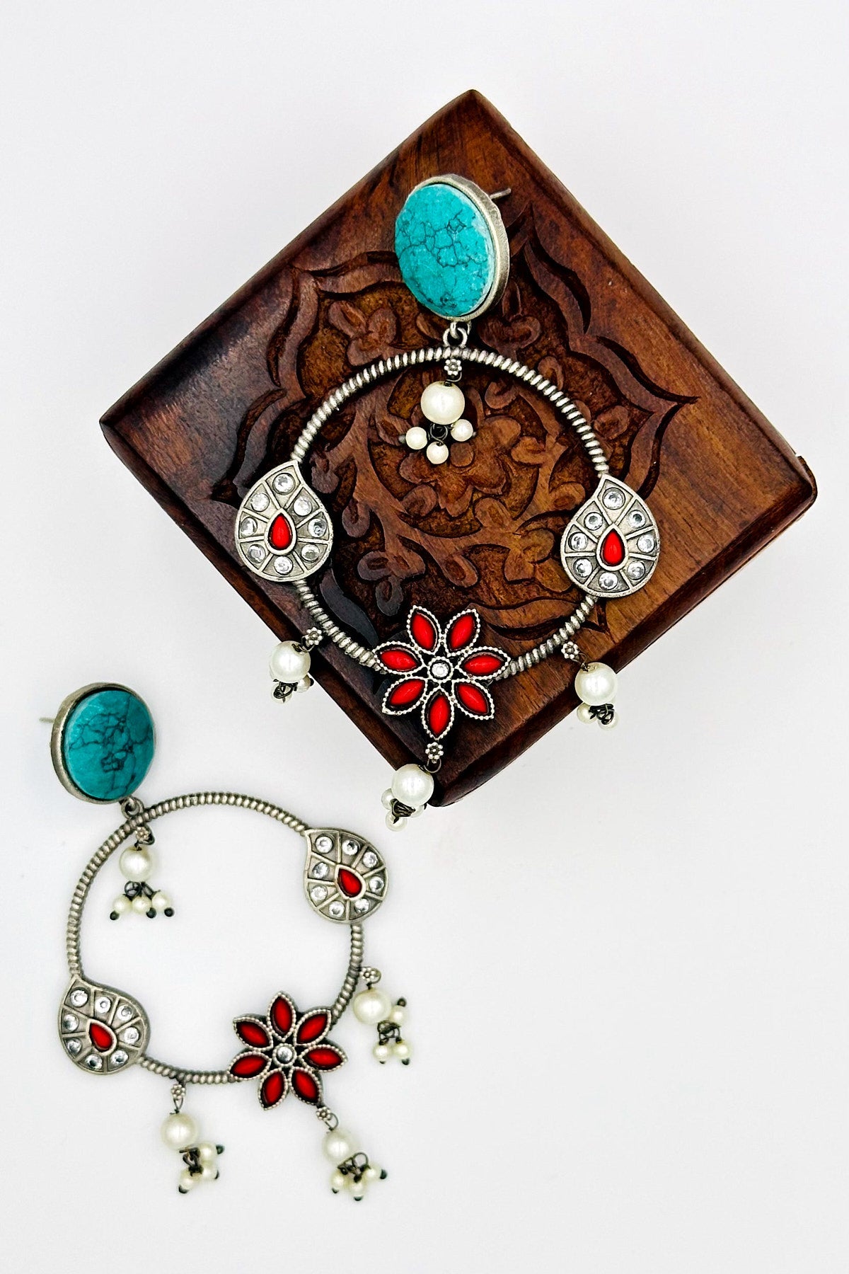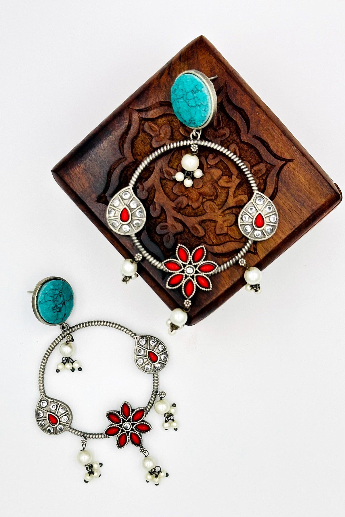 Indulge in the allure of 'Turquoise Temptation' with our silver danglers featuring an enchanting feroza and passionate red floral design. These earrings are a masterpiece of artistry, capturing the vibrant beauty of nature's most captivating colors. Elevate your style with the exquisite charm of these silver danglers, perfect for making a bold and stylish statement.