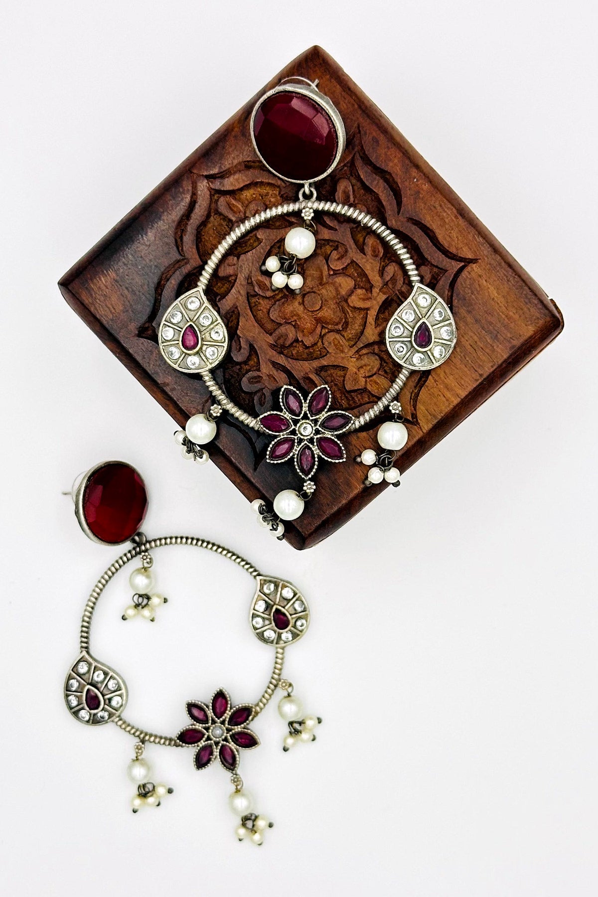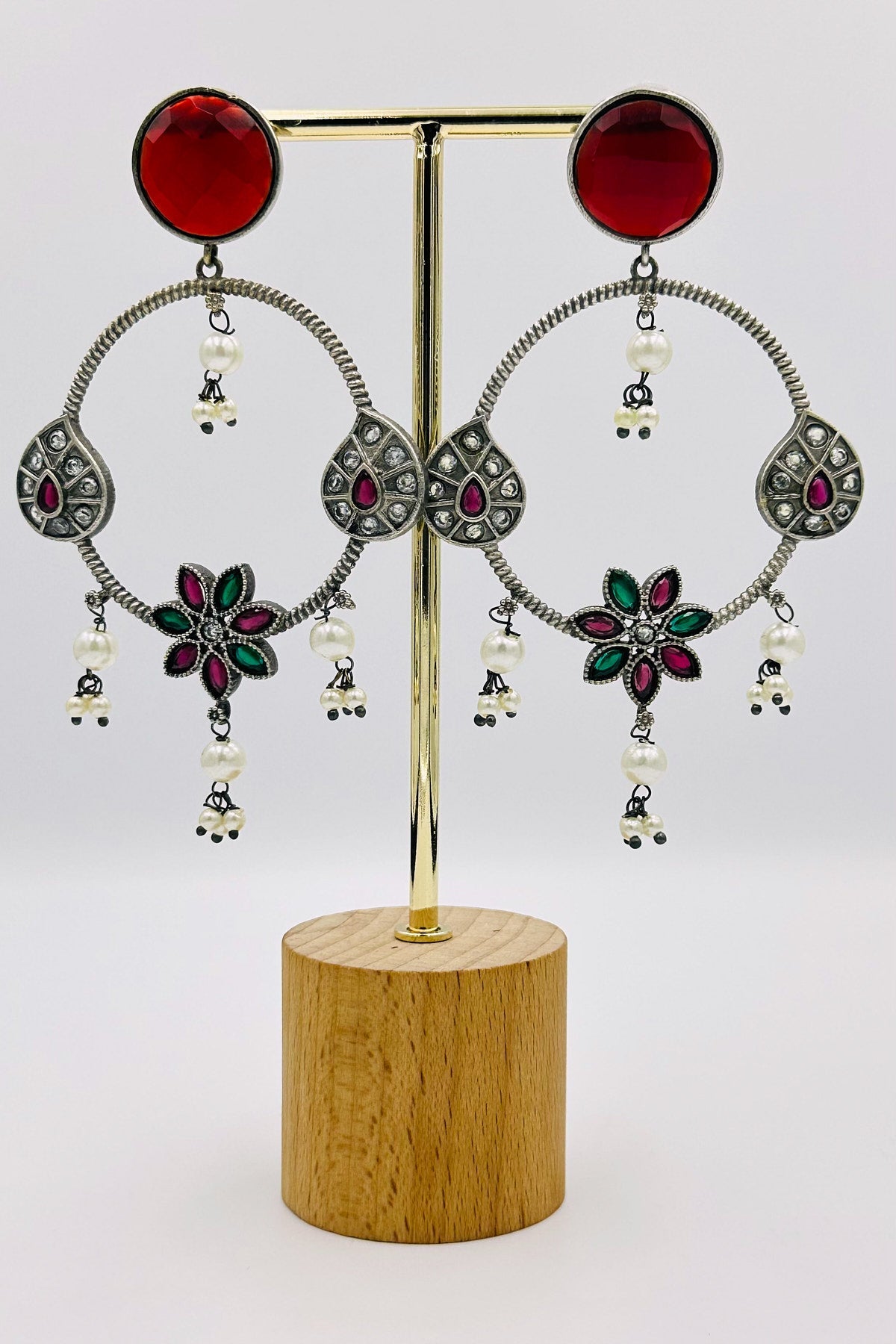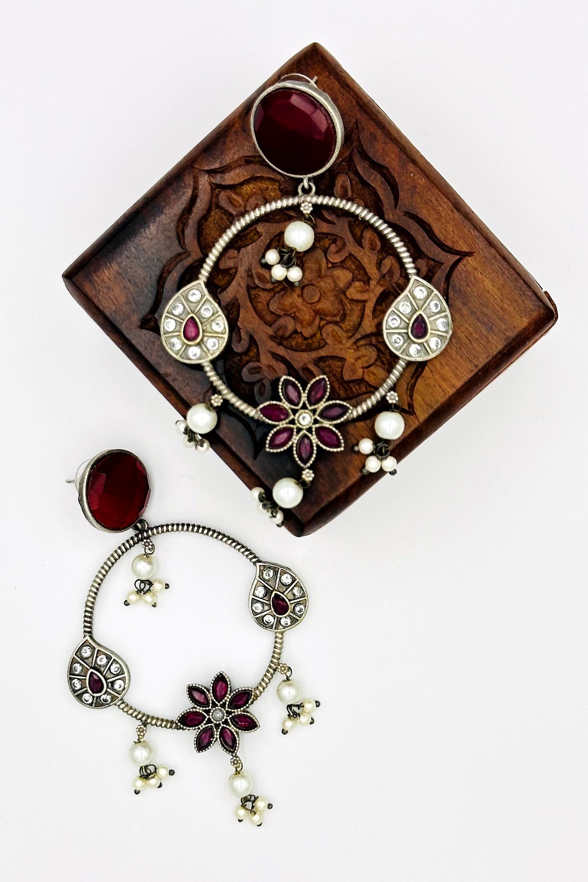 Silver Danglers in Striking Red Floral Design - swadeshsouq.com