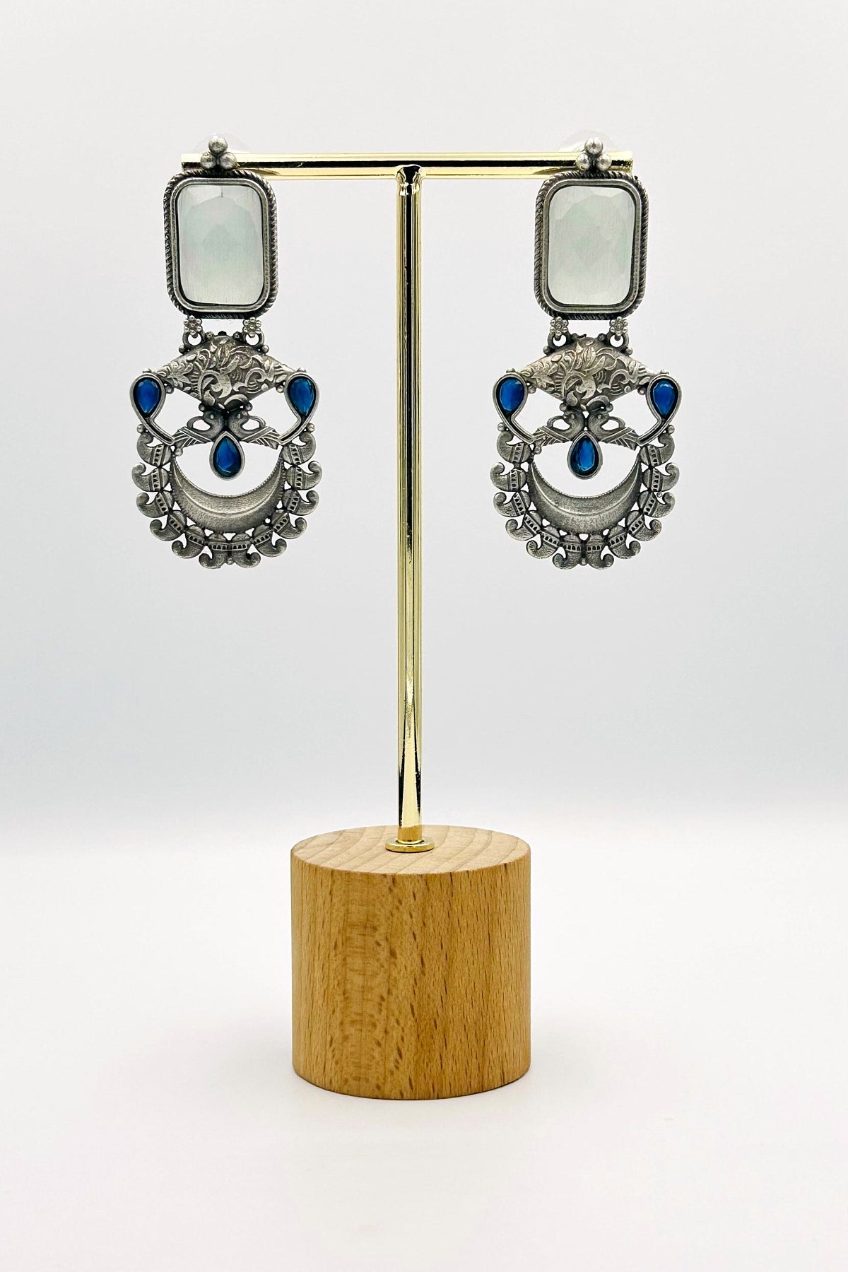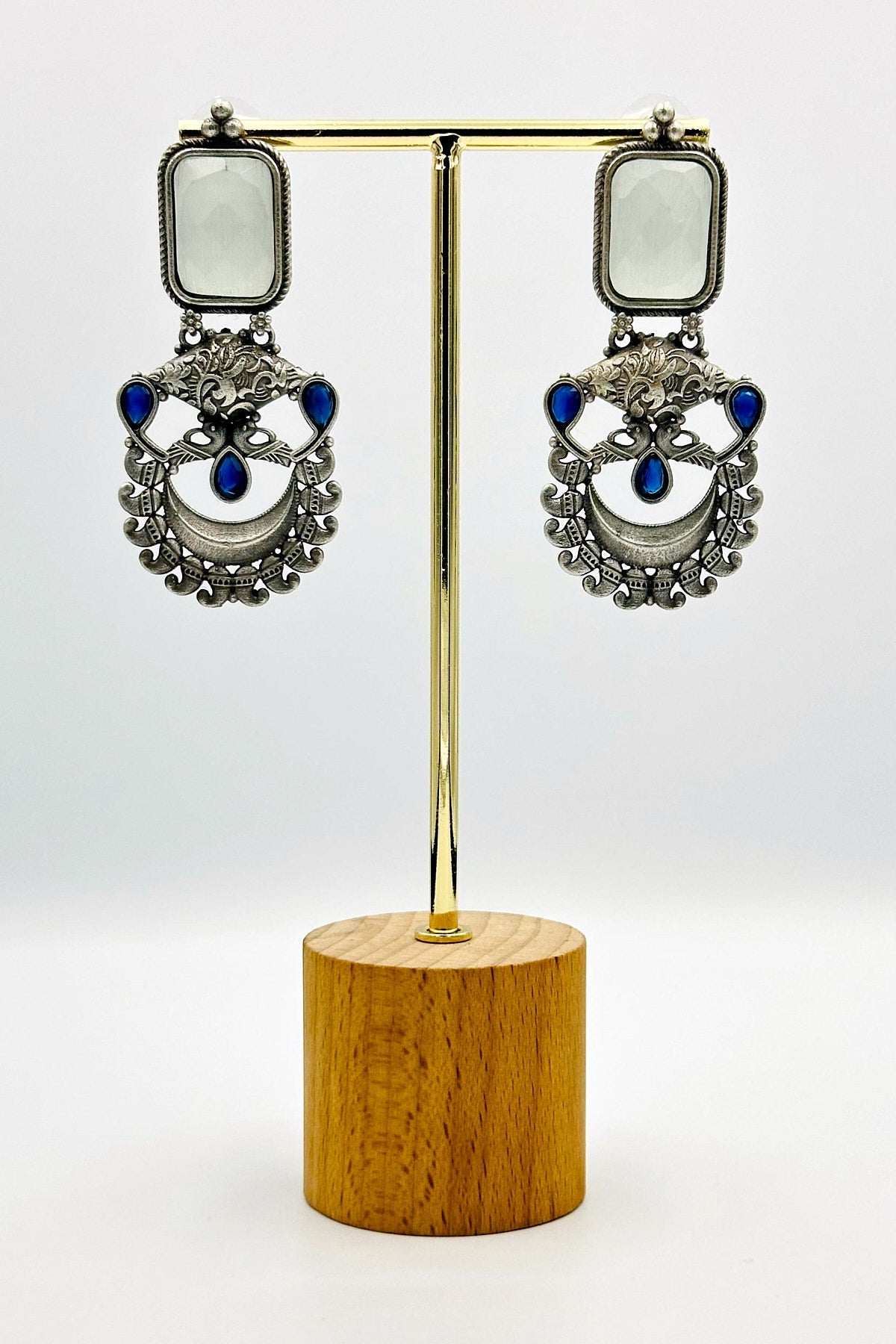 Discover the understated elegance of 'Slate & Sapphire Splendor' with our meticulously crafted silver earrings. These earrings feature intricate designs and are adorned with serene grey and captivating blue stones, creating a harmonious blend of colors that exudes sophistication. Elevate your style effortlessly, as these earrings seamlessly combine tradition with modernity, making them perfect for any occasion. Leave a lasting impression with their refined beauty.