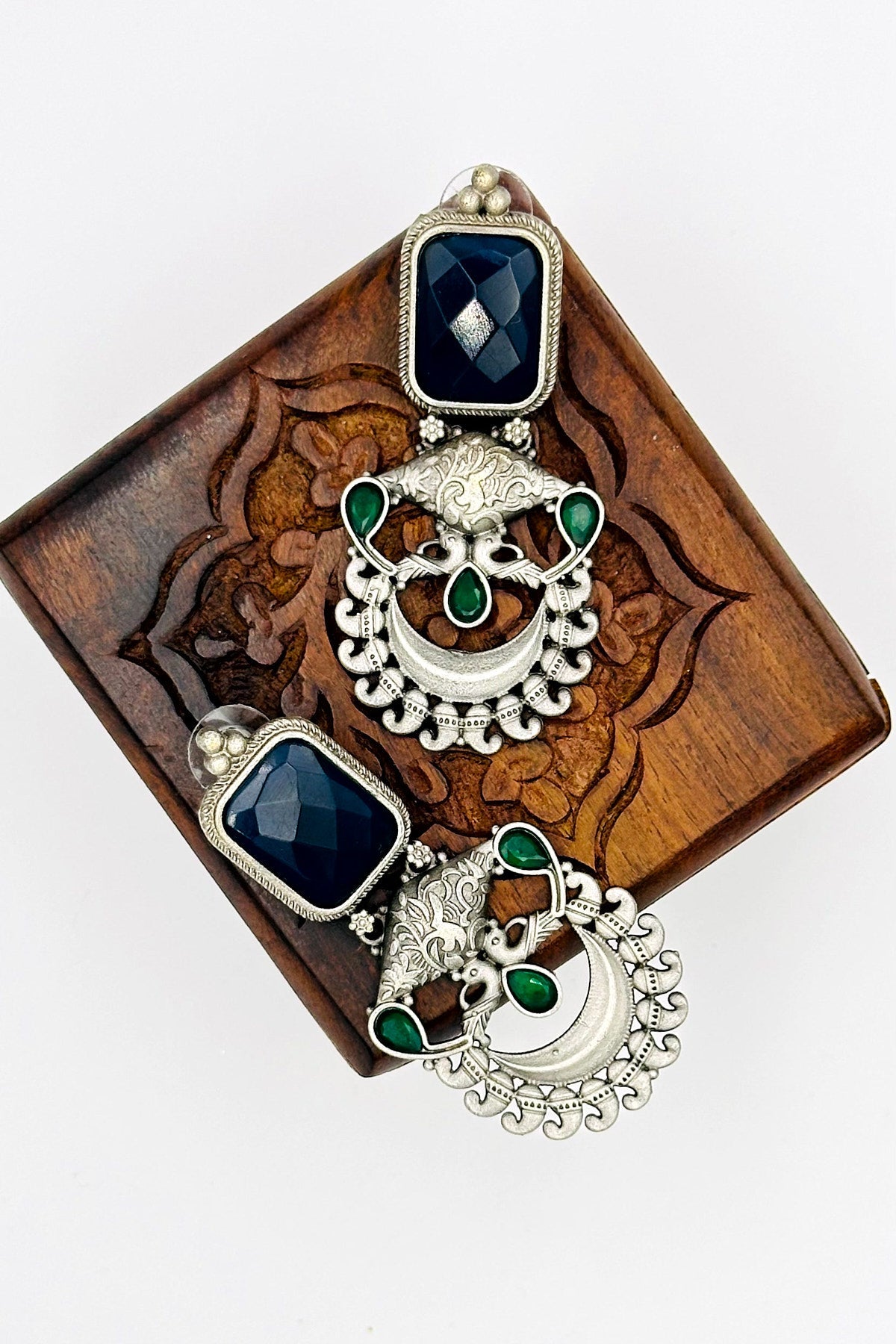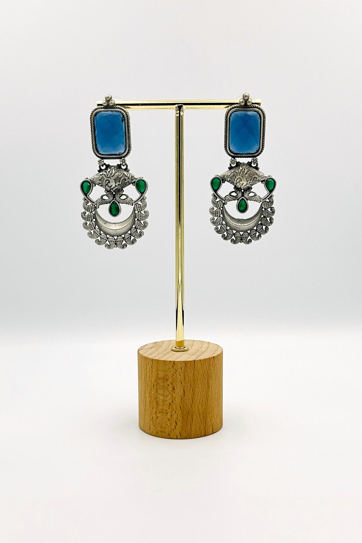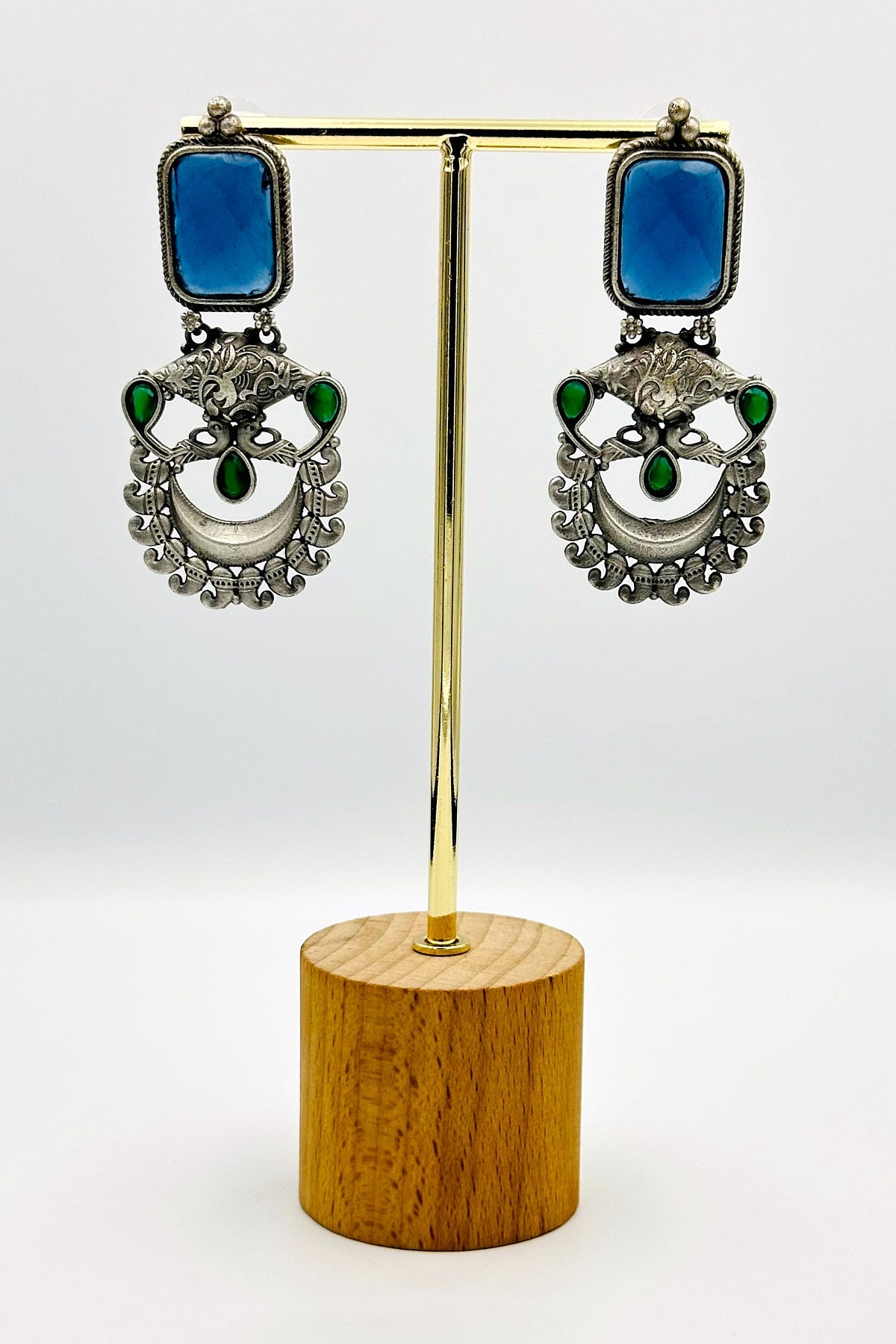 Silver Earrings with Intricate Blue and Green Stones - swadeshsouq.com
