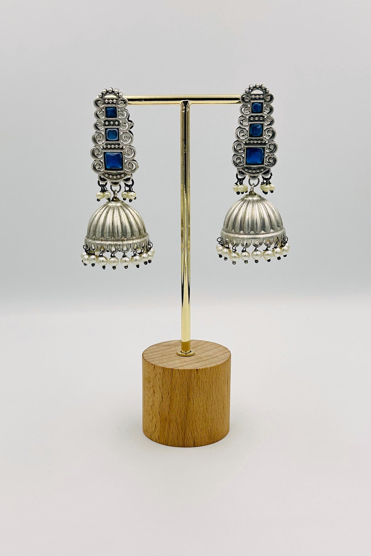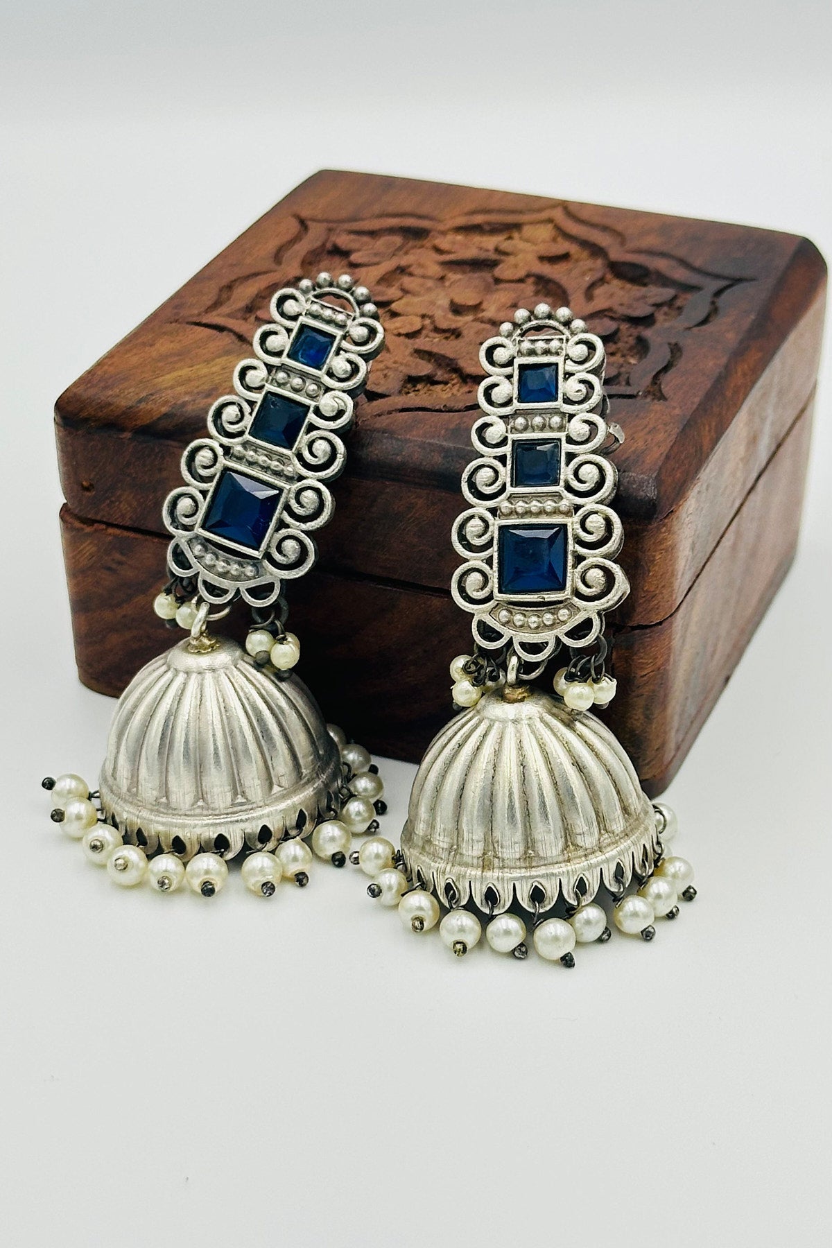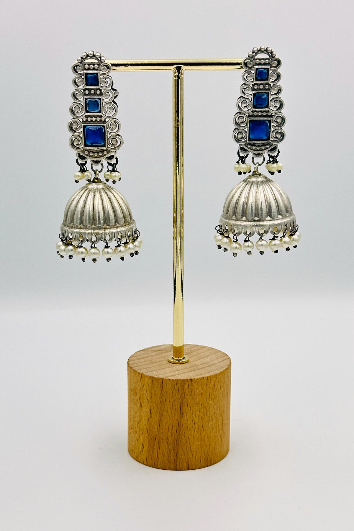 Silver Jhumkas with Blue Stones and Pearls