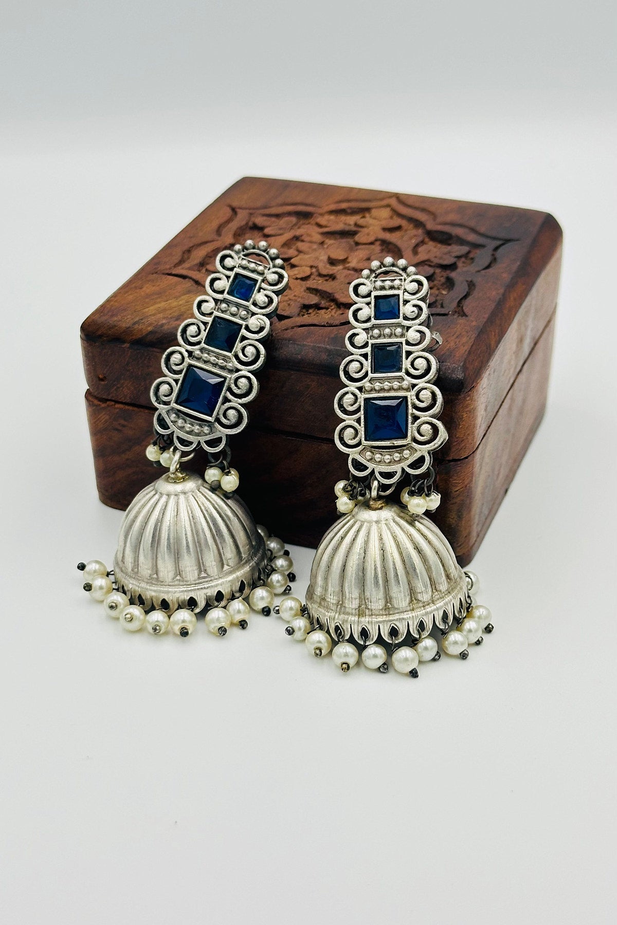 Silver Jhumkas with Blue Stones and Pearls - swadeshsouq.com