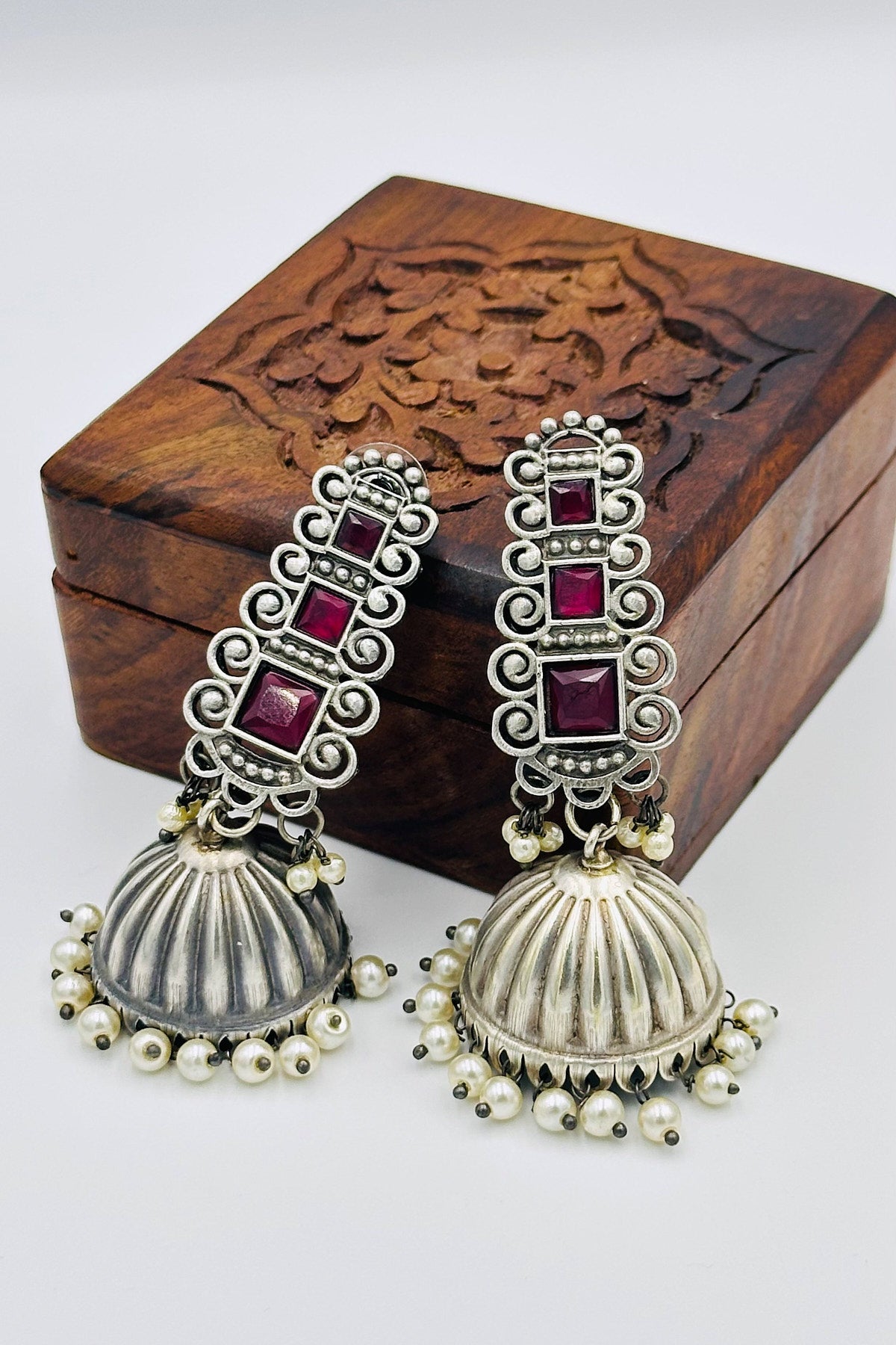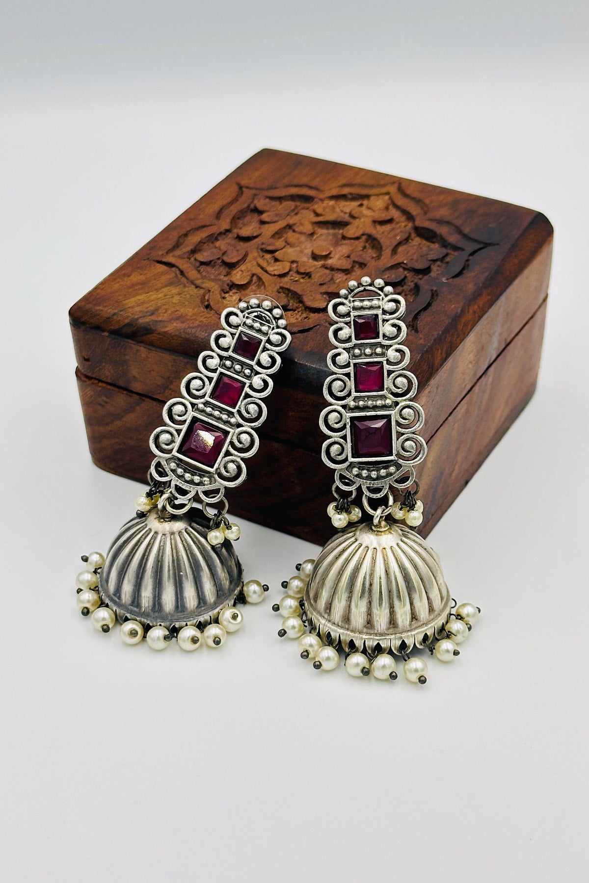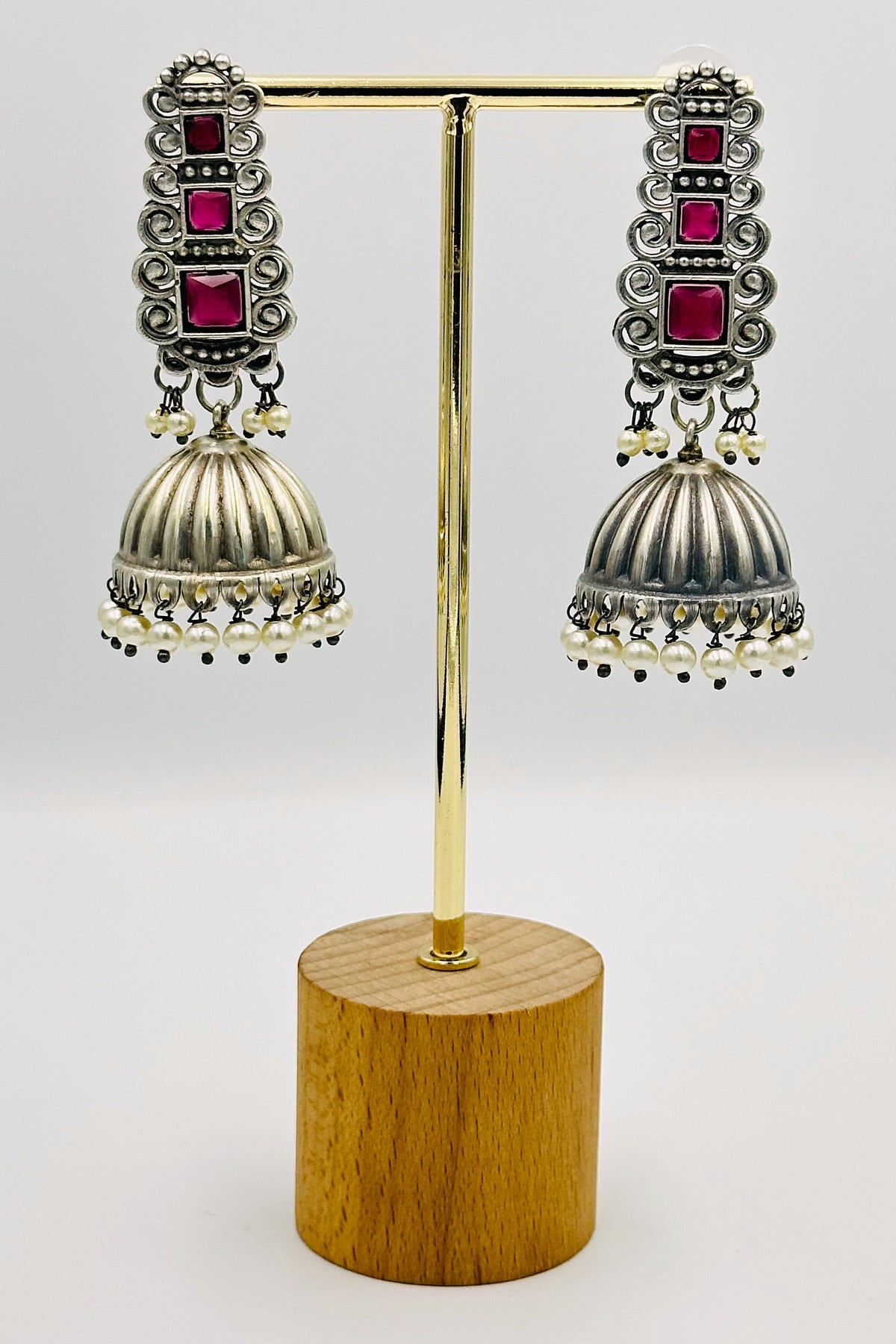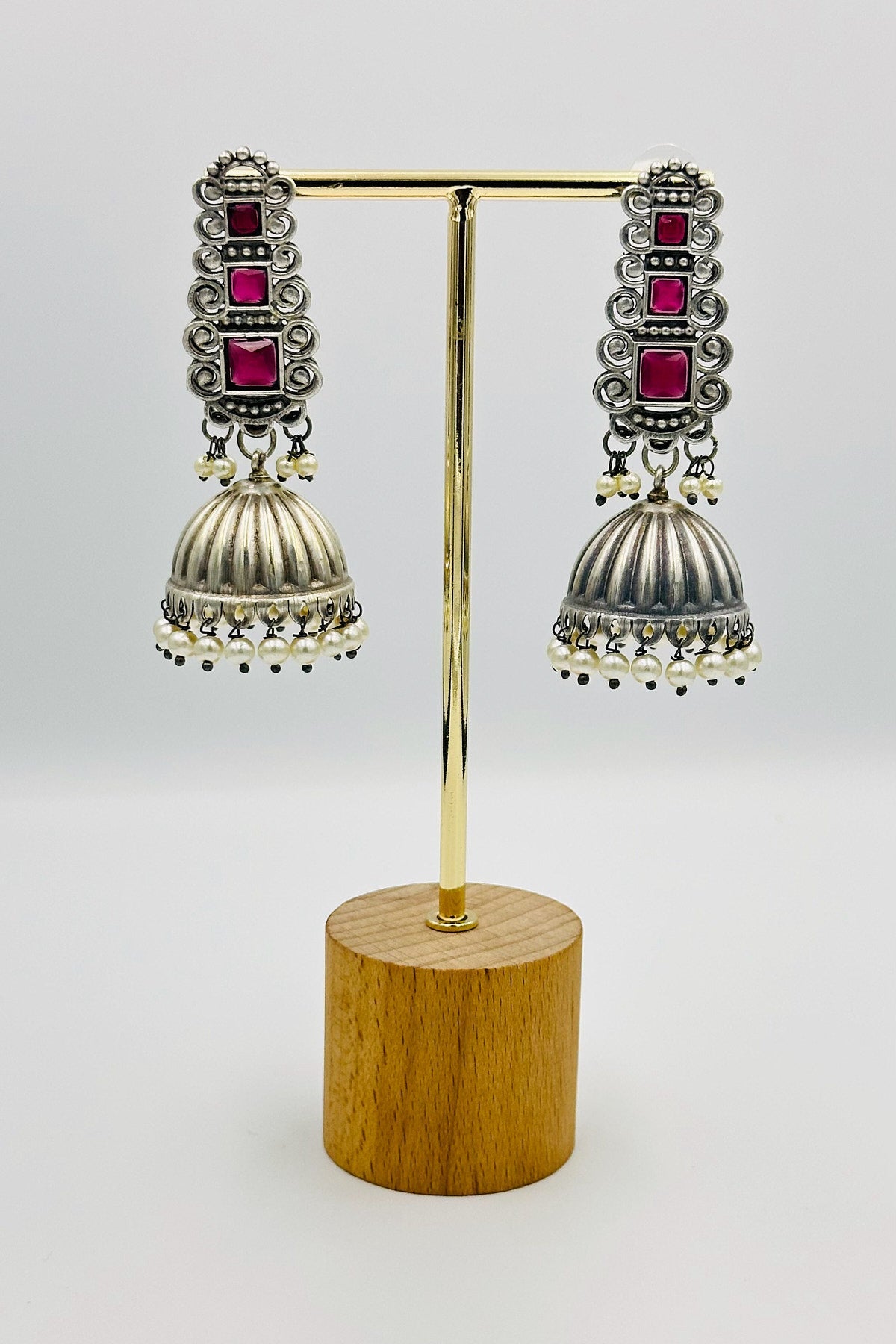 Elevate your style with our "Magenta Majesty" Silver Jhumkas, adorned with stunning magenta stones and lustrous pearls. These earrings effortlessly combine tradition with contemporary elegance, making them a versatile choice for any occasion. Embrace the captivating allure of magenta and pearls, leaving a lasting impression of regal charm and sophistication wherever you go.