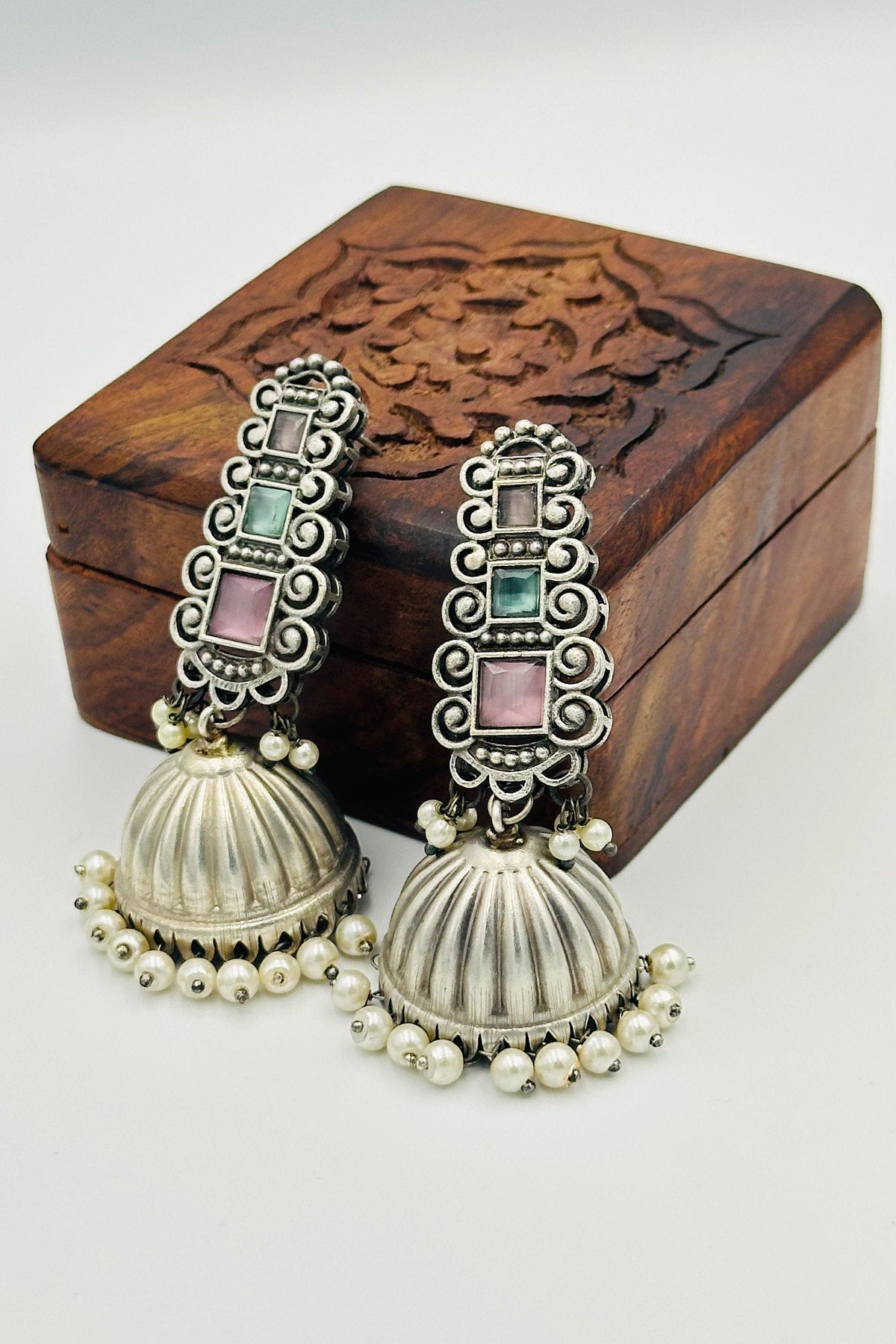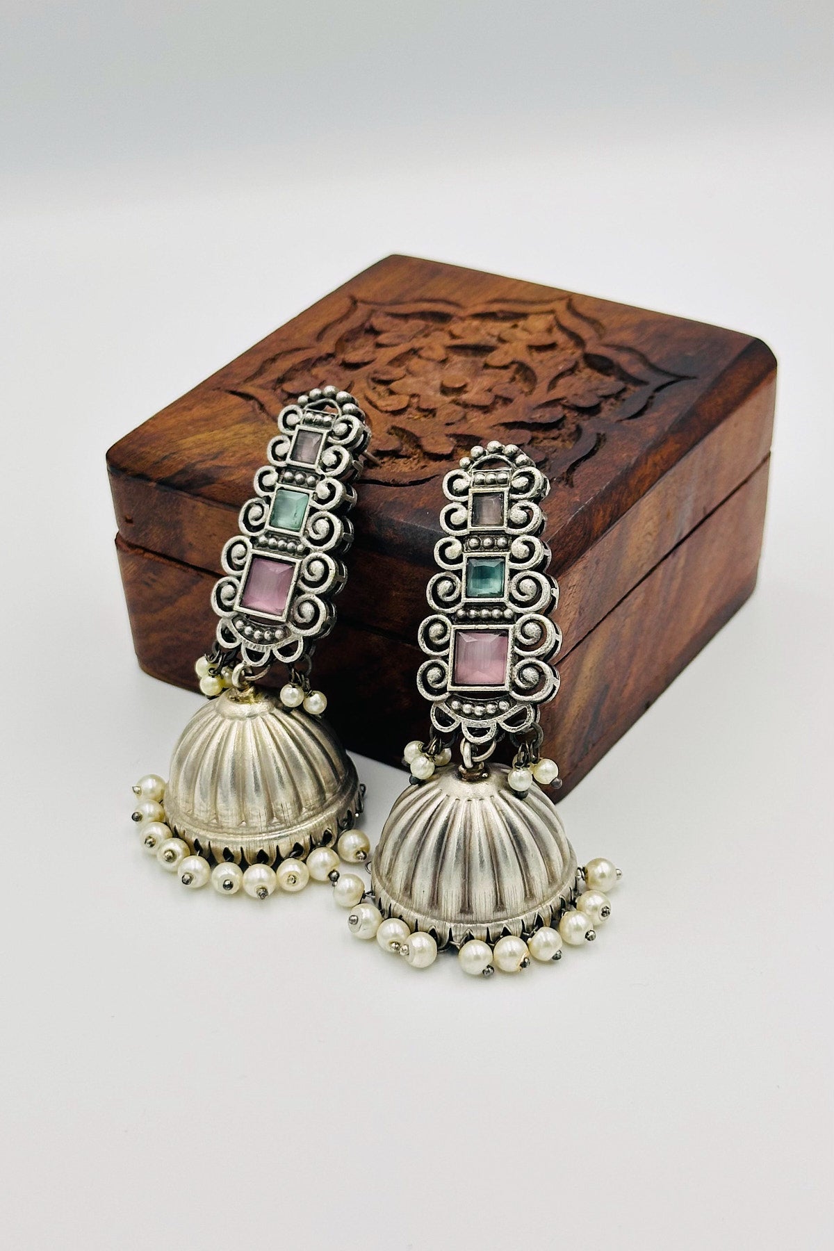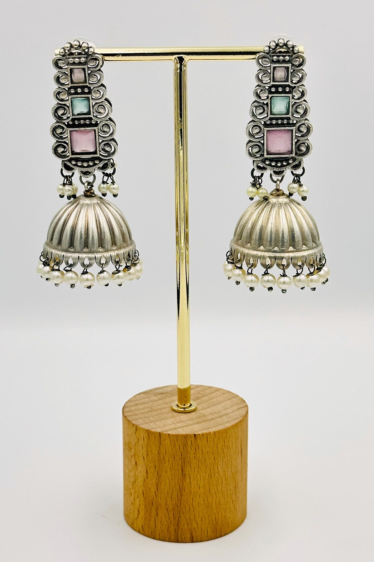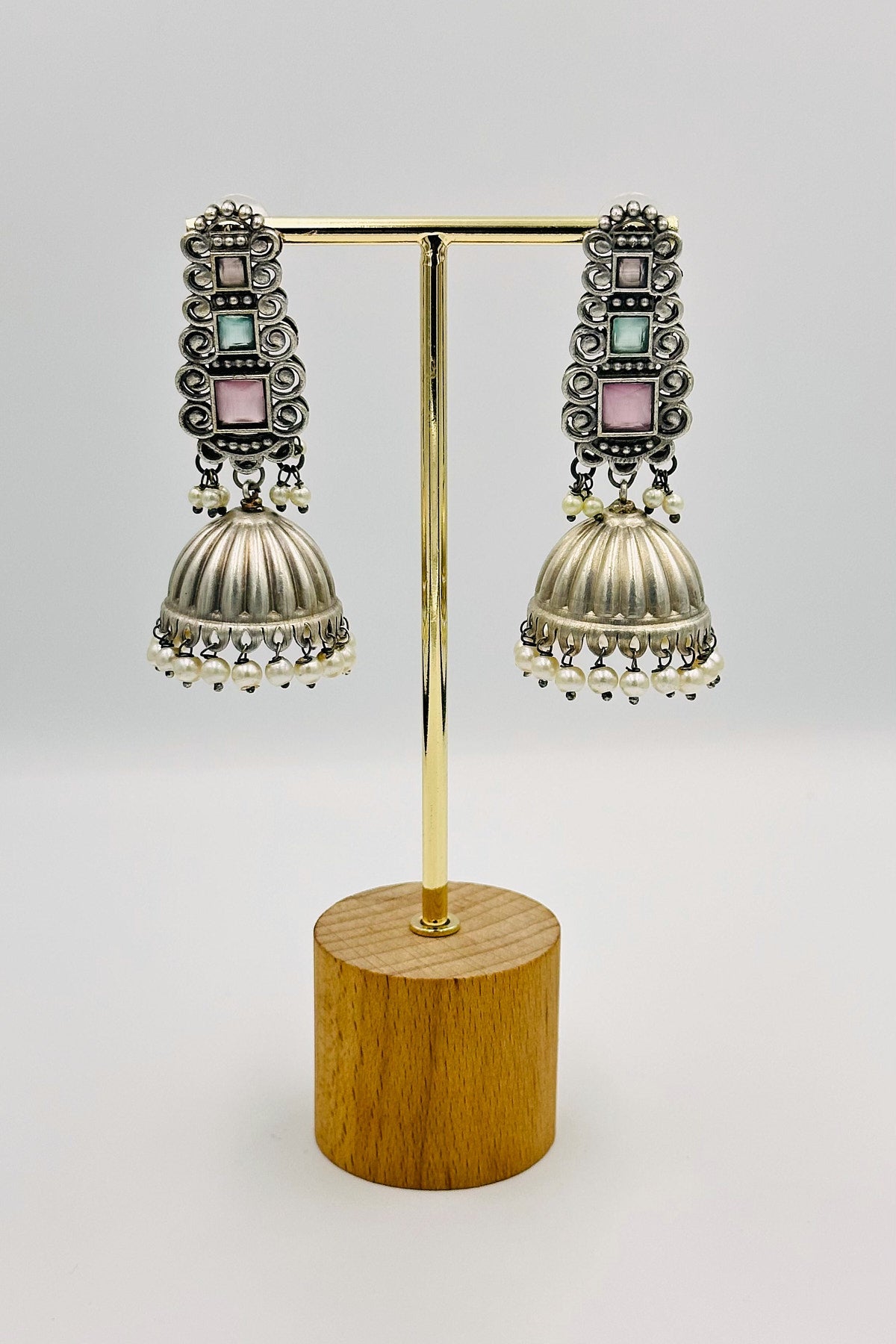 Silver Jhumkas with Soft Pink and Blue Stones and Pearls - swadeshsouq.com