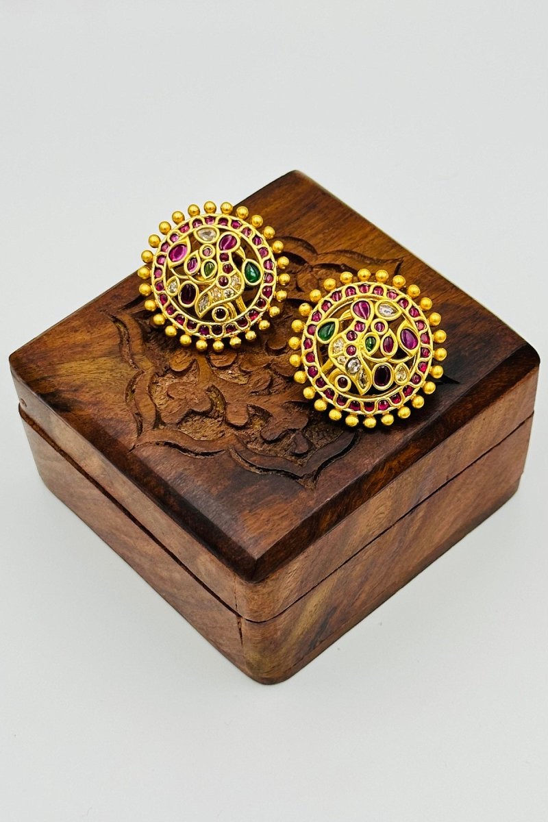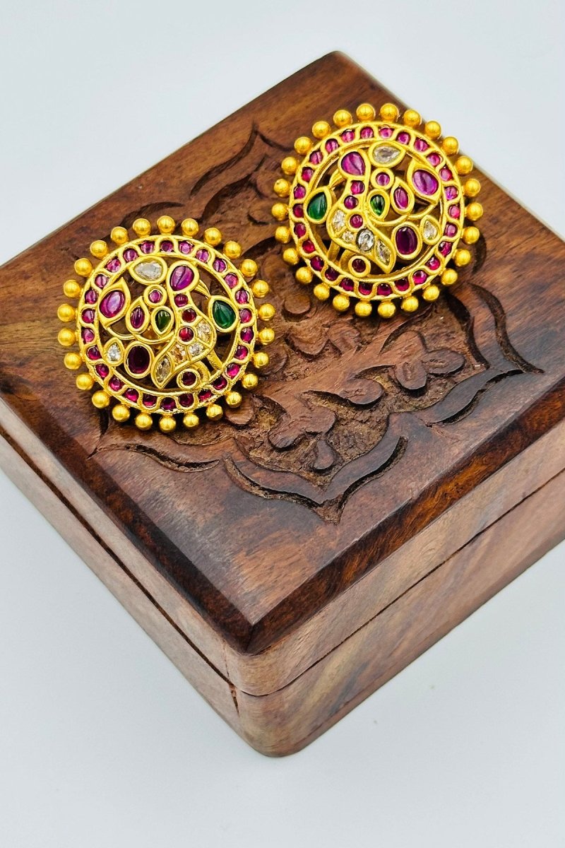 Traditional Gold - Tone Round Stud Earrings with Vibrant Gemstone Accents - swadeshsouq.com