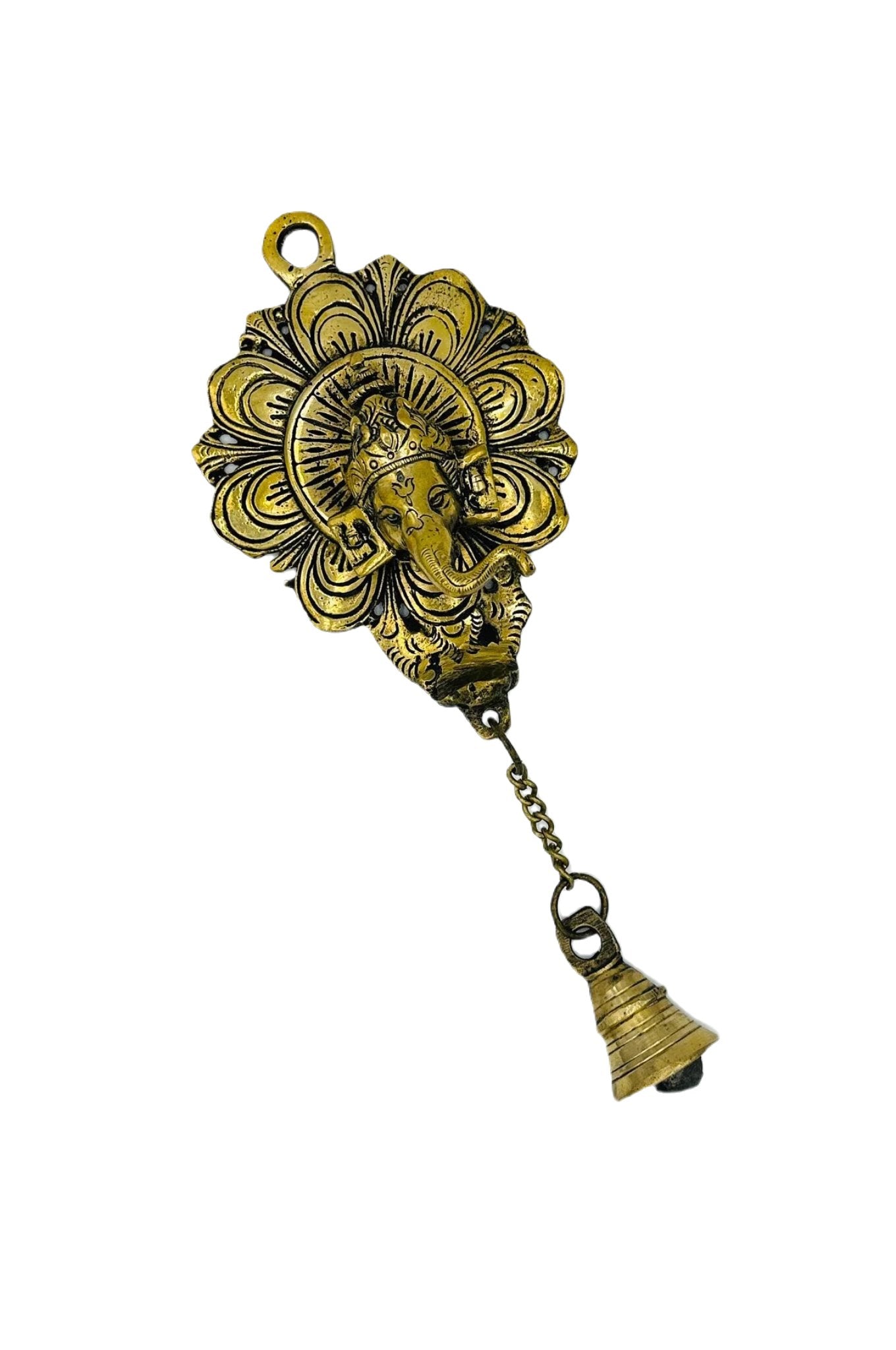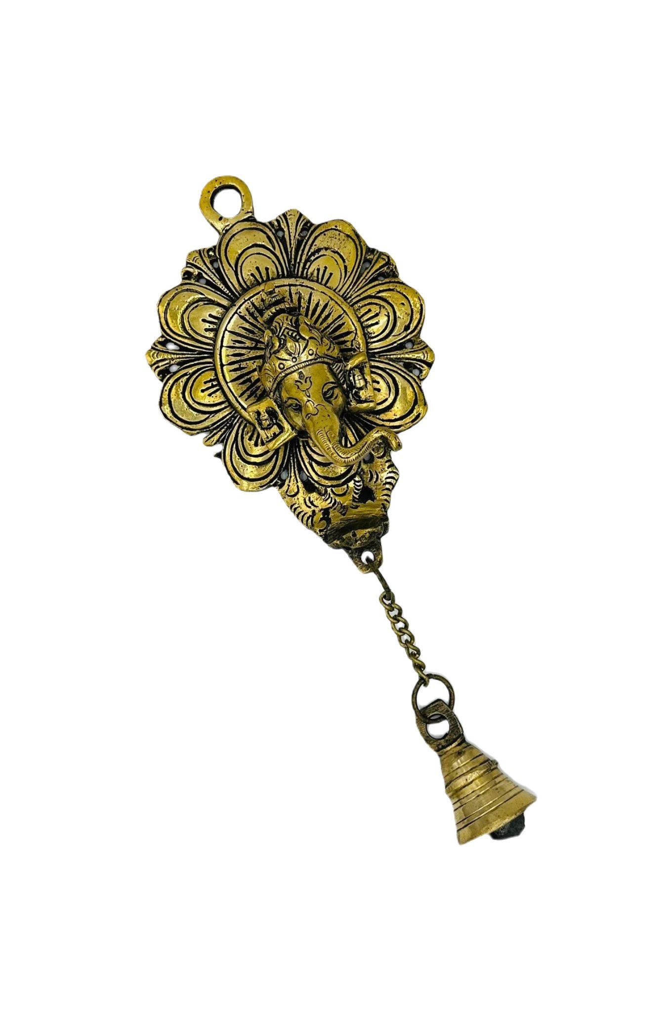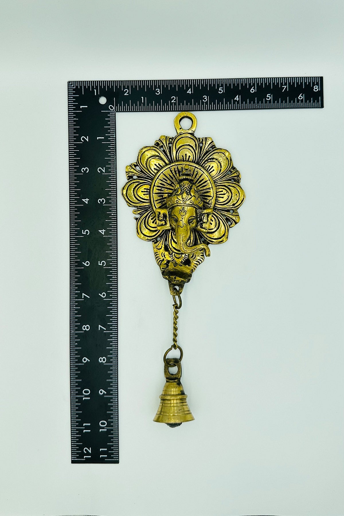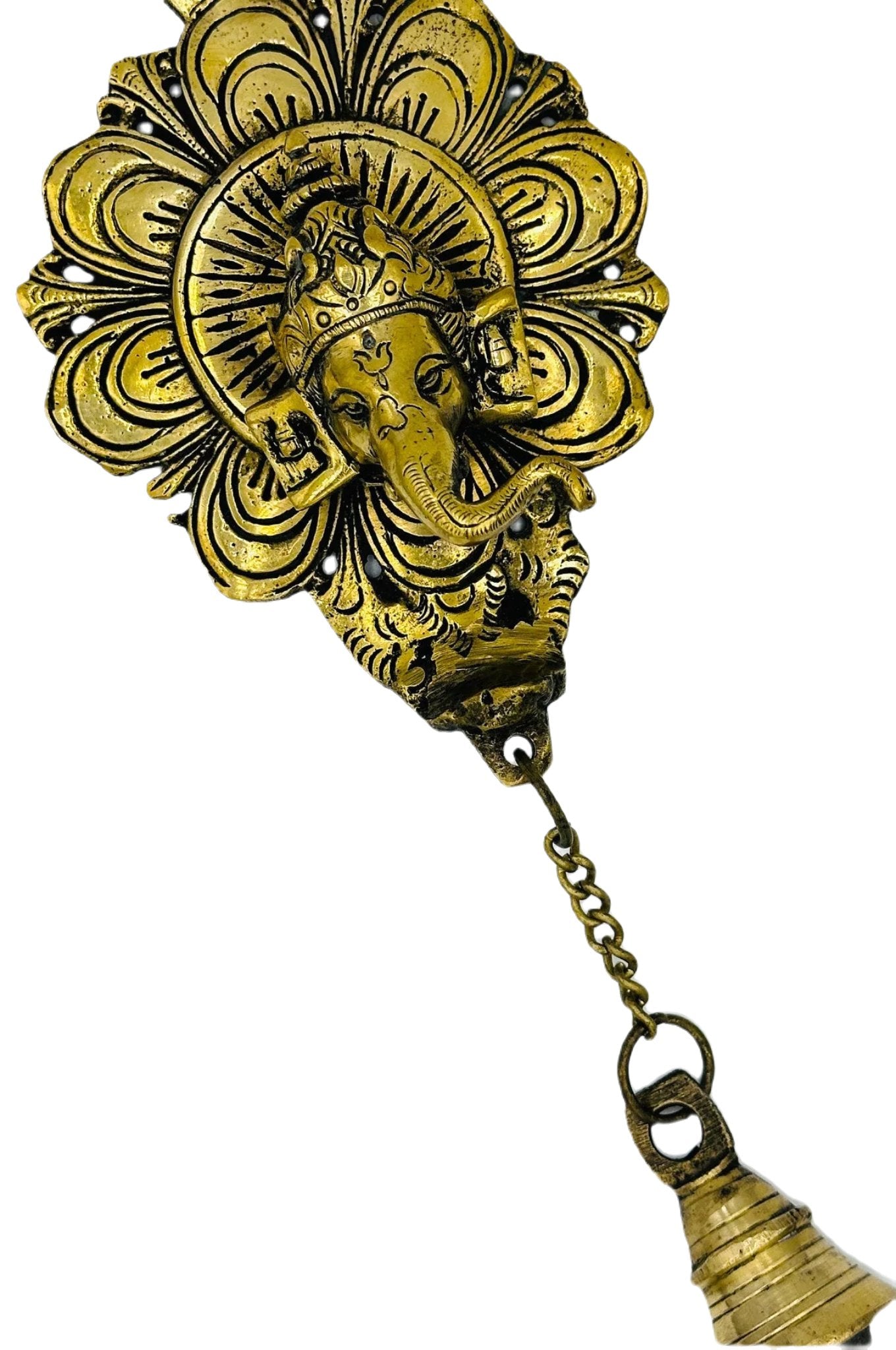 Elevate your space with our exquisite Brass Ganesh Face Door/Wall Hanging. This finely crafted piece features Lord Ganesh on a beautiful flower, complete with a delicate hanging bell. It adds charm, protection, and a touch of spirituality to your home decor.