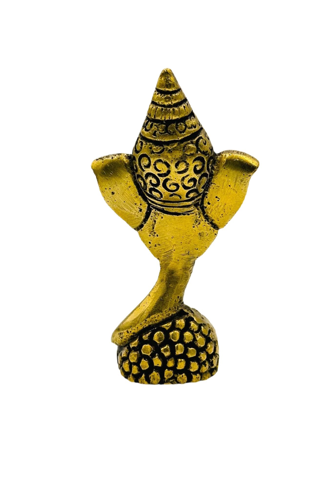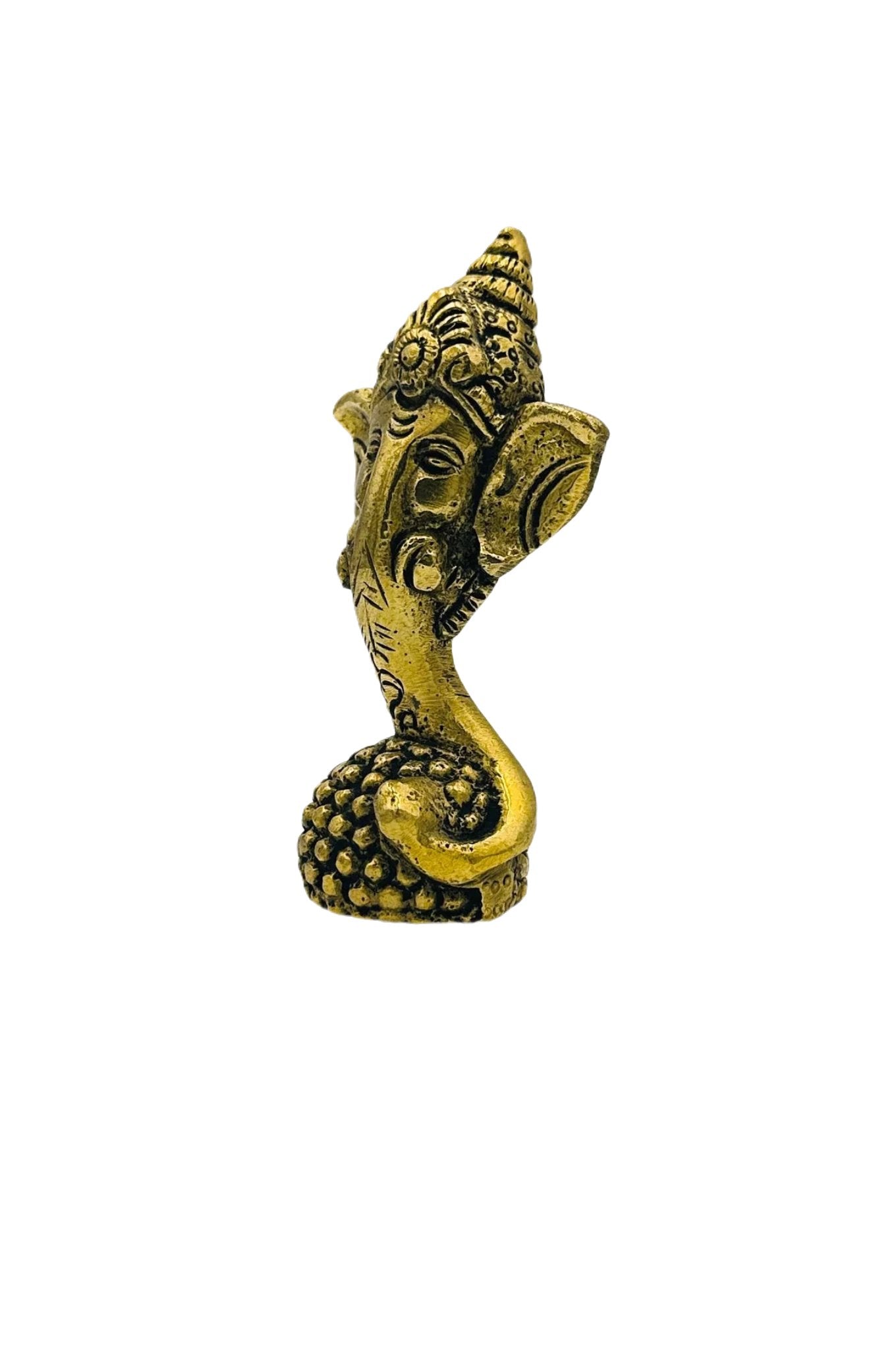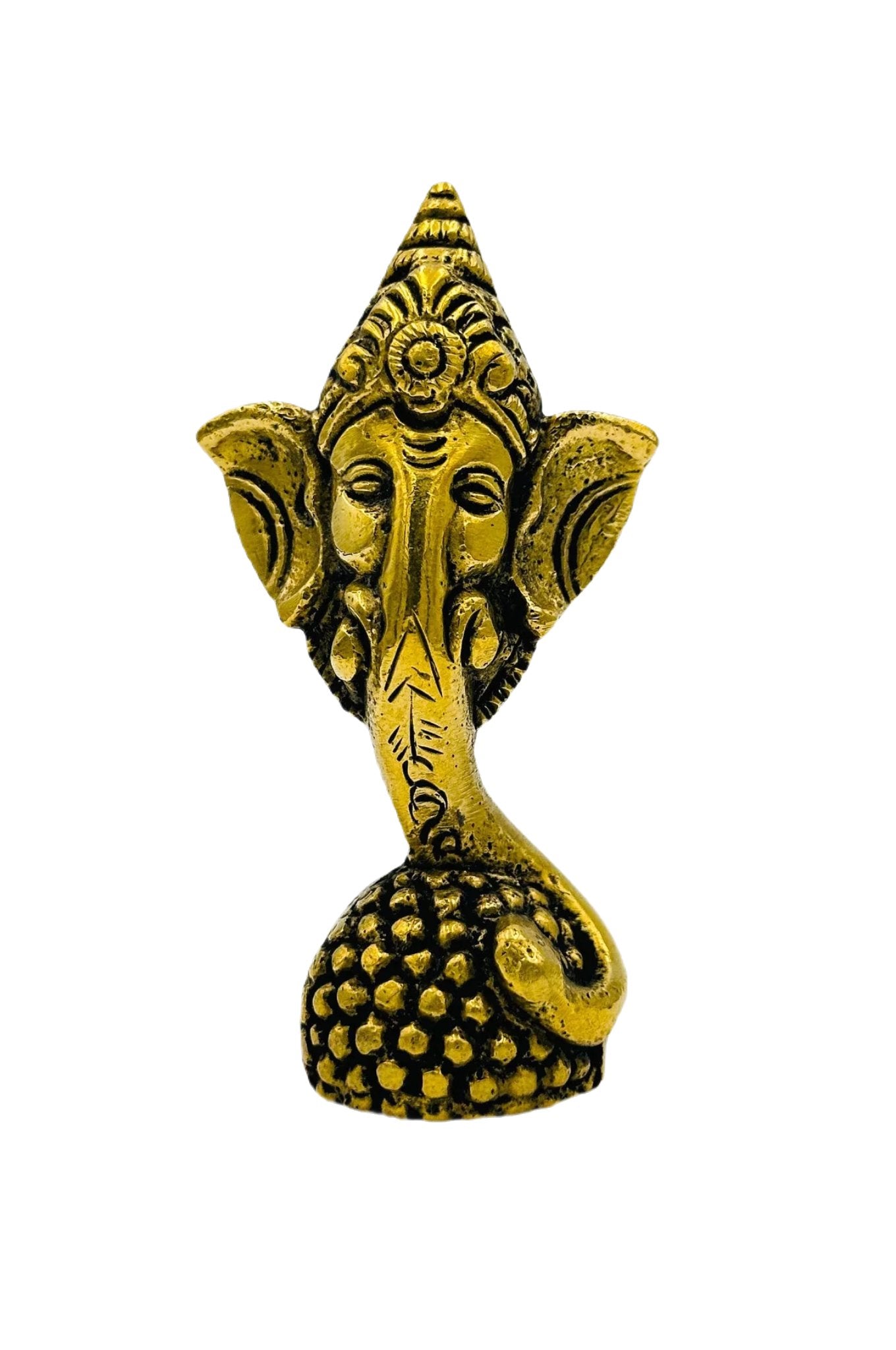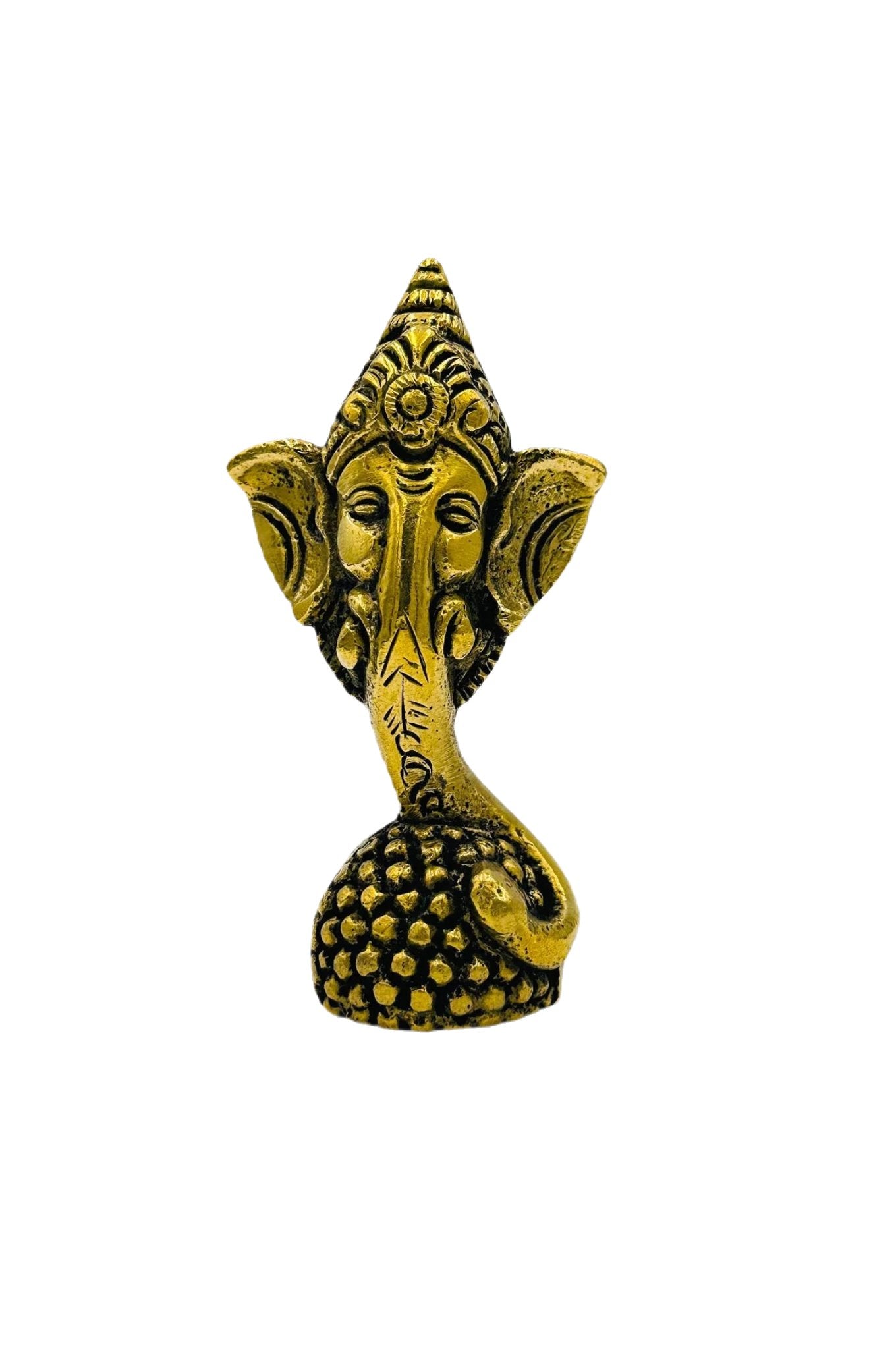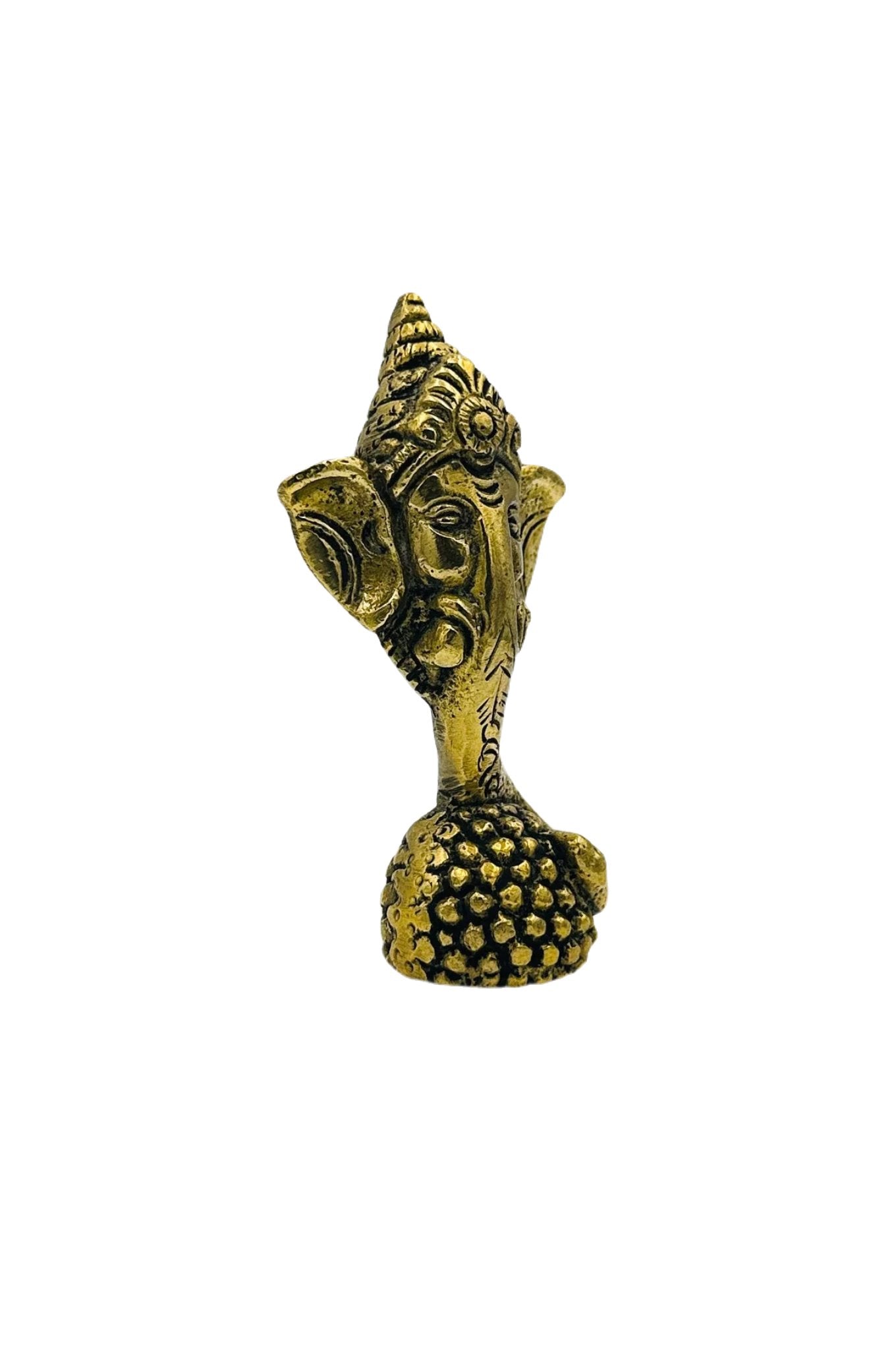 This elegant brass paperweight, featuring Lord Ganesh's face on a laddu, combines spirituality with functionality. Crafted with intricate detail, it radiates a warm, golden glow, perfect for enhancing any desk or as a striking table decor. Symbolizing wisdom and prosperity, it's an ideal gift for special occasions, offering a touch of Indian culture and a blessing of good luck. A practical and artistic piece, it's a beautiful representation of India's rich heritage.