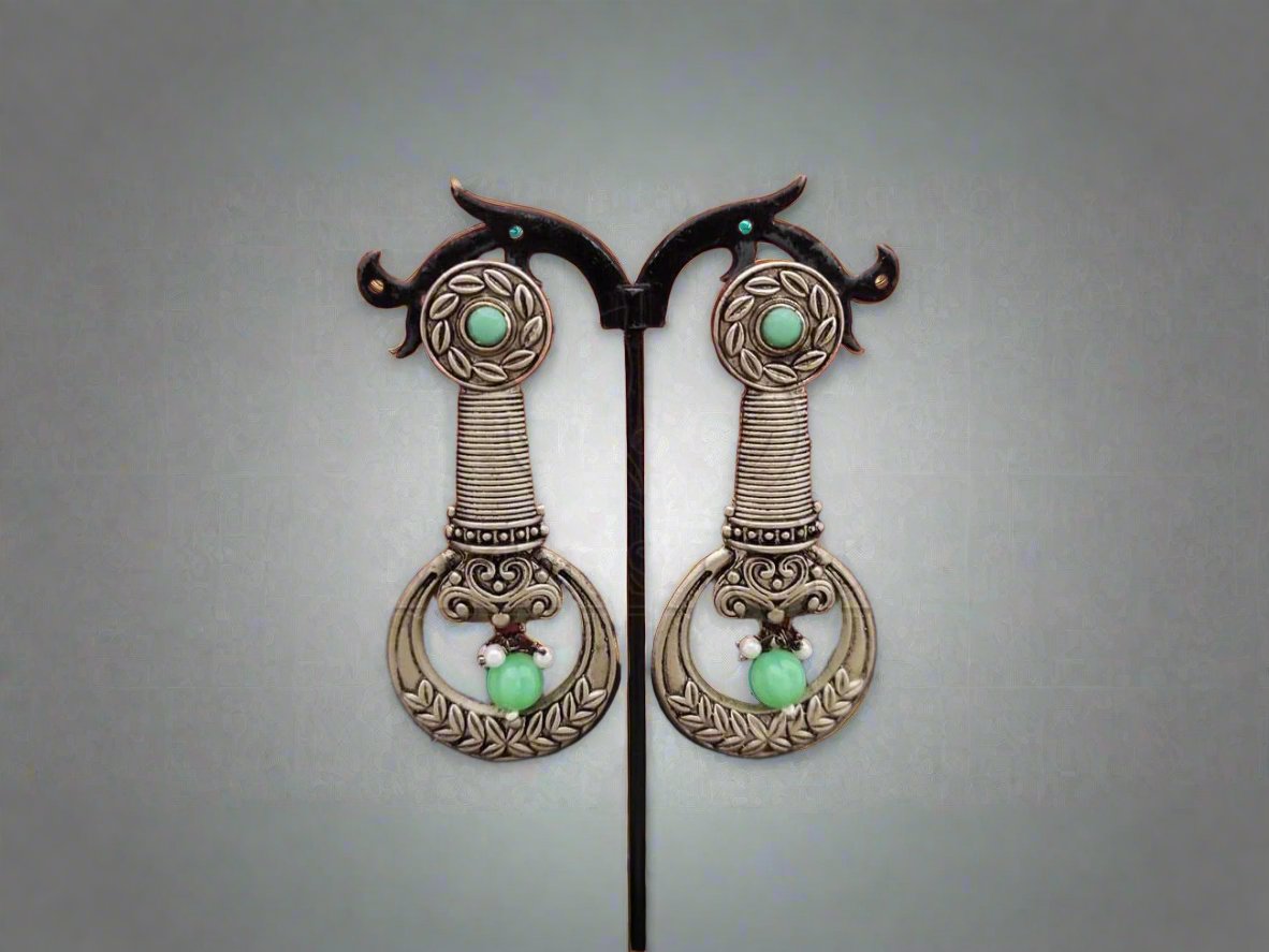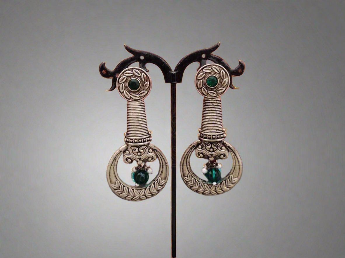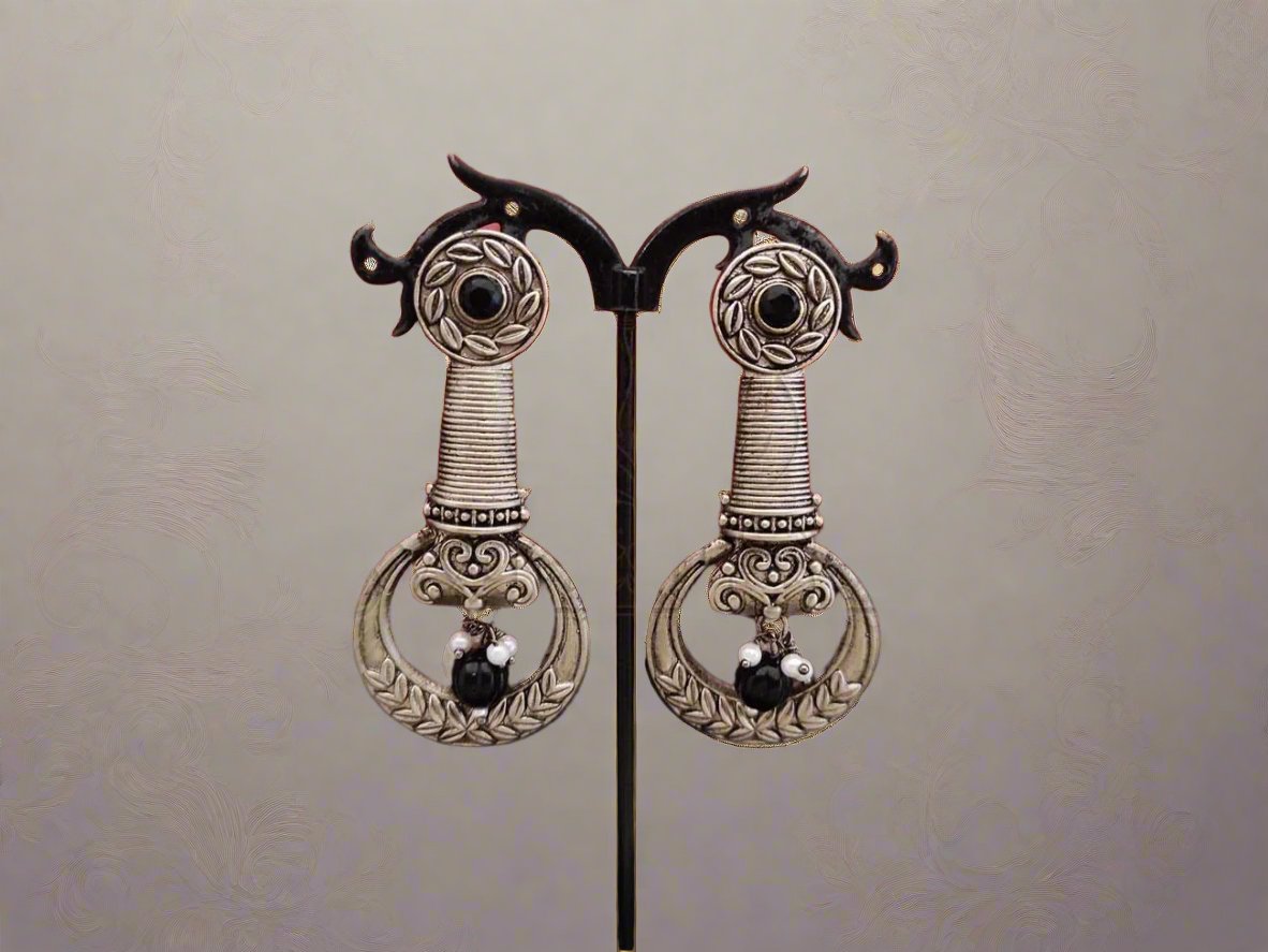 Classic Elegance - Intricately Crafted Oxidised Silver Long Earrings with Beads. - swadeshsouq.com