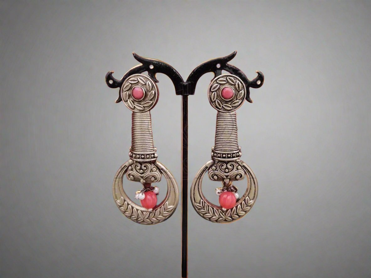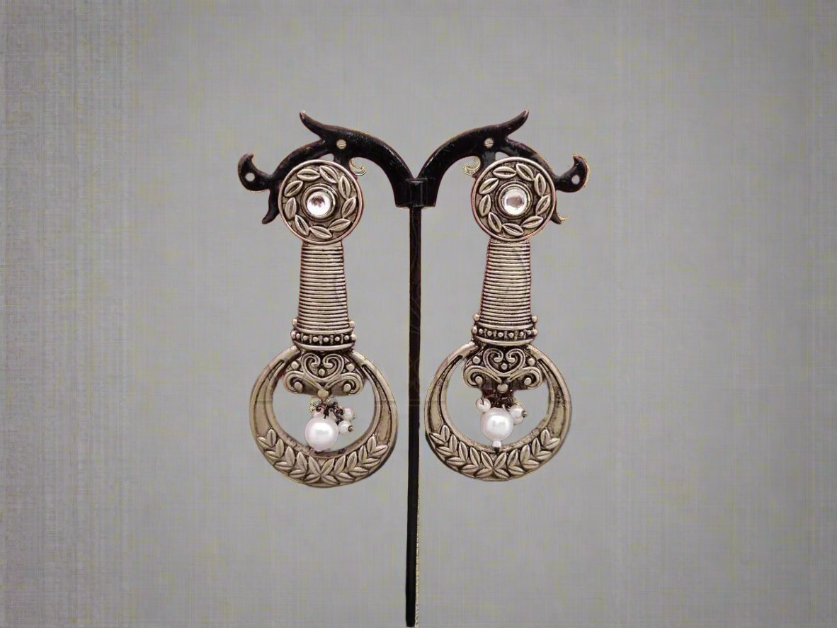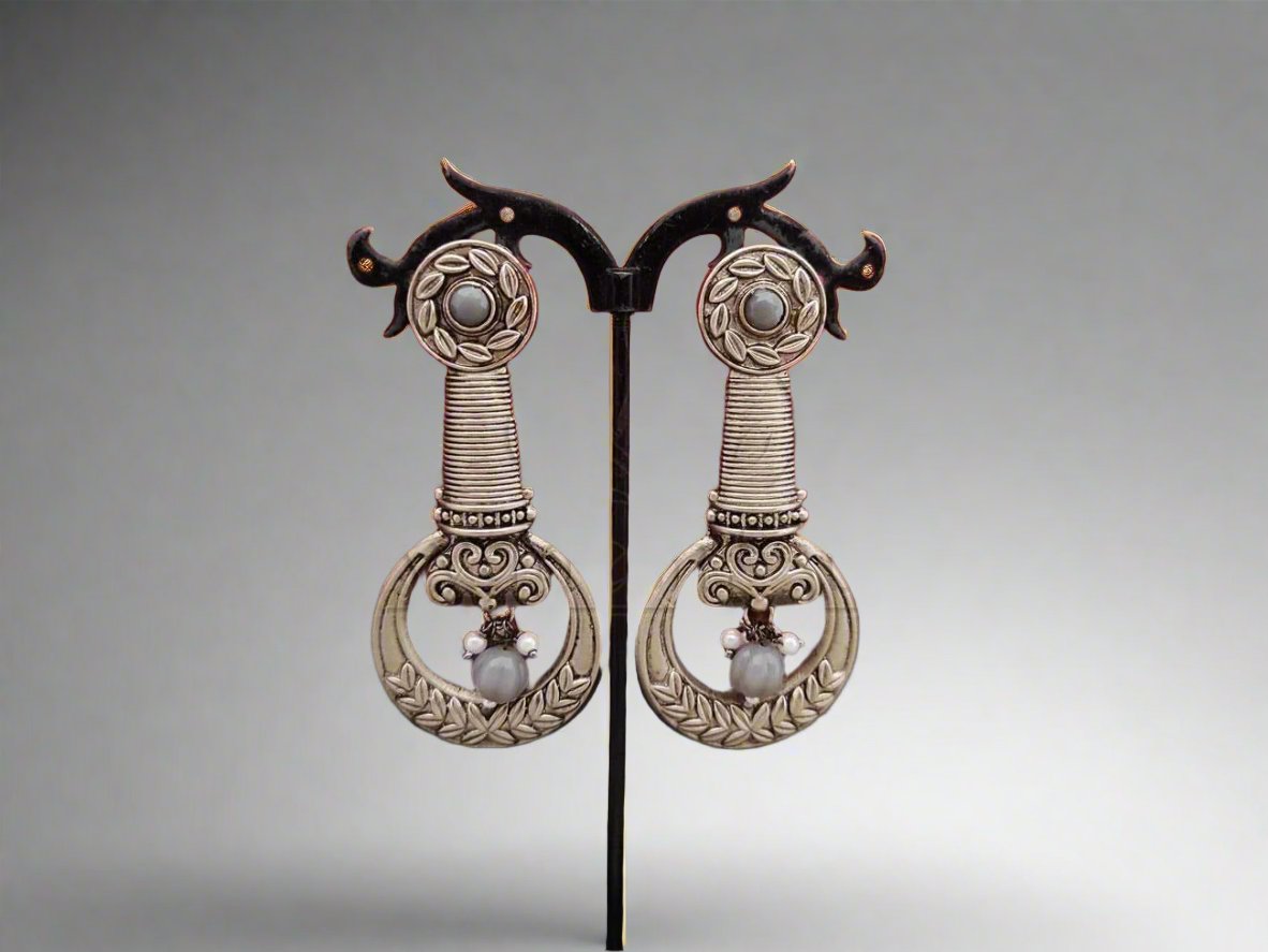 Classic Elegance - Intricately Crafted Oxidised Silver Long Earrings with Beads.