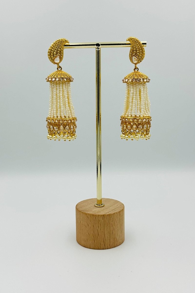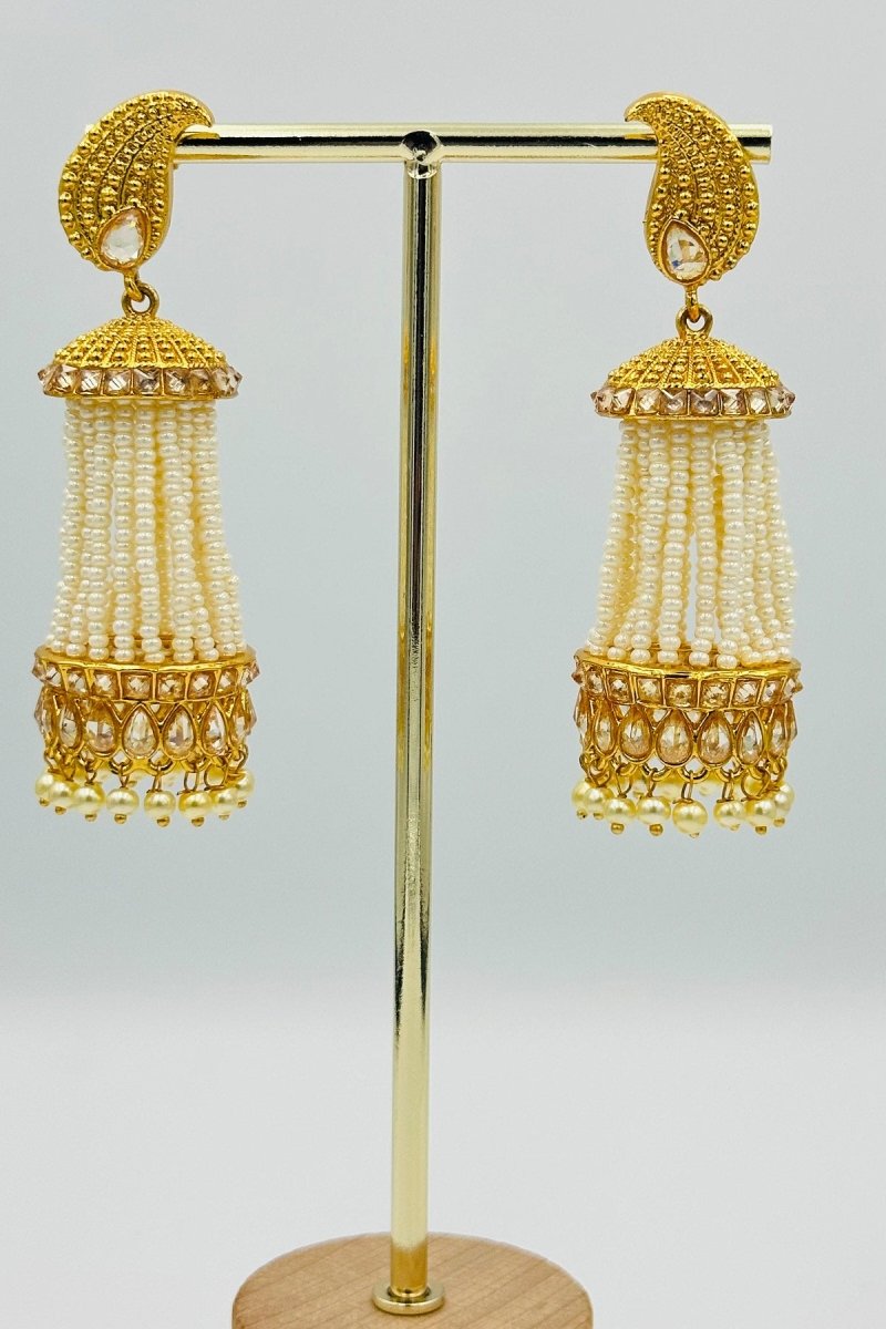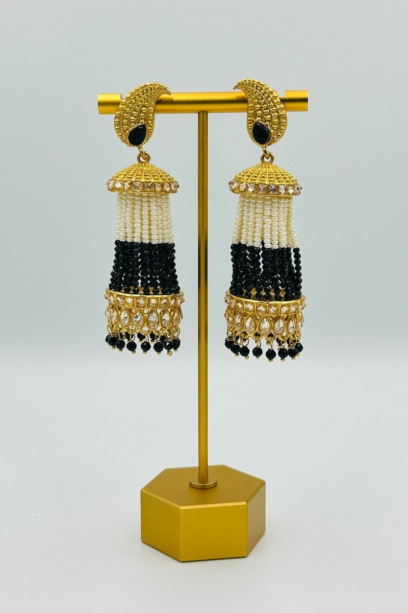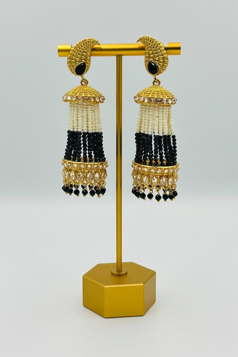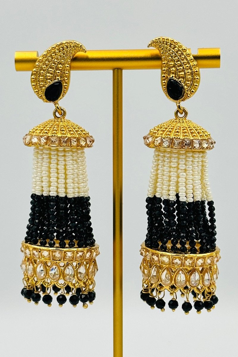 Exude timeless charm with these stunning black and white beaded jhumka earrings. Featuring meticulously handcrafted beadwork and an ornate golden dome top adorned with shimmering embellishments, these earrings are a statement of elegance and sophistication. The unique crescent-shaped golden base with sleek black gemstone accents adds a regal touch, while the dangling beads enhance the overall grace of the design. Perfect for pairing with ethnic wear or elevating a fusion look, these earrings are a versatile addition to your jewelry collection. Lightweight and comfortable, they’re ideal for festive occasions, weddings, or any celebration that calls for a dash of glamour.
