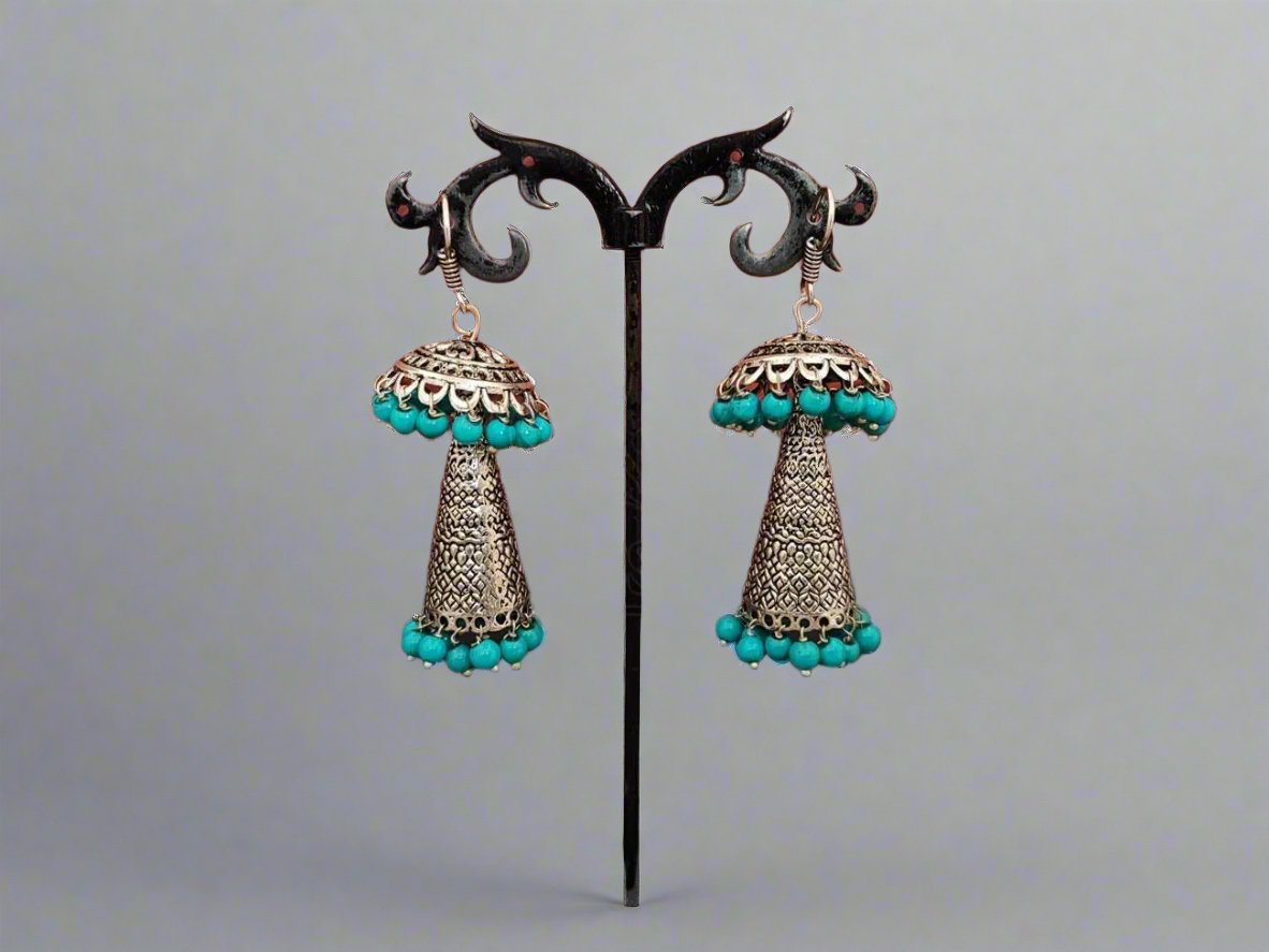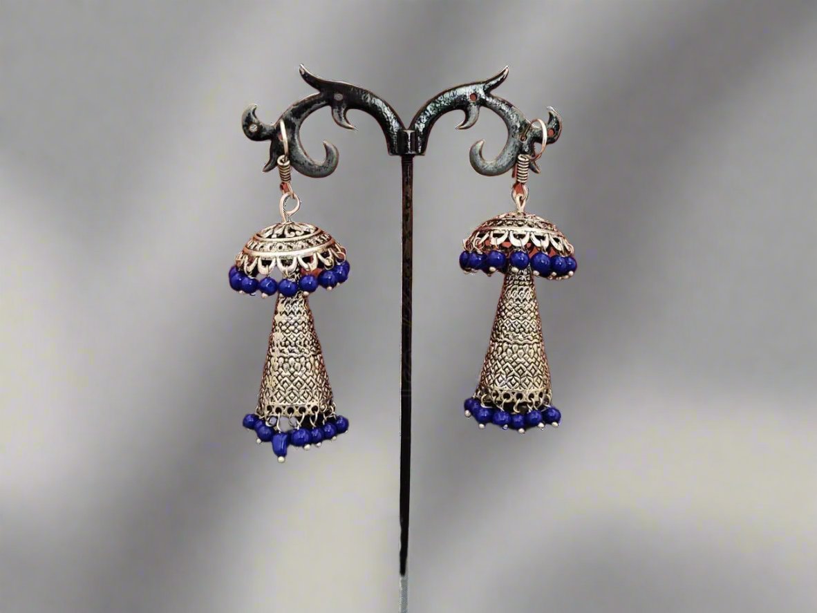 These stunning oxidised silver earrings are a true fashion statement, intricately crafted and beautifully embossed with sparkling beads. The unique design offers a perfect blend of elegance and edginess, making them a perfect addition to any outfit. The lightweight construction ensures comfort, while the secure fastening ensures worry-free wear. Don these beaded oxidised silver earrings and elevate your accessory game like never before.