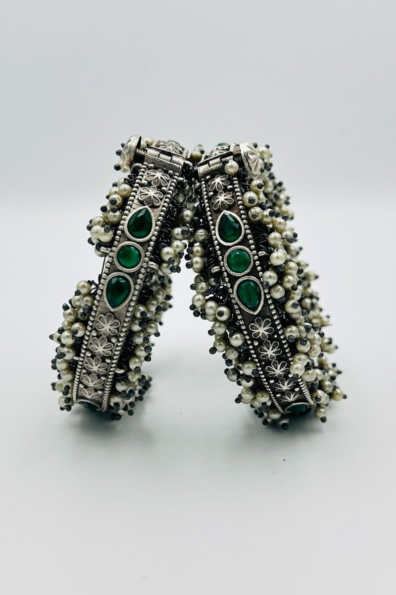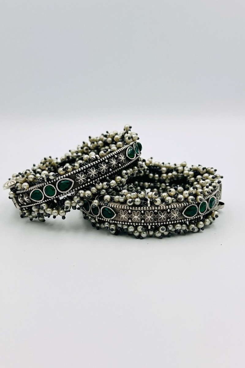 Emerald Elegance: Green Stone and Pearl Silver Bangles - swadeshsouq.com
