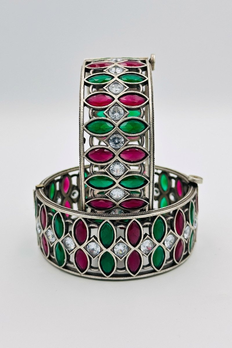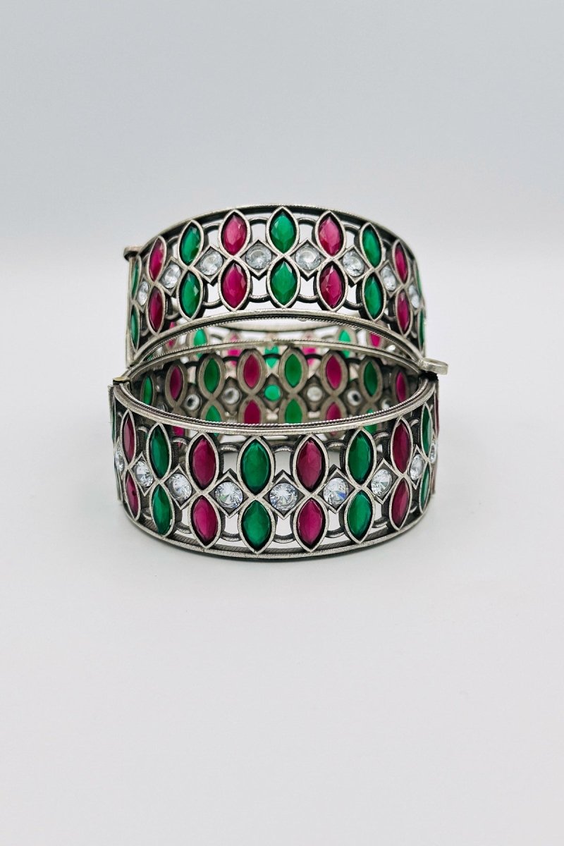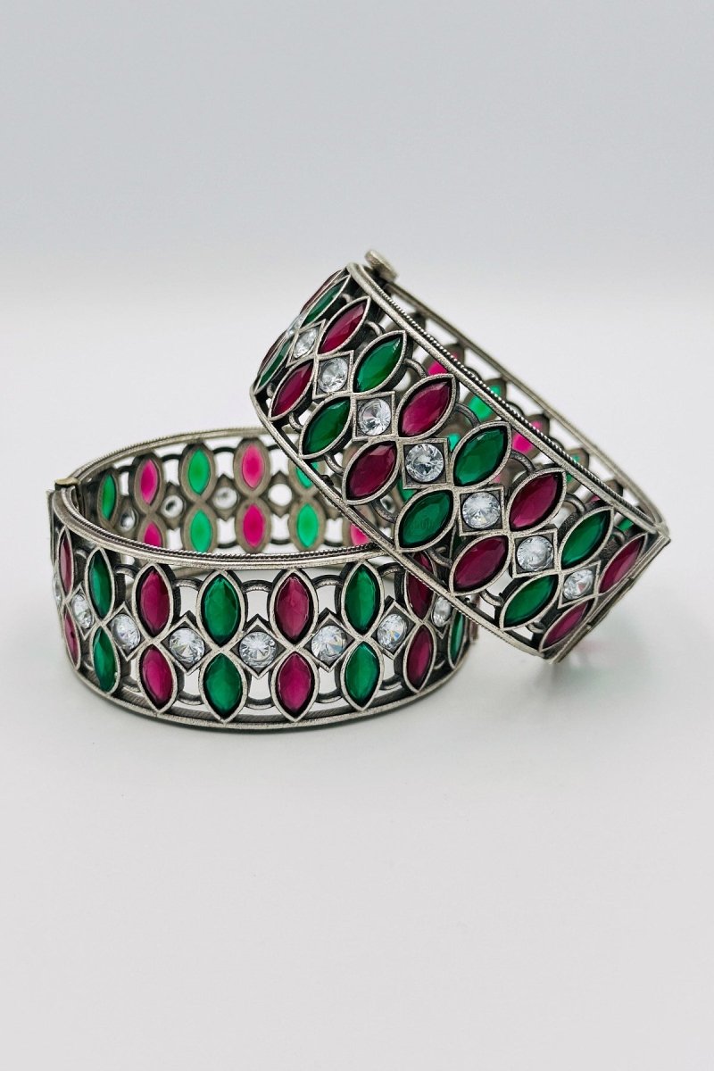 Step into an enchanted garden with our sterling silver bangles, adorned in the refreshing hues of green and delicate pink. Each bangle is meticulously crafted to capture the essence of natural beauty, with intricate designs that evoke the tranquility of a blooming spring garden. Perfect for those who cherish elegance and nature-inspired charm, these bangles are a sophisticated addition to any jewelry collection, reflecting a harmonious blend of artistry and timeless allure.