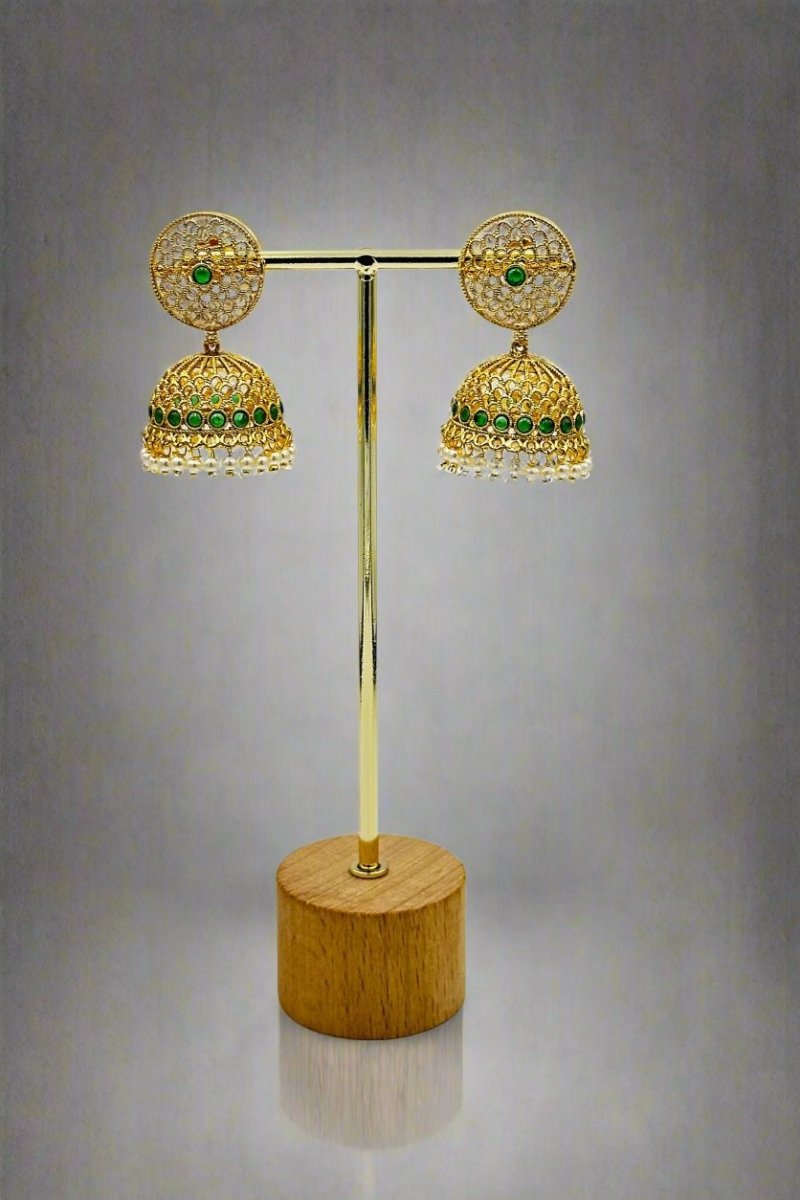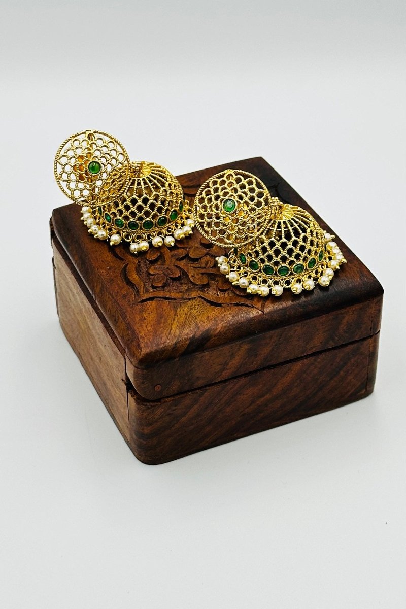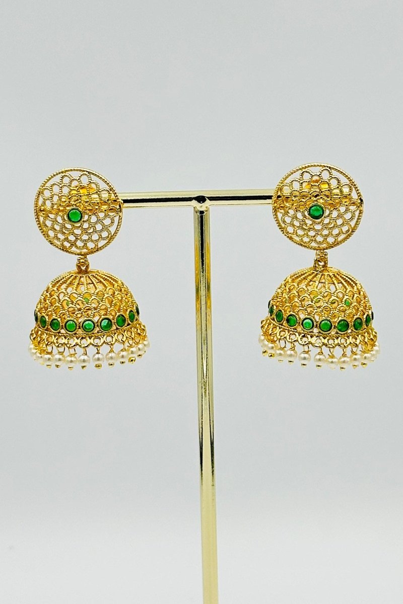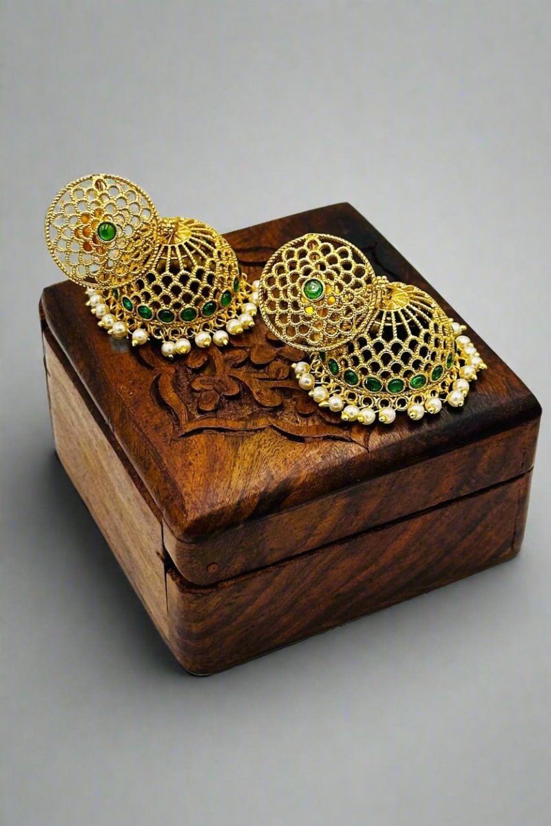 Step into timeless elegance with these gold-toned filigree jhumkas, featuring intricate latticework and vibrant green stone accents. The beautifully crafted dome is adorned with a delicate row of green stones and finished with dangling pearls, adding a graceful touch to every movement.