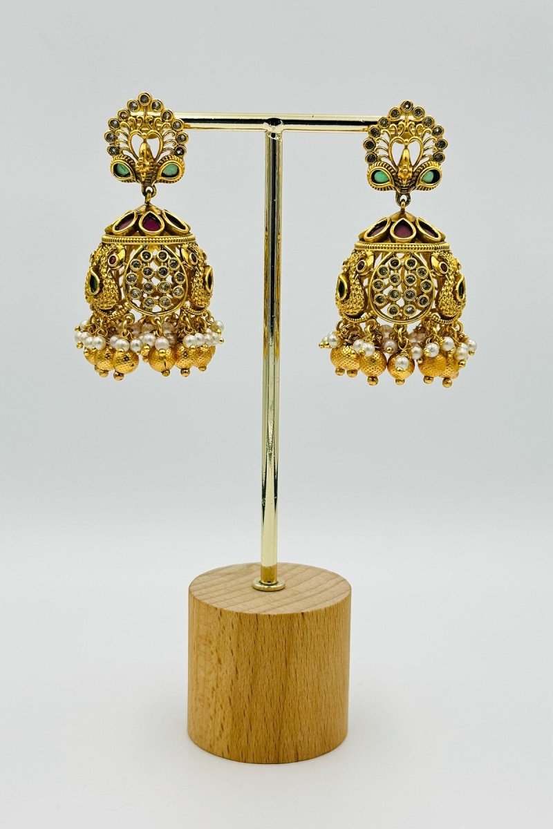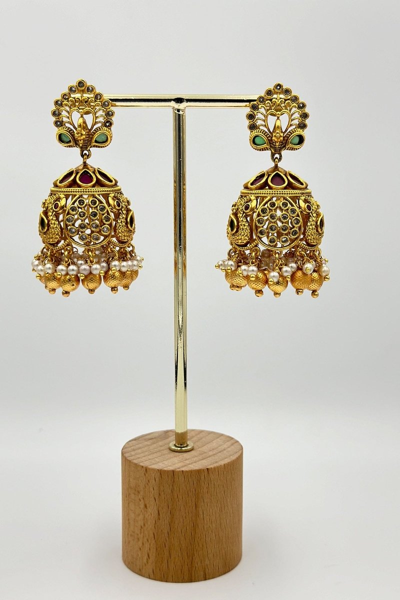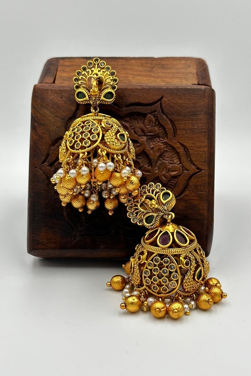 Grand Peacock Design Jhumka Earrings with Gold Detailing and Pearl Drops - swadeshsouq.com