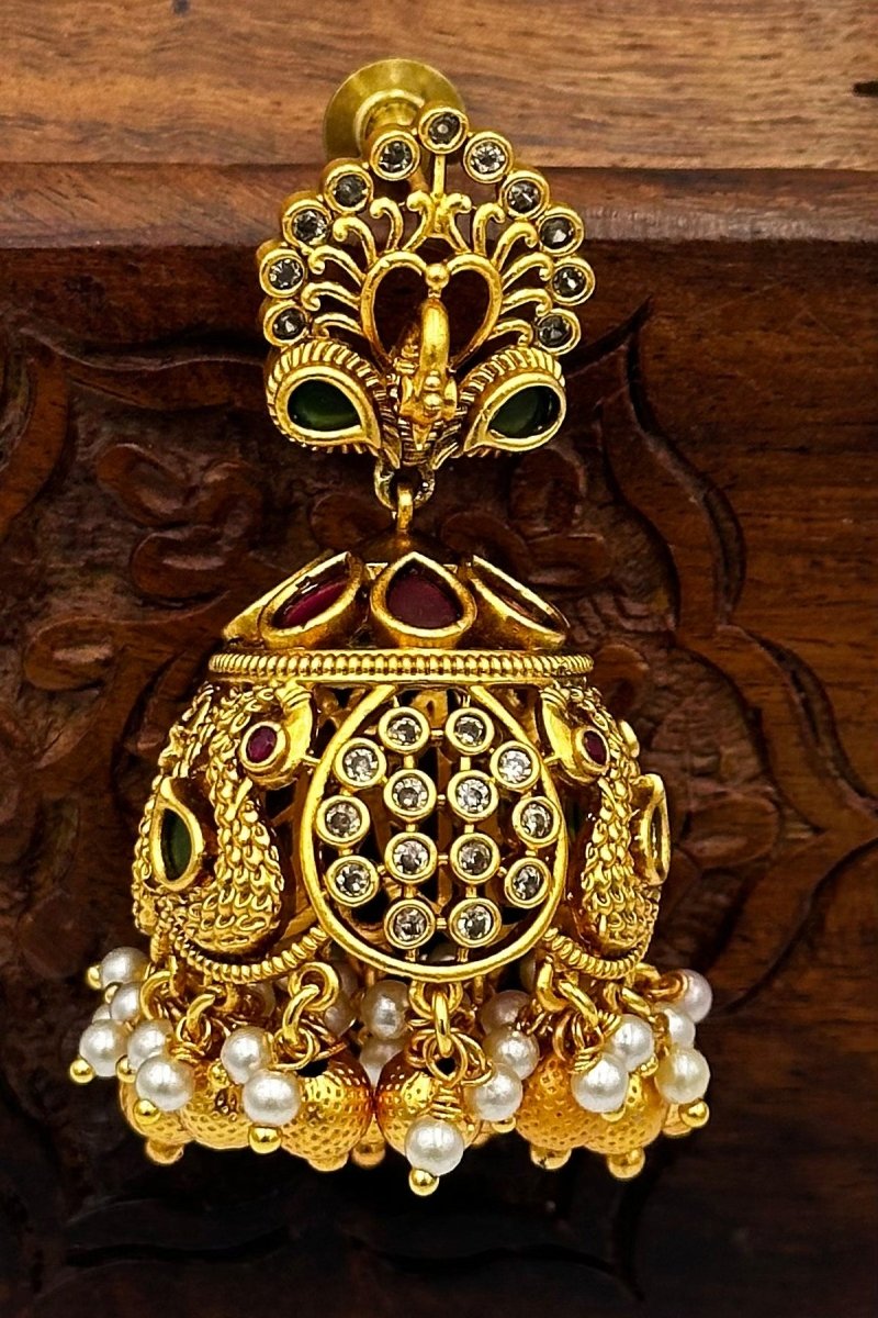 Grand Peacock Design Jhumka Earrings with Gold Detailing and Pearl Drops