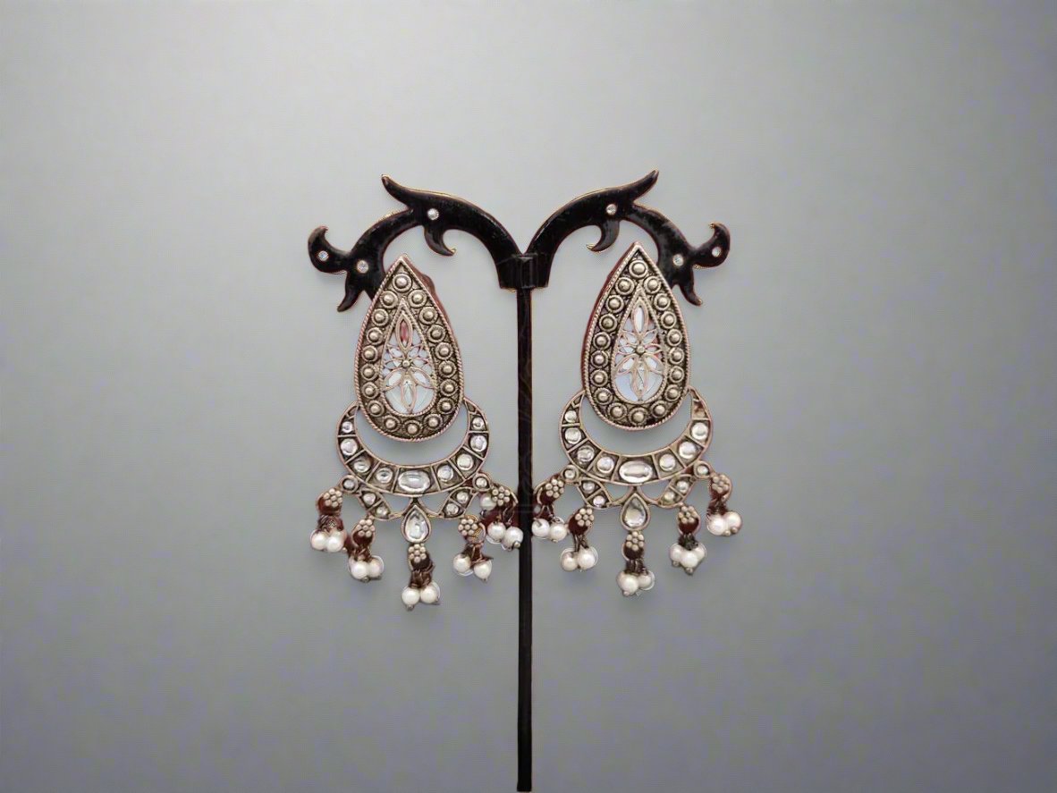 These stunning oxidised silver earrings feature an intricate design that showcases expert craftsmanship and attention to detail. The dark finish of the oxidised silver creates a sense of mystery and sophistication, while the intricate design adds a touch of elegance and modernity.
